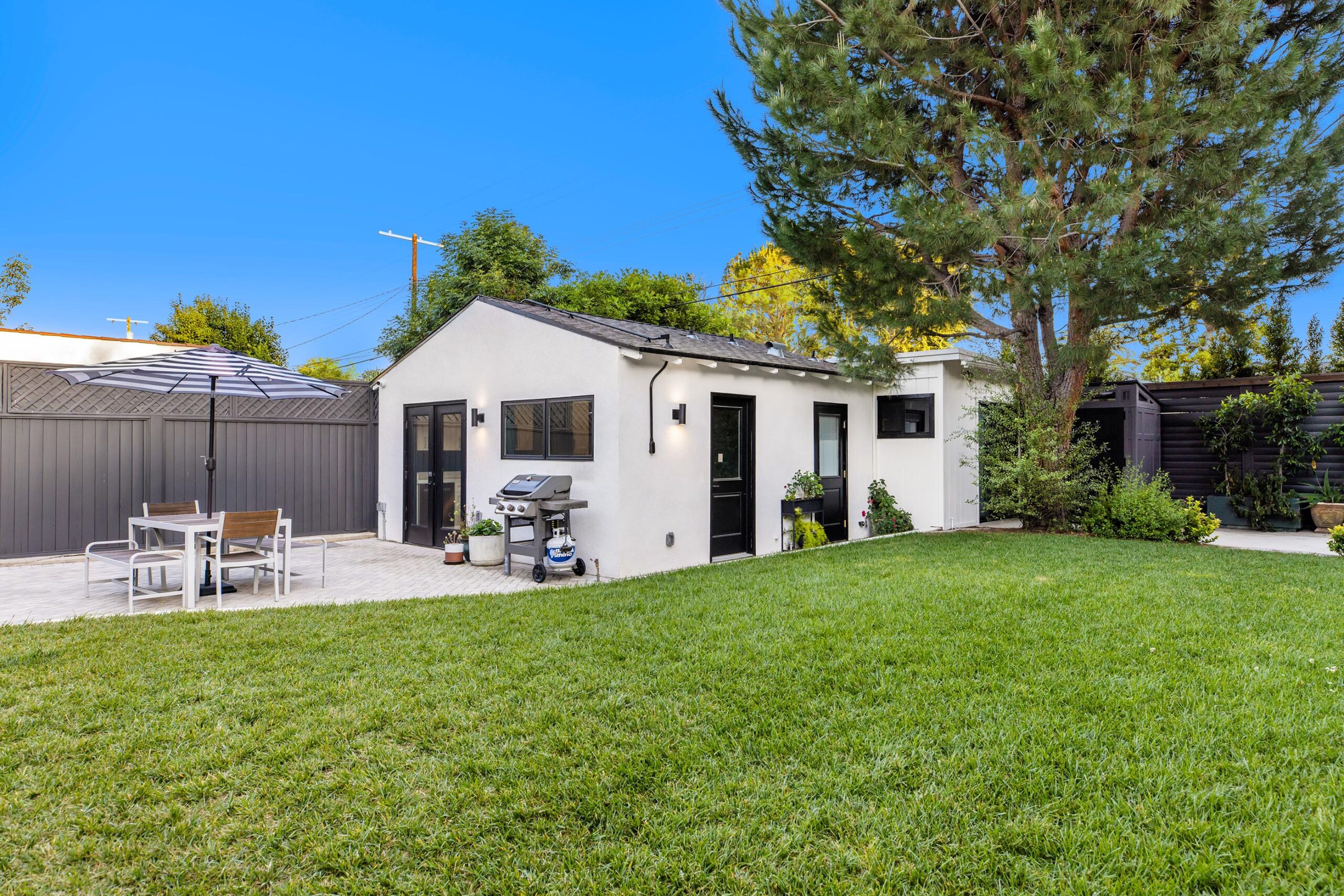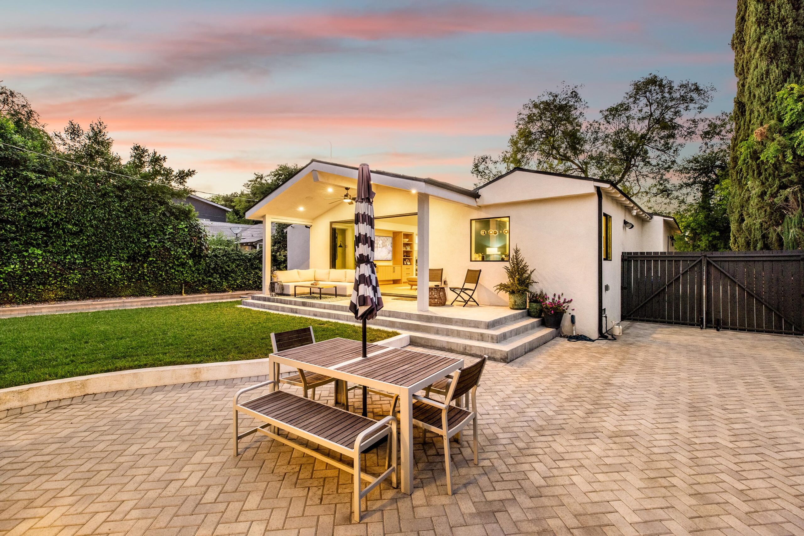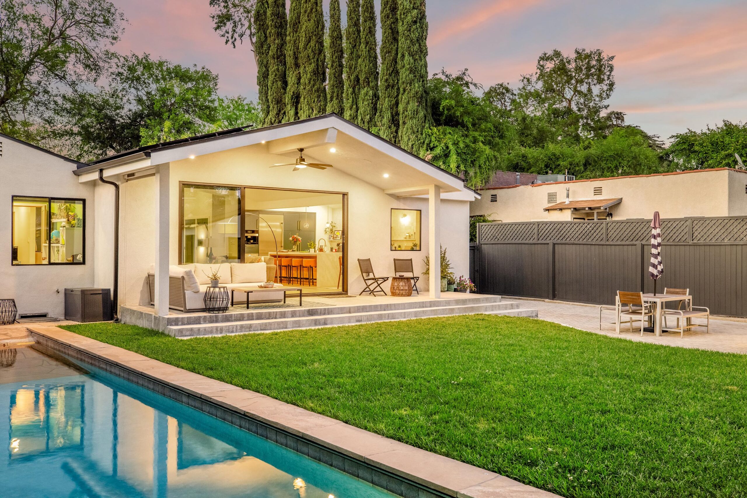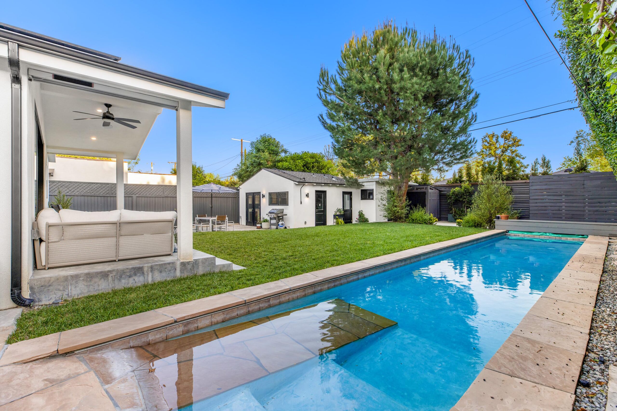 Step into this meticulously remodeled home in Valley Village showcasing luxury, sophistication, and timeless character. Spanning 3BD/3.5BA plus a fully permitted ADU, every finish has been thoughtfully curated from rich Zia tile featured in each ensuite bath to integrated smart home features throughout. Upon entry, warm engineered wood floors, high ceilings, and striking accent walls create an inviting first impression. The stunning chef’s kitchen is outfitted with a huge center island, Thermador appliances, a built-in Miele coffee system, dolomite countertops, and a sleek backsplash crafted from handcrafted Clé tile. The living room has custom built-ins and expansive Western sliding doors open to the backyard, creating the perfect indoor-outdoor lifestyle. A stylish powder room just off the kitchen is ideal for guests. Down the hall, the primary suite features soaring ceilings, a walk-in closet, and a luxurious ensuite bath complete with a spacious shower with bench, dual vanity, durable slate tile flooring, and private water closet. Each secondary bedroom offers sliding closet space and its own ensuite bath featuring custom carpentry vanities. Outside, the backyard is designed for year-round entertaining with a heated and filtered pool, a large private lawn, covered patio, and multiple lounge areas. The fully detached ADU includes a kitchenette with stainless steel appliances, waterproof LVP flooring, and a well-appointed bathroom with a step-in shower, ideal for guests, extended family, or rental income. Additionally behind the ADU you’ll find a bonus room that’s perfect for a home office, gym, or storage room. The home also includes a laundry room with side-by-side washer and dryer, surround sound both indoors and outdoors, a four-camera hardwired security system, and value-enhancing and money-saving solar energy system. Conveniently located near the award-winning Colfax Charter Elementary school, Valley Village Park, and some of the valley’s best dining and shopping, this reimagined home offers elevated living with exceptional convenience.
