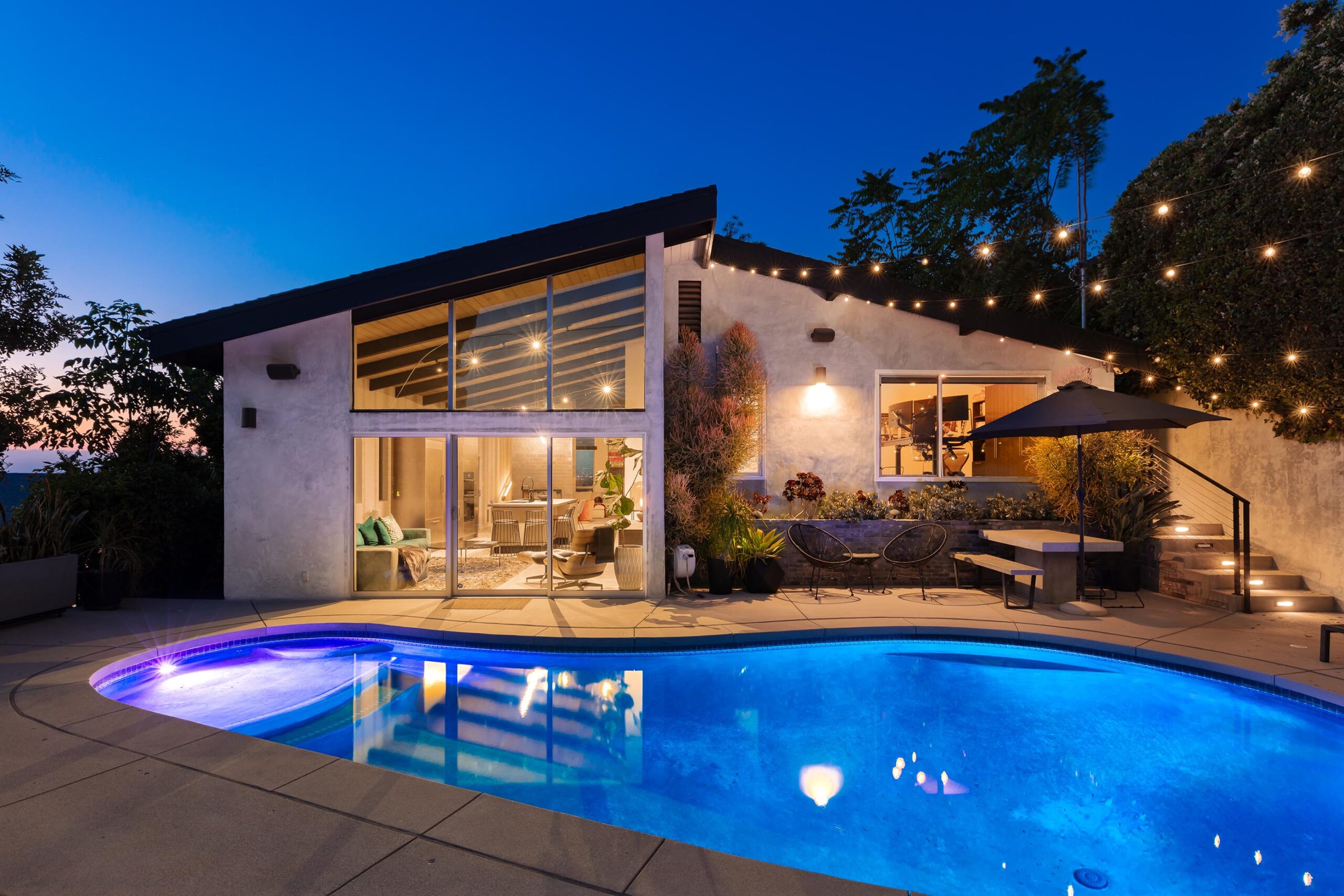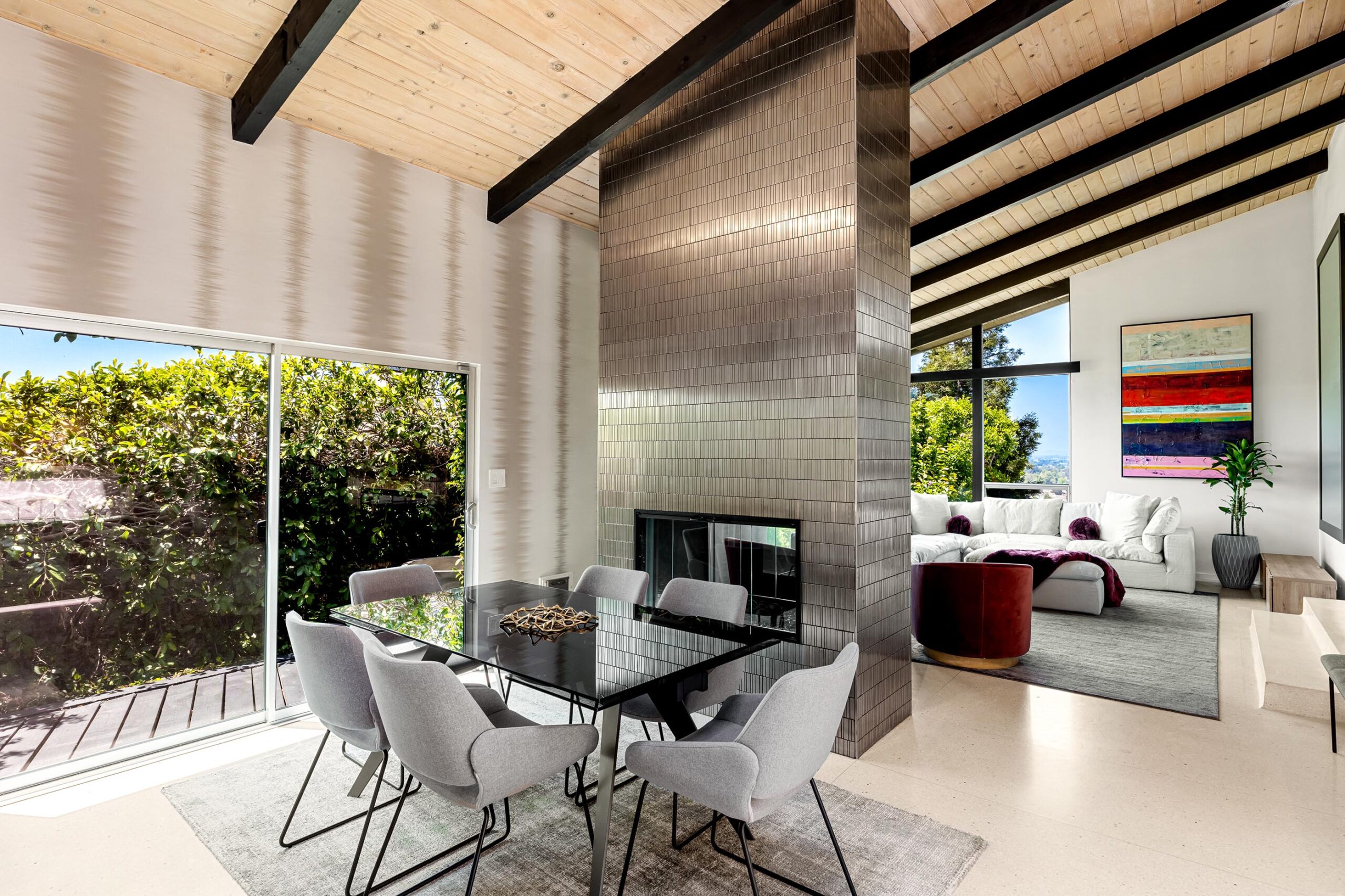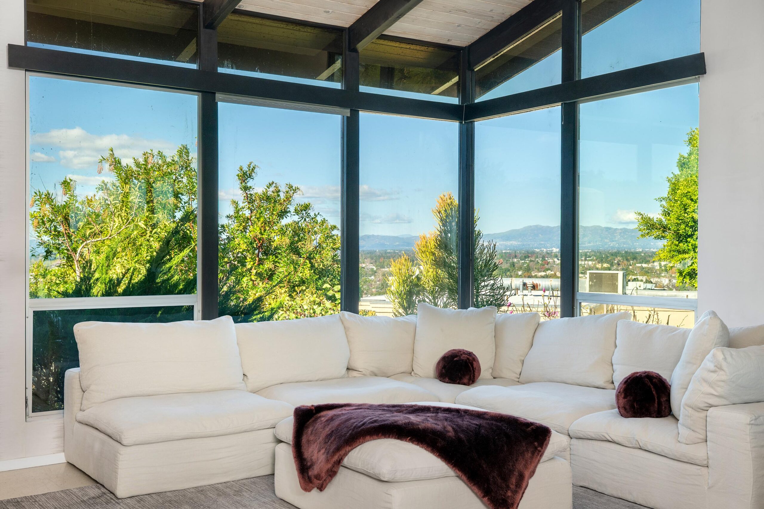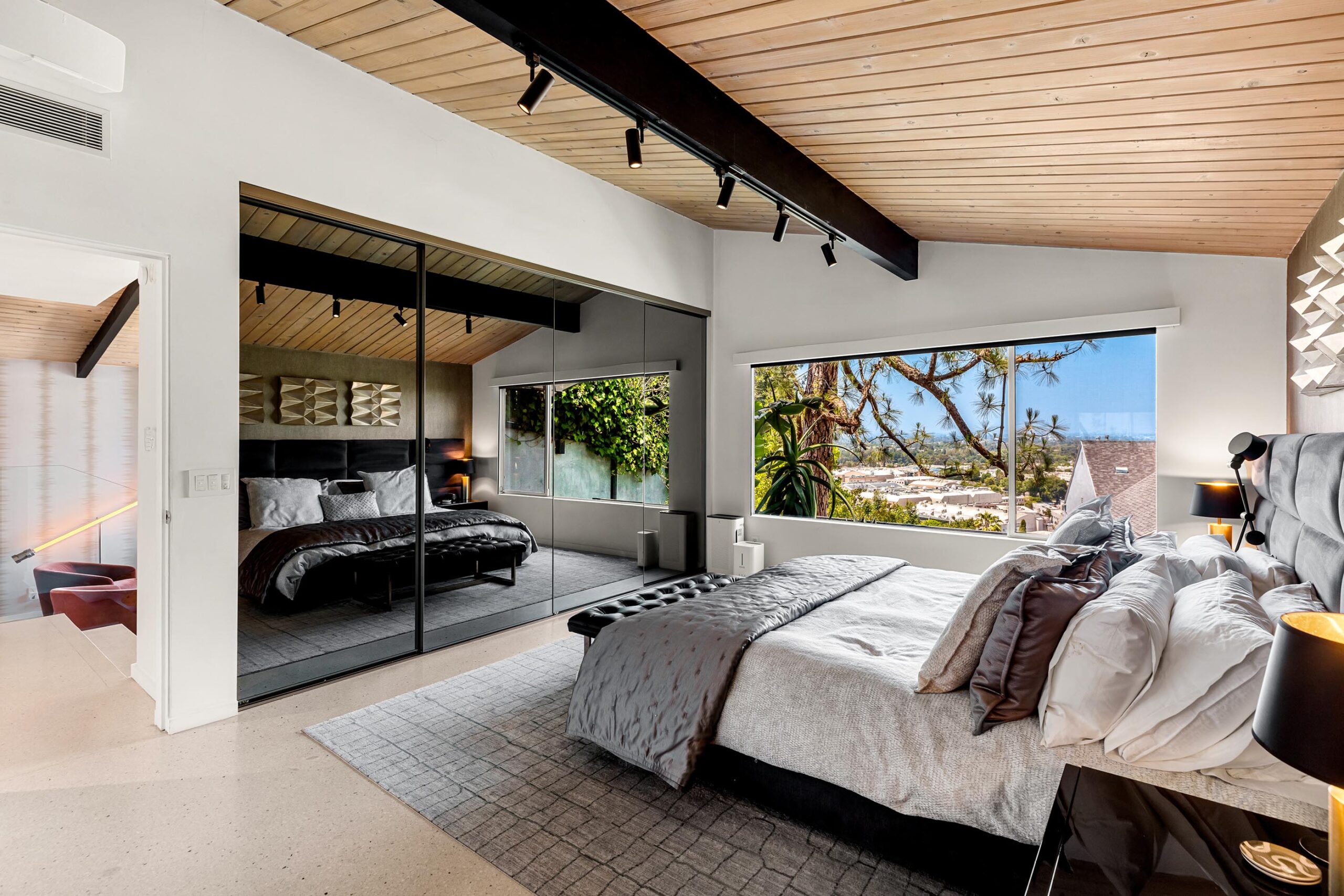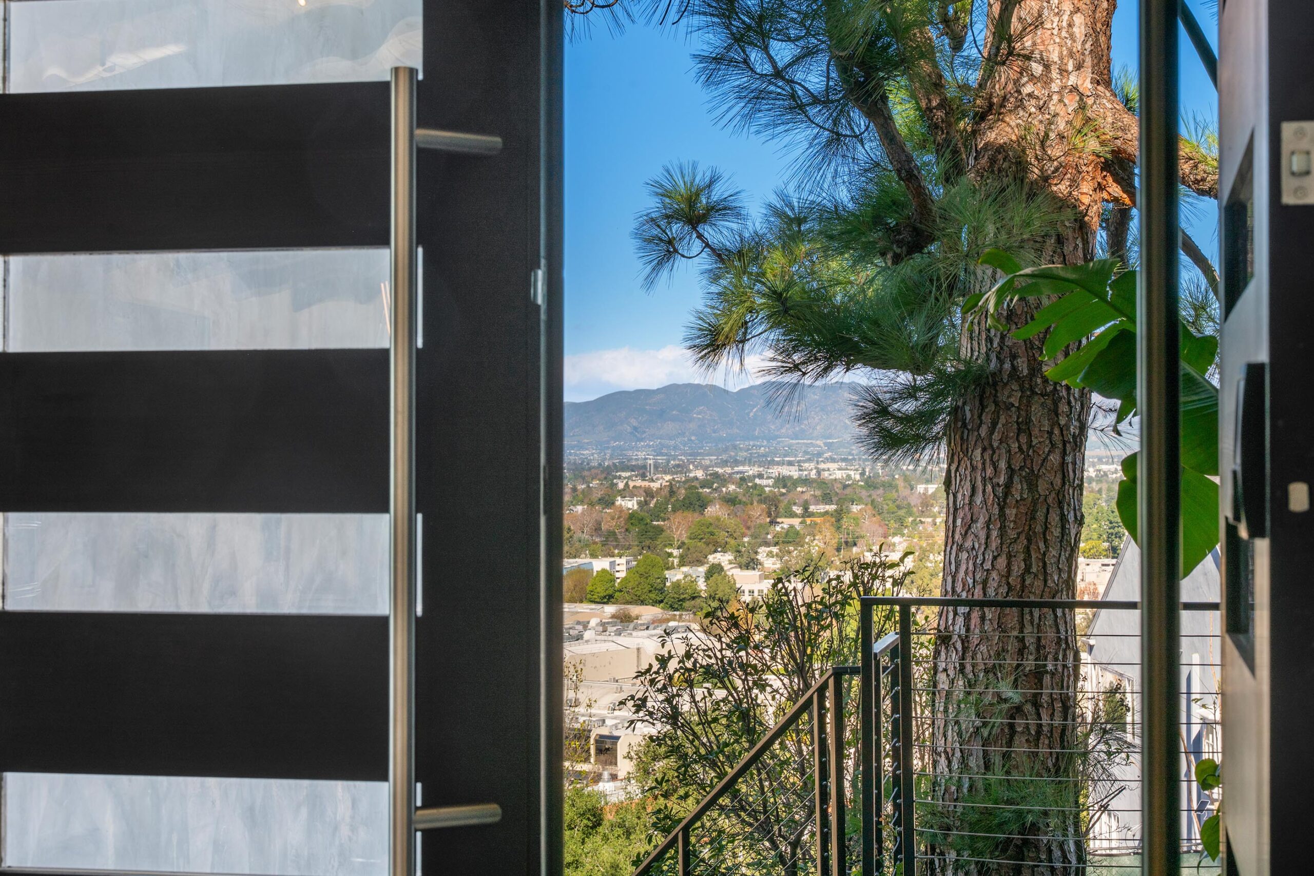Introducing a mid-century modern residence nestled in the hills above Studio City, offering breathtaking vistas of the mountains and valley. This home is expertly crafted to provide the ultimate luxury living experience. Enter through the grand double door entry to find an open-concept floor plan with natural light pouring in from every angle.Custom poured terrazzo floors and 19-foot exposed beam ceilings add to the home's charm. The living room, with its floor-to-ceiling windows, perfectly frames the incredible views. The spacious dining room featuring a dual-sided fireplace, is ideal for gatherings of friends and family. The custom Pedini kitchen is a chef's dream, complete with high-end Jenn-Air appliances and a large quartz center island, seamlessly connecting to the family room, which also features floor-to-ceiling windows and a sliding door leading to the backyard patio perfect for al fresco dining. The primary suite is a true masterpiece, featuring an oversized picture window, a TV that disappears into the ceiling, blackout blinds, a custom closet, and a spa-like bath with a steam shower, stone soaking tub, and a Toto smart toilet. The two additional bedrooms also have true blackout blinds within-wall channels for complete darkness, custom closets, and share the second full bathroom. The entertainer's backyard is outfitted with a heated salt-water pool, jacuzzi, and fire pit, all while offering captivating views. Designed with integrated smart home technology, the residence includes a Lutron Caseta voice-controlled lighting system, Sonos sound system, Ring security system, whole-home Pelican water softening system, and a fully owned solar energy system for value enhancement and cost savings. Situated just moments from all the dining and shopping along Ventura Blvd and located in the esteemed Carpenter Elementary school district, this home offers a lifestyle you've always dreamed of. Don't miss the opportunity to make it yours.