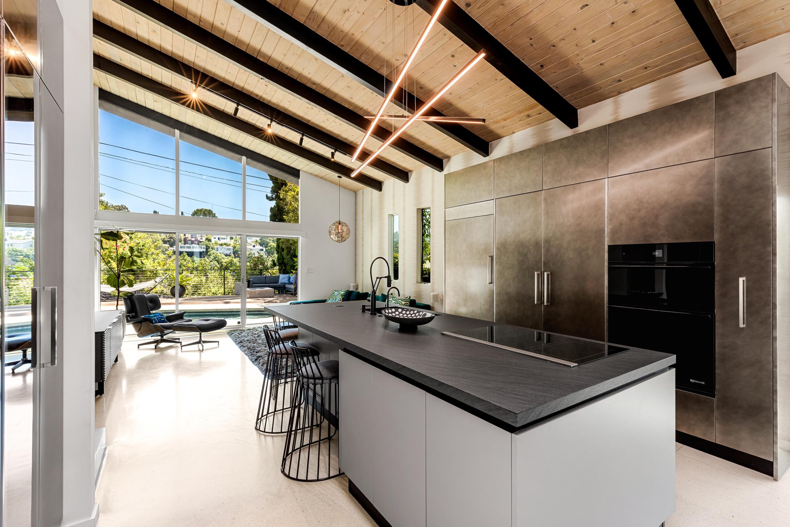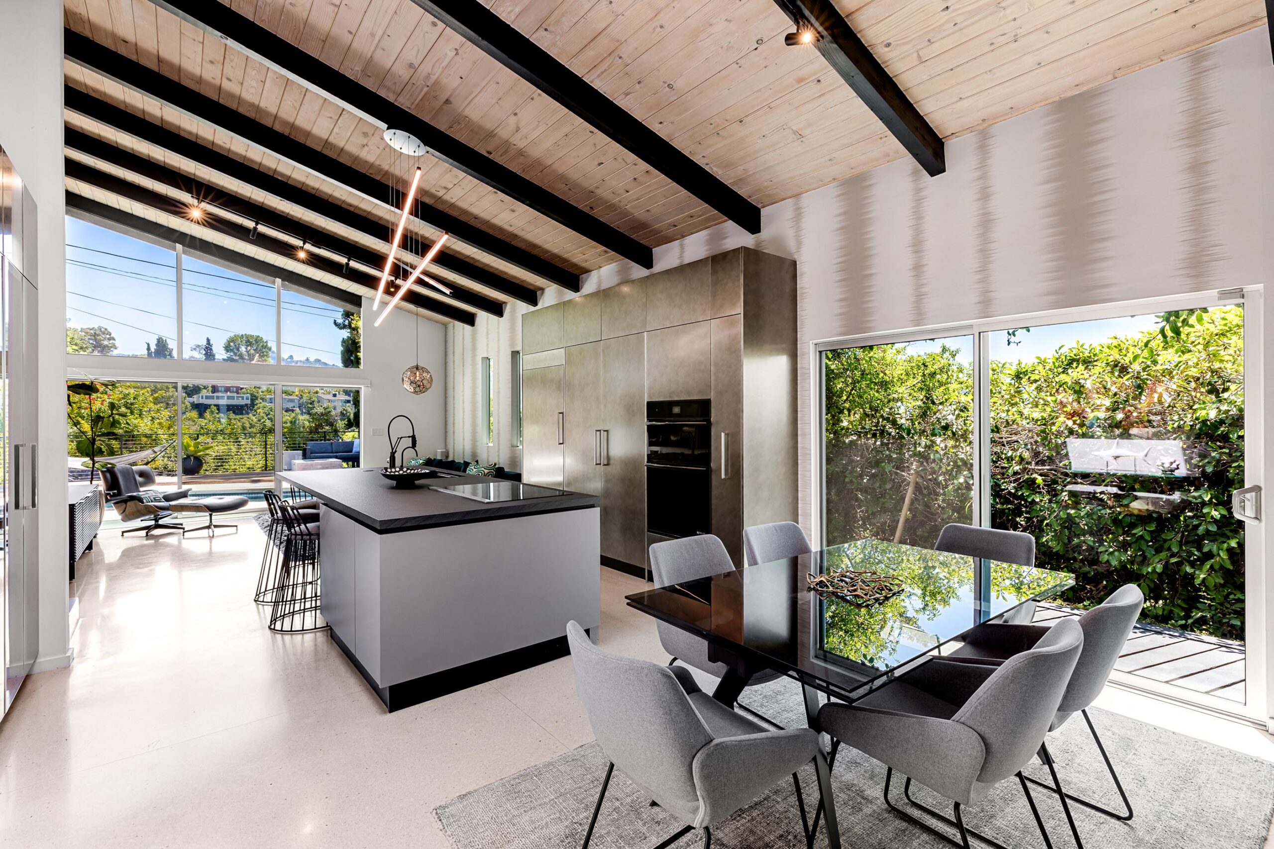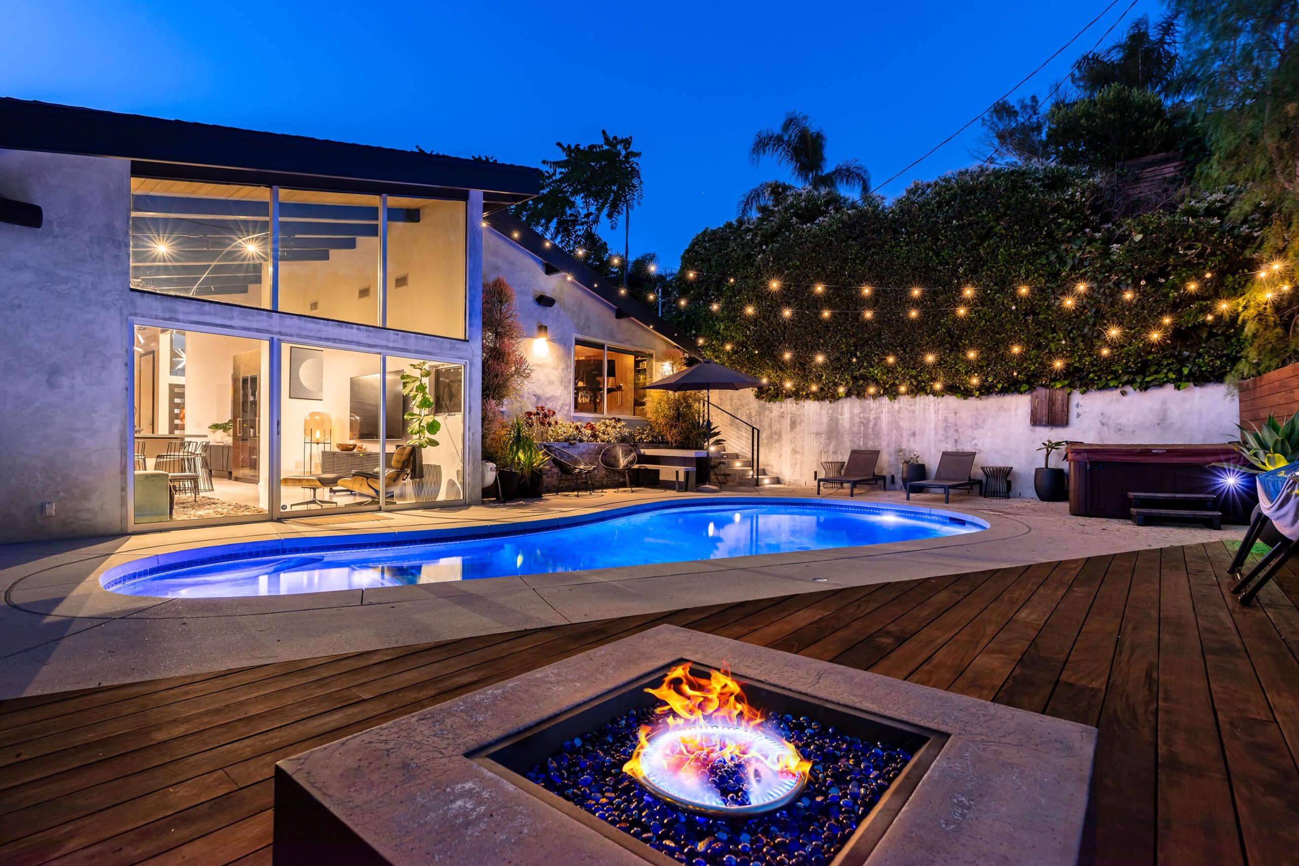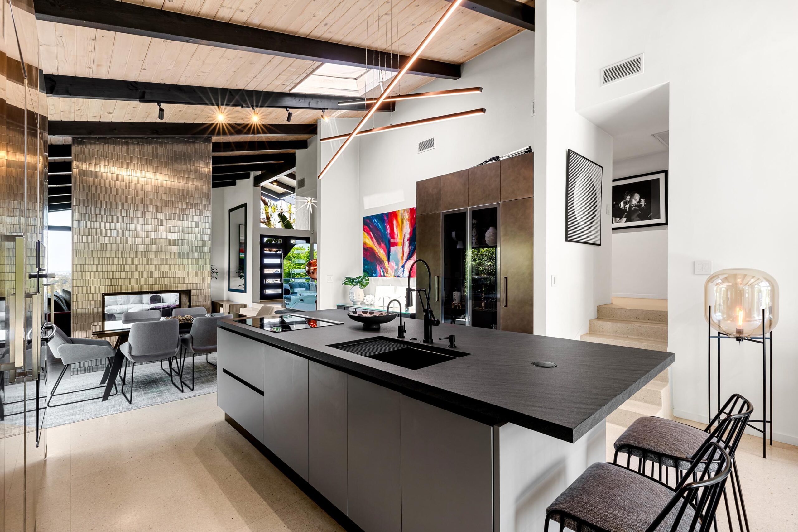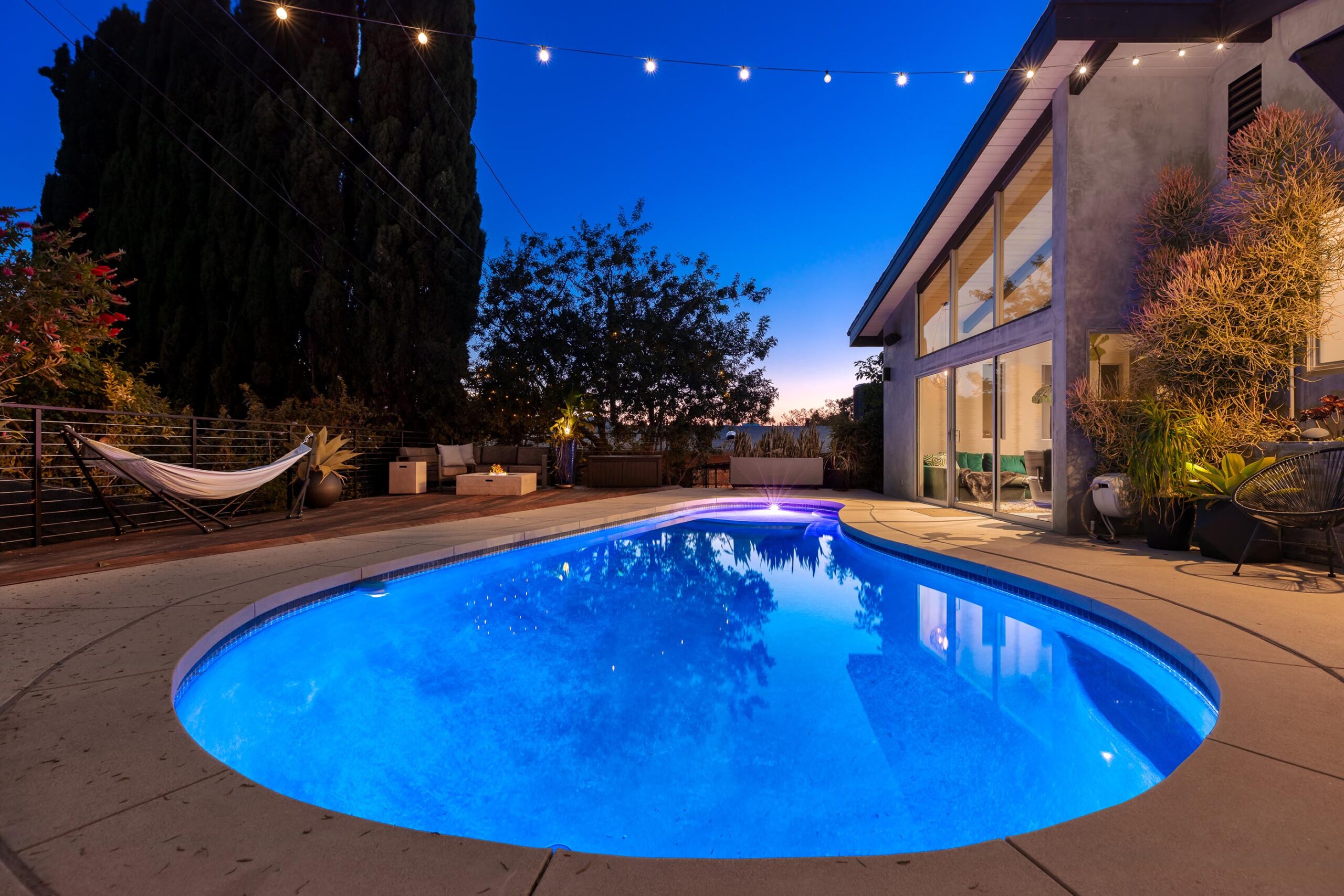 Introducing a mid-century modern residence nestled in the hills above Studio City, offering breathtaking vistas of the mountains and valley. This home is expertly crafted to provide the ultimate luxury living experience. Enter through the grand double door entry to find an open-concept floor plan with natural light pouring in from every angle.Custom poured terrazzo floors and 19-foot exposed beam ceilings add to the home's charm. The living room, with its floor-to-ceiling windows, perfectly frames the incredible views. The spacious dining room featuring a dual-sided fireplace, is ideal for gatherings of friends and family. The custom Pedini kitchen is a chef's dream, complete with high-end Jenn-Air appliances and a large quartz center island, seamlessly connecting to the family room, which also features floor-to-ceiling windows and a sliding door leading to the backyard patio perfect for al fresco dining. The primary suite is a true masterpiece, featuring an oversized picture window, a TV that disappears into the ceiling, blackout blinds, a custom closet, and a spa-like bath with a steam shower, stone soaking tub, and a Toto smart toilet. The two additional bedrooms also have true blackout blinds within-wall channels for complete darkness, custom closets, and share the second full bathroom. The entertainer's backyard is outfitted with a heated salt-water pool, jacuzzi, and fire pit, all while offering captivating views. Designed with integrated smart home technology, the residence includes a Lutron Caseta voice-controlled lighting system, Sonos sound system, Ring security system, whole-home Pelican water softening system, and a fully owned solar energy system for value enhancement and cost savings. Situated just moments from all the dining and shopping along Ventura Blvd and located in the esteemed Carpenter Elementary school district, this home offers a lifestyle you've always dreamed of. Don't miss the opportunity to make it yours.