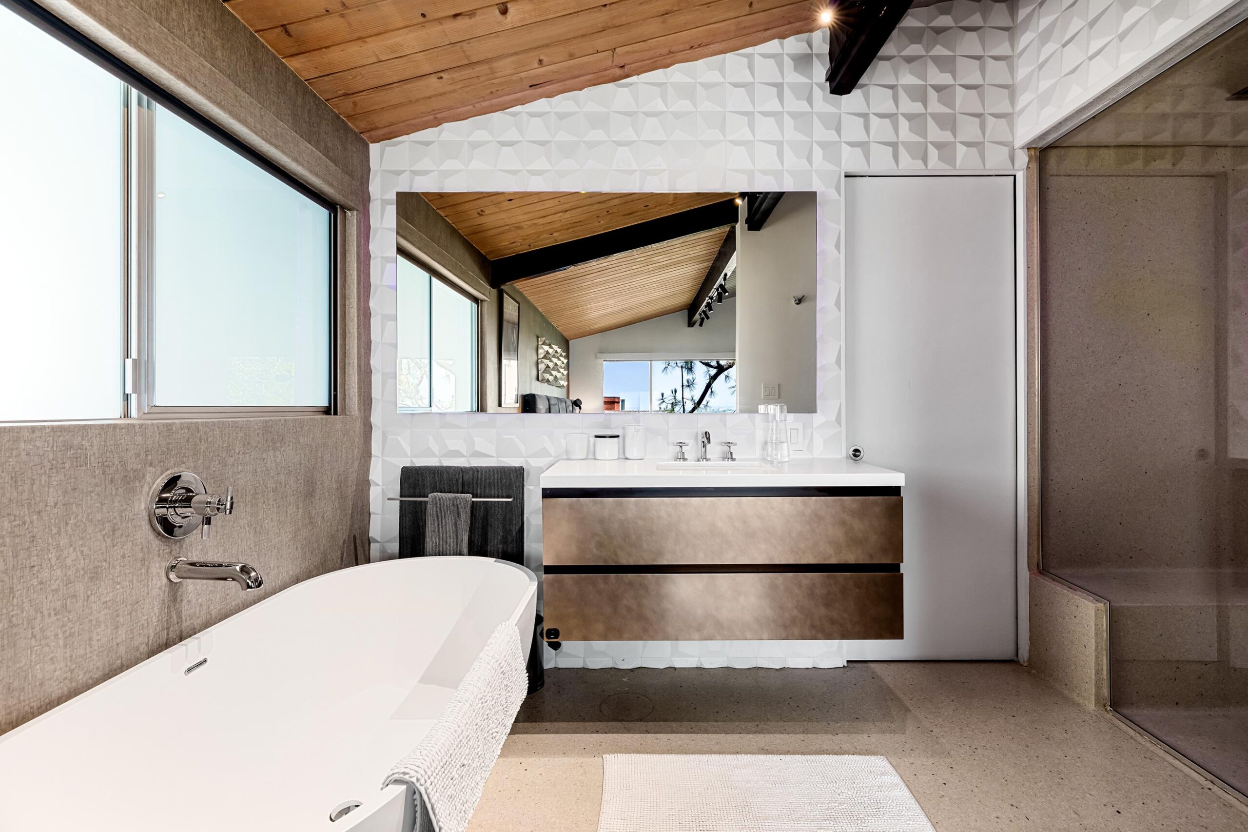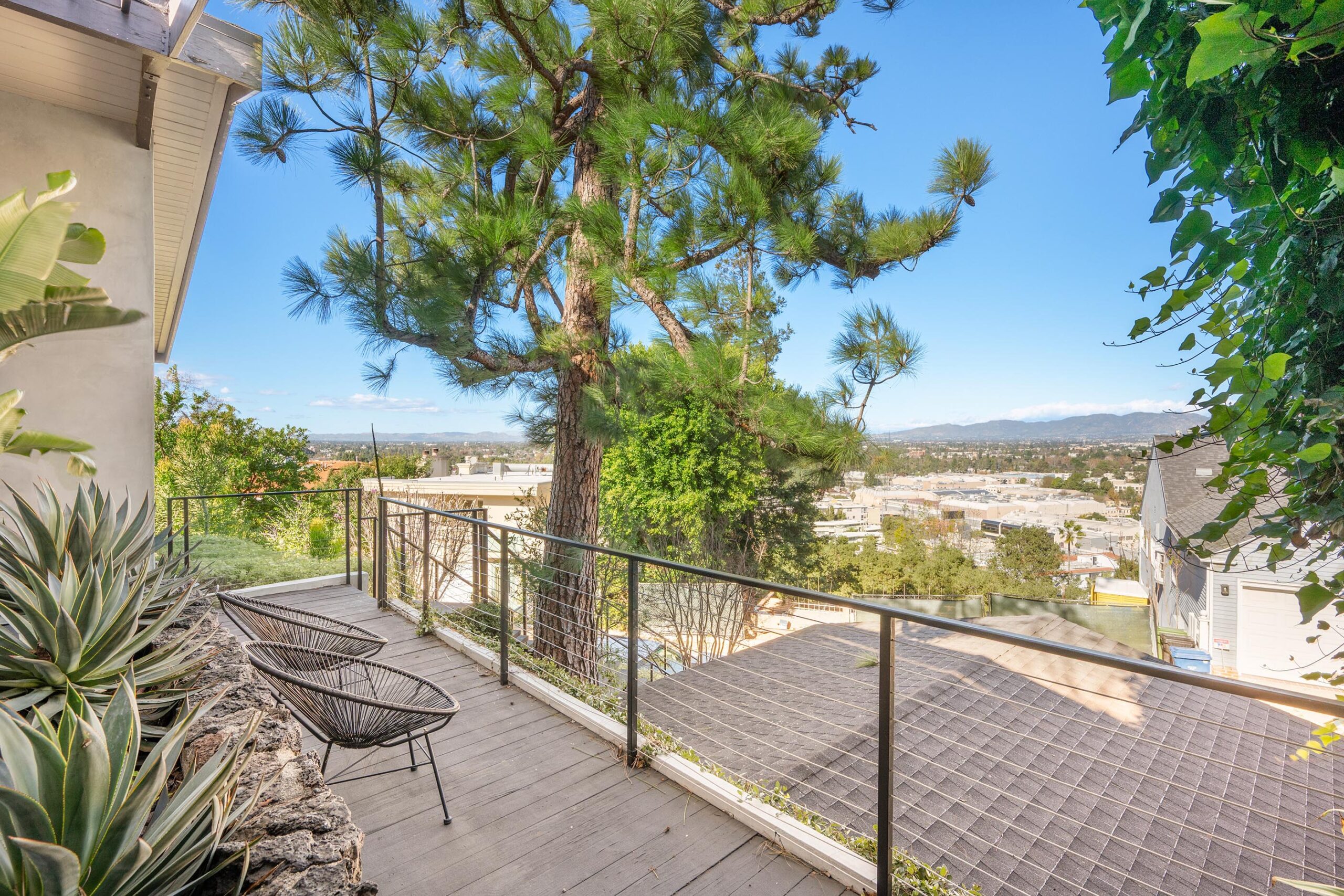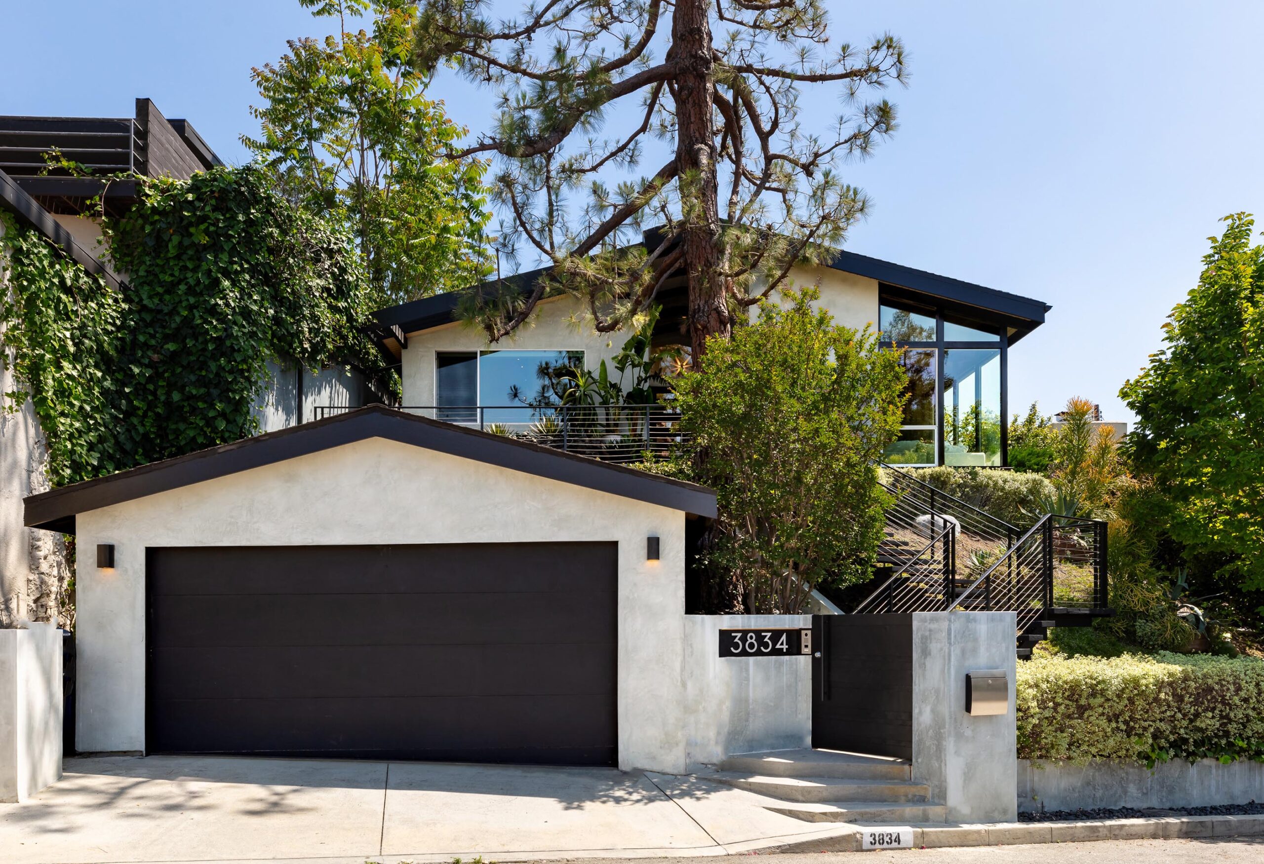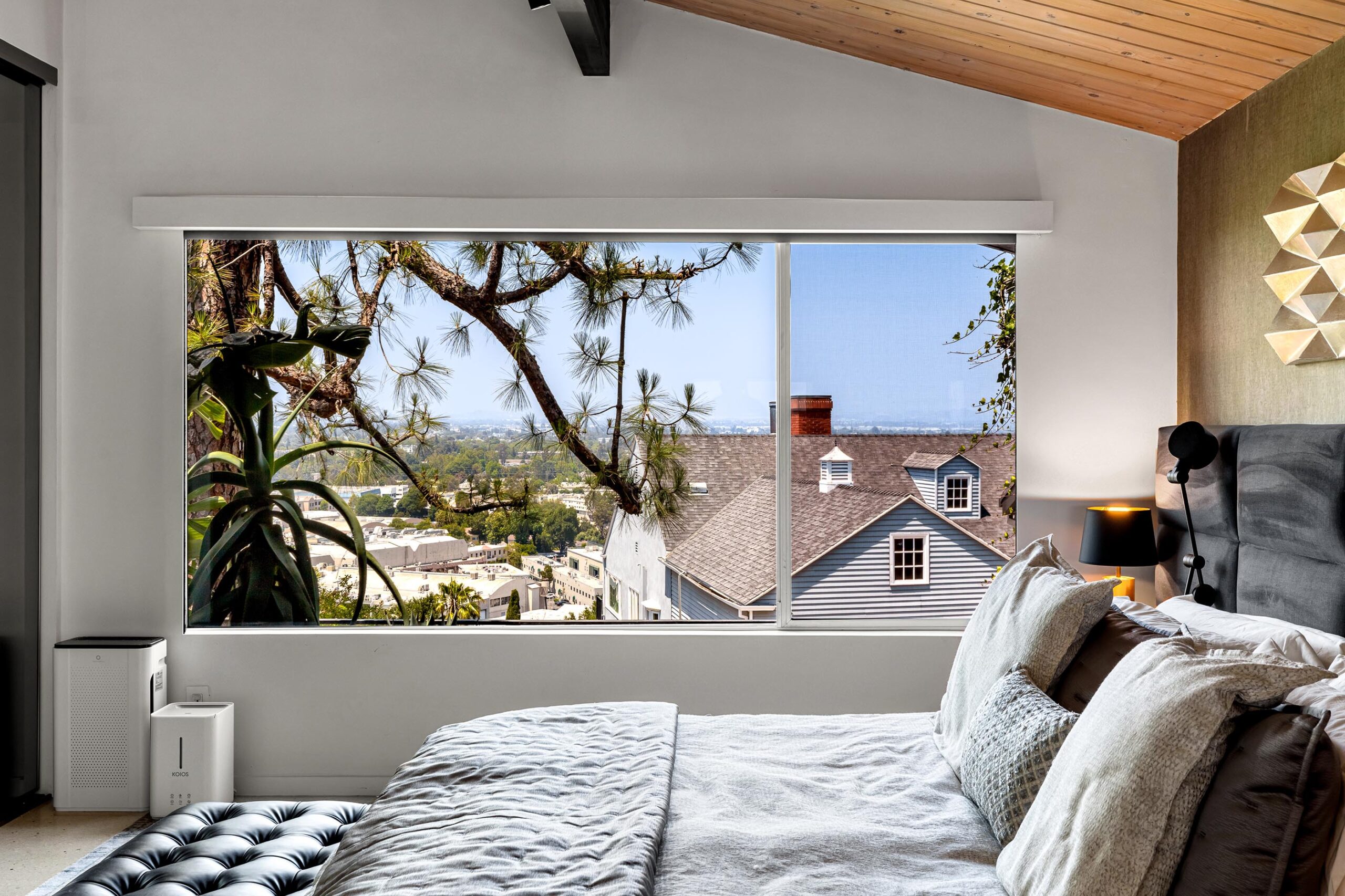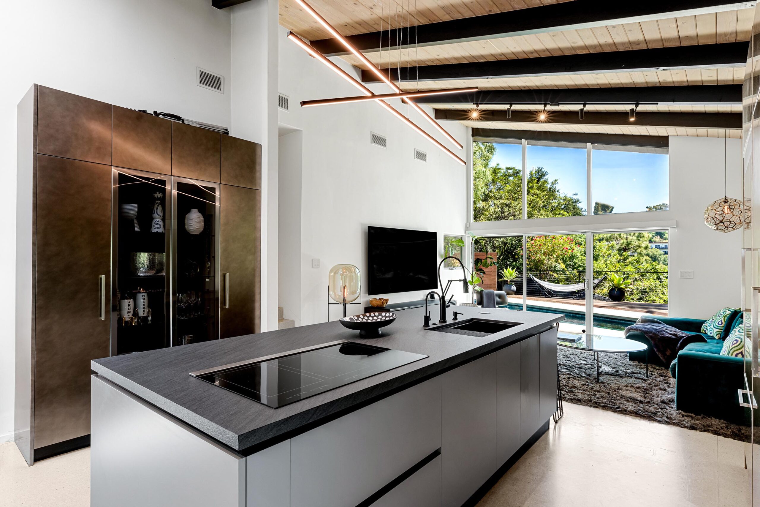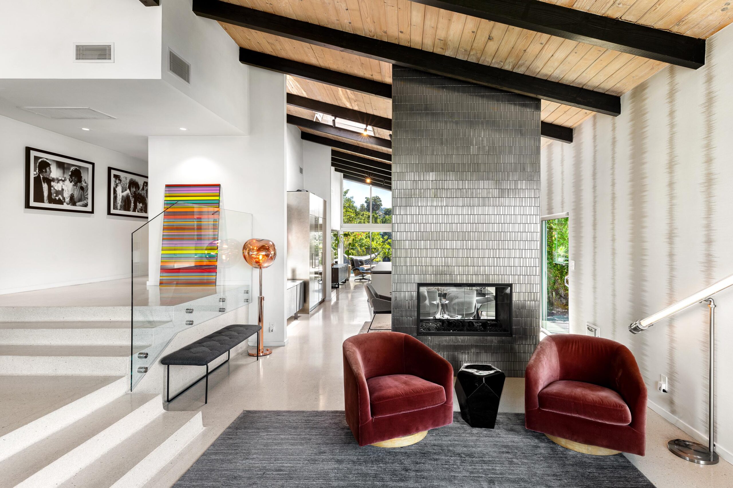 Introducing a mid-century modern residence nestled in the hills above Studio City, offering breathtaking vistas of the mountains and valley. This home is expertly crafted to provide the ultimate luxury living experience. Enter through the grand double door entry to find an open-concept floor plan with natural light pouring in from every angle.Custom poured terrazzo floors and 19-foot exposed beam ceilings add to the home's charm. The living room, with its floor-to-ceiling windows, perfectly frames the incredible views. The spacious dining room featuring a dual-sided fireplace, is ideal for gatherings of friends and family. The custom Pedini kitchen is a chef's dream, complete with high-end Jenn-Air appliances and a large quartz center island, seamlessly connecting to the family room, which also features floor-to-ceiling windows and a sliding door leading to the backyard patio perfect for al fresco dining. The primary suite is a true masterpiece, featuring an oversized picture window, a TV that disappears into the ceiling, blackout blinds, a custom closet, and a spa-like bath with a steam shower, stone soaking tub, and a Toto smart toilet. The two additional bedrooms also have true blackout blinds within-wall channels for complete darkness, custom closets, and share the second full bathroom. The entertainer's backyard is outfitted with a heated salt-water pool, jacuzzi, and fire pit, all while offering captivating views. Designed with integrated smart home technology, the residence includes a Lutron Caseta voice-controlled lighting system, Sonos sound system, Ring security system, whole-home Pelican water softening system, and a fully owned solar energy system for value enhancement and cost savings. Situated just moments from all the dining and shopping along Ventura Blvd and located in the esteemed Carpenter Elementary school district, this home offers a lifestyle you've always dreamed of. Don't miss the opportunity to make it yours.