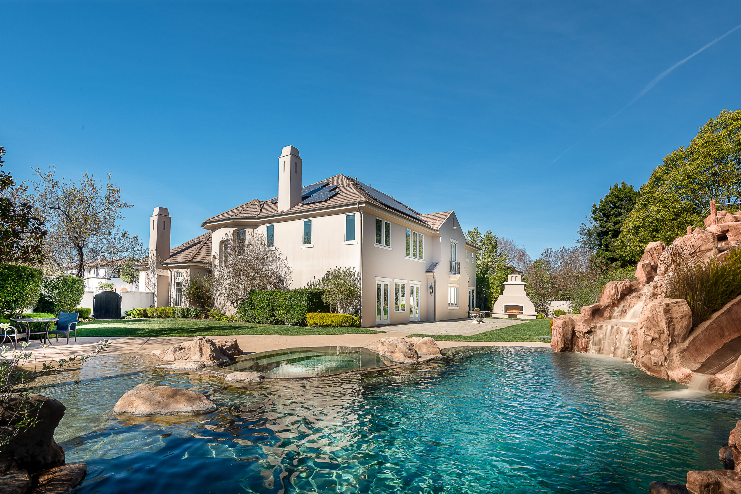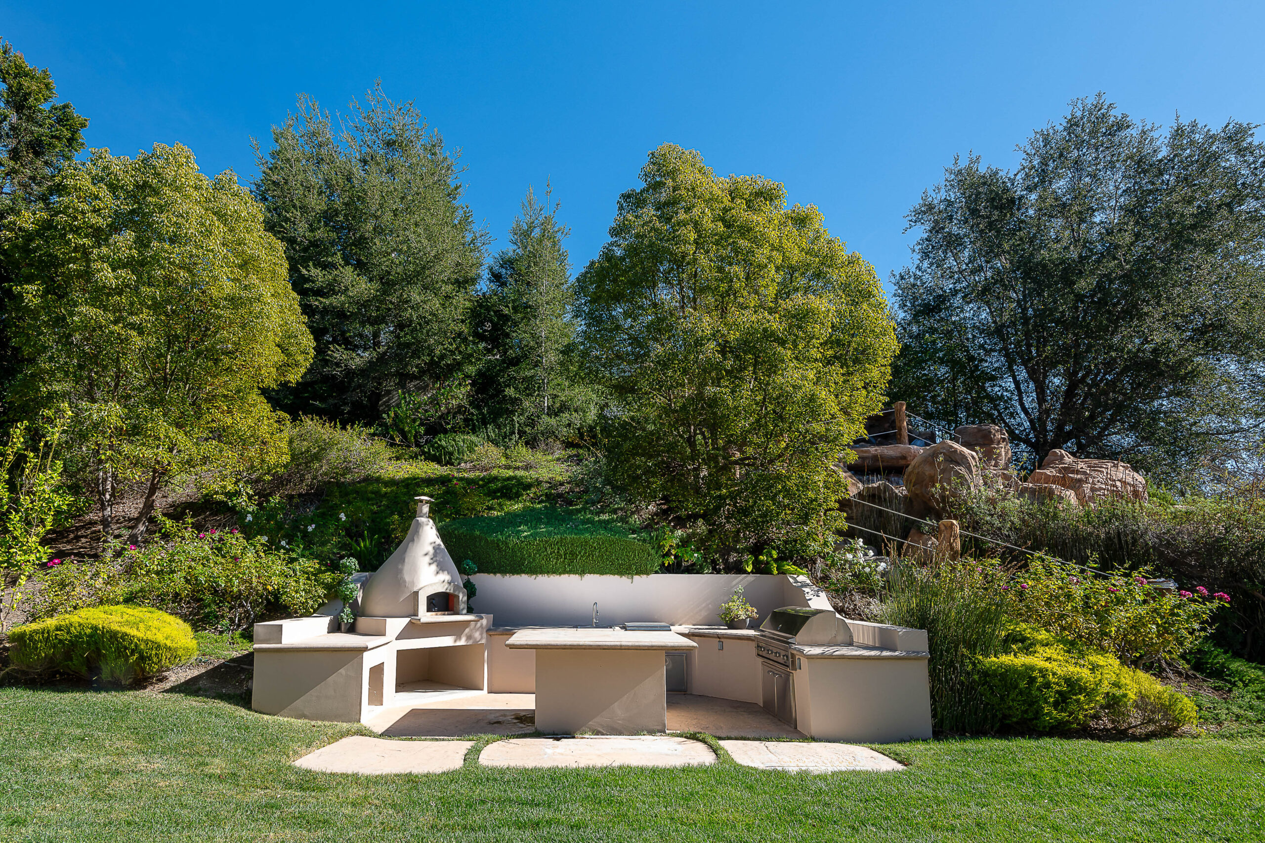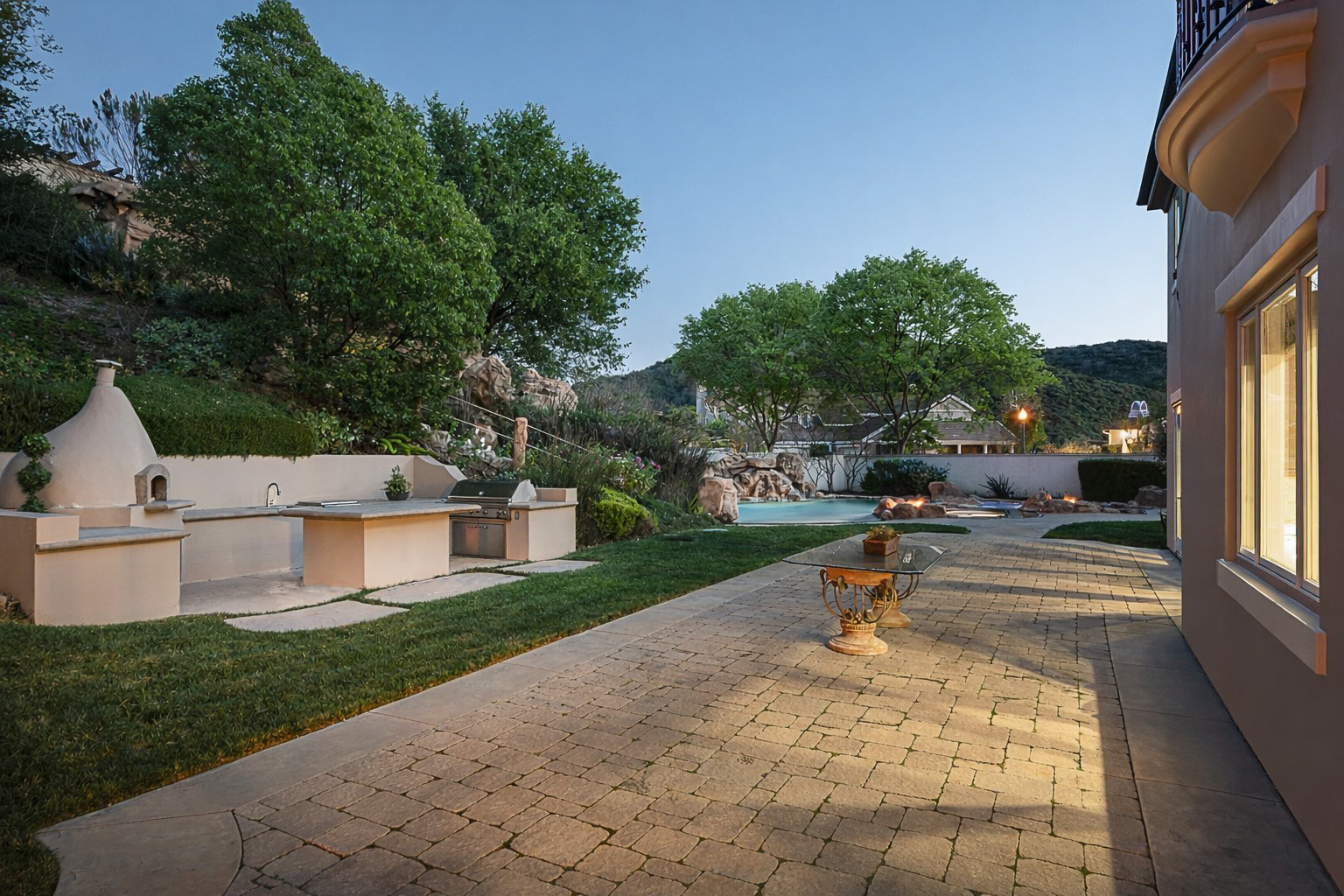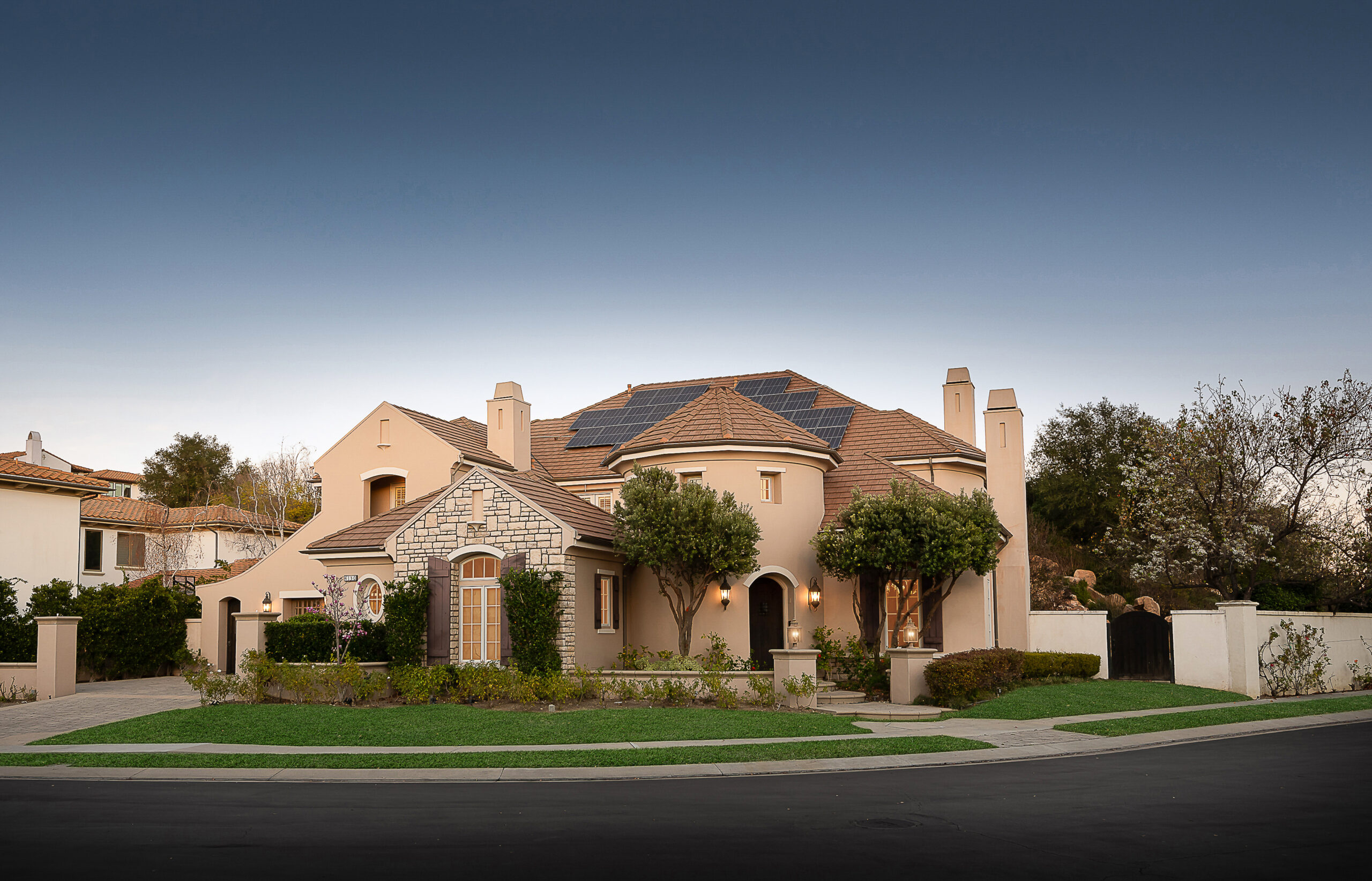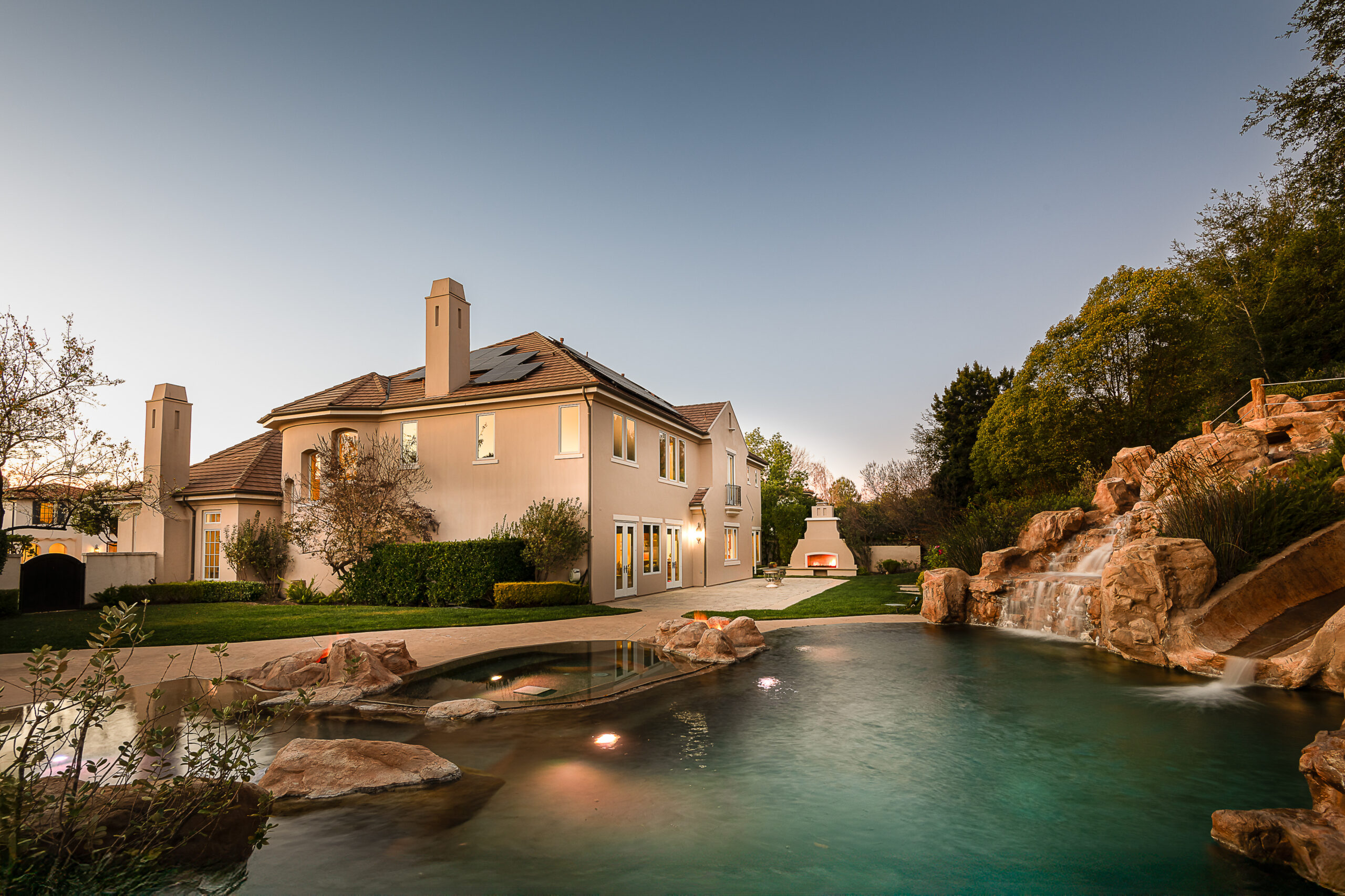 Located behind the iconic guard gates of The Oaks of Calabasas, this estate sits on a rare double cul-de-sac on an approximately 20,000 sq ft corner lot, offering exceptional seclusion. The residence spans approximately 6,255 sq ft and is designed for seamless indoor-outdoor living. The home features a grand foyer with soaring ceilings, solid hardwood floors, and a sweeping staircase. Multiple formal and informal living spaces flow around a private interior courtyard, creating an efficient and functional layout for everyday living, entertaining and relaxing. The residence offers 5 en-suite bedrooms, 4 upstairs and 1 downstairs. The primary suite was designed as a luxurious private sanctuary complimented by a spa-inspired his-and-her bathroom featuring separate toilets and a bidet, dual vanities, oversized soaking spa tub, walk-in closet, private gym, enclosed office space, and peaceful views. Additionally Upstairs, 3 en-suite bedrooms surround a large bonus room ideal for children's own play space or movie watching with friends. At the heart of the home is the chef's kitchen and breakfast nook opening directly to the family room to serve as the central gathering place. This open-concept design features professional-grade Viking appliances, a Sub-Zero refrigerator with ice and water dispenser, 3 dishwashers, custom cabinetry, a butler's pantry, 2 walk-in pantries, and an oversized island with vegetable sink. The backyard is a true showpiece. Designed for resort-style enjoyment the grounds feature a built-in BBQ, stovetop burners, a real wood-burning pizza oven imported from Italy, dramatic rockscape, beach-entry pool and spa with cascading waterfalls and waterslide, expansive patio areas, and lush landscaping. Completing the estate include two garages, rooftop solar panel system, EV-charger, tankless water heater, 4 independent A/C units, whole-house central vacuum system, French doors with Phantom screens and plantation shutters. Residents enjoy exclusive 24-hour guard-gated security and access to The Oaks' amenities, including a clubhouse, fitness center, tennis and pickleball courts, sport courts for basketball, and an Olympic-size community pool. The home is minutes from The Commons at Calabasas offering premier dining and shopping, top-rated schools and scenic & hiking trails.