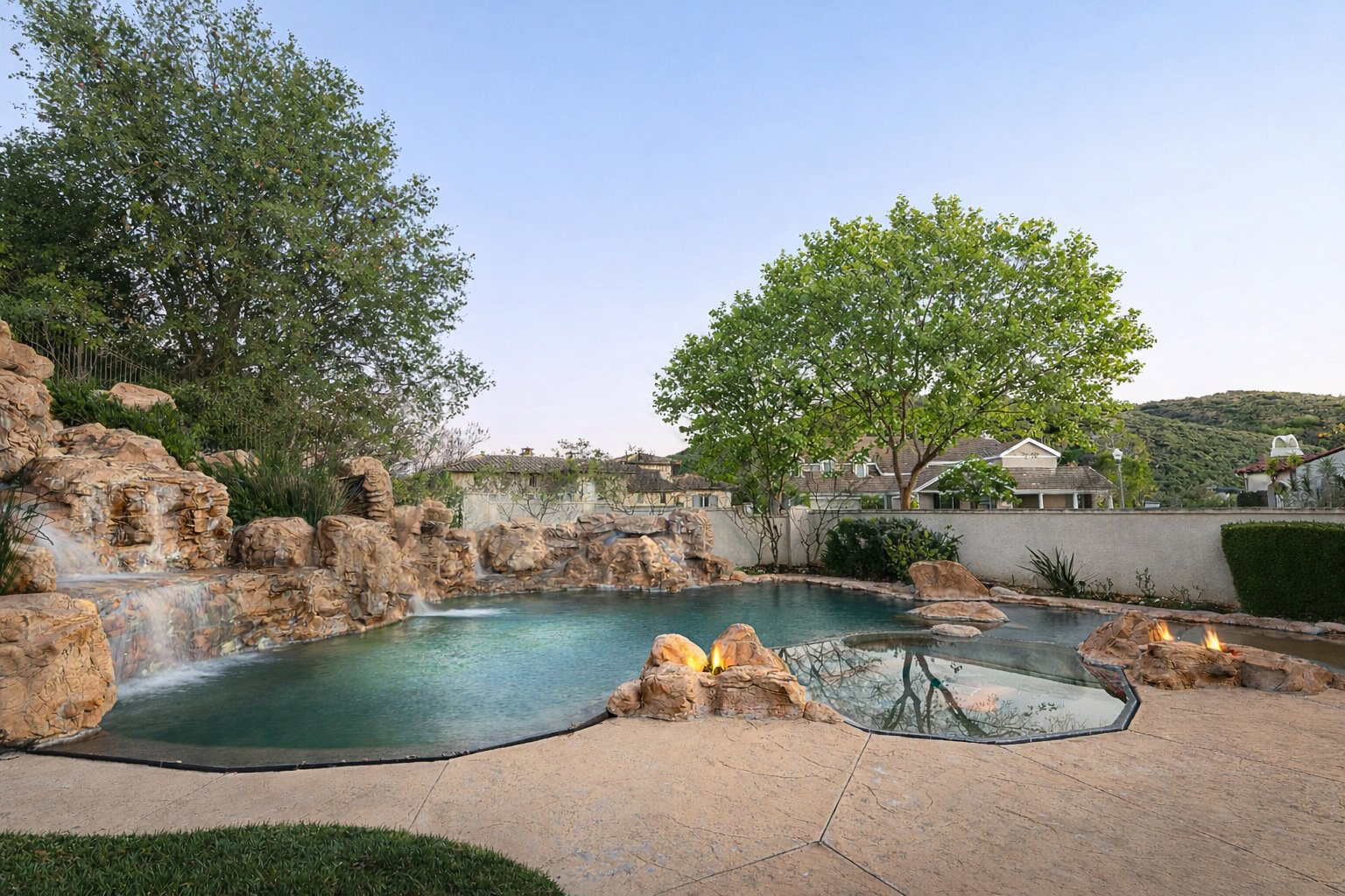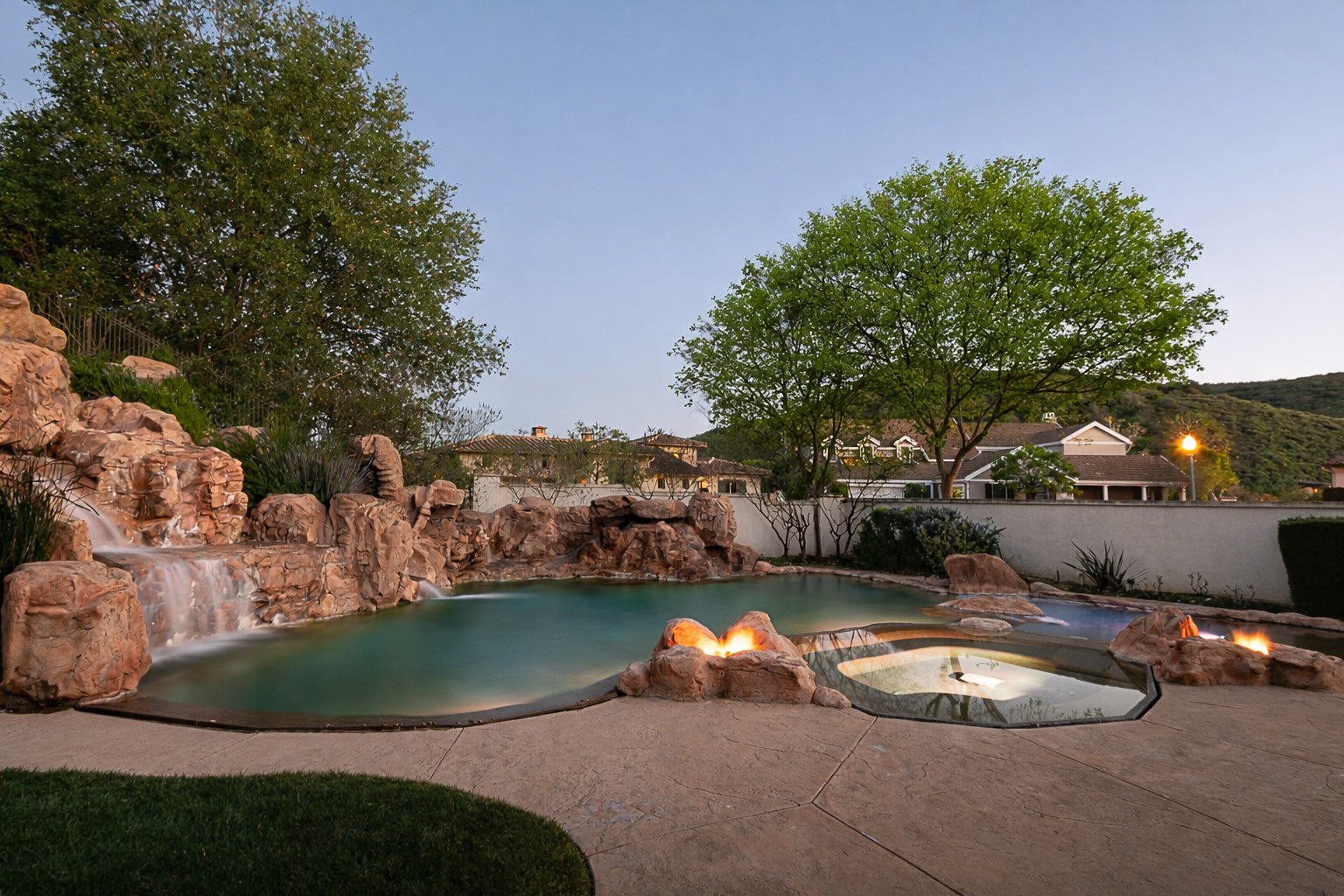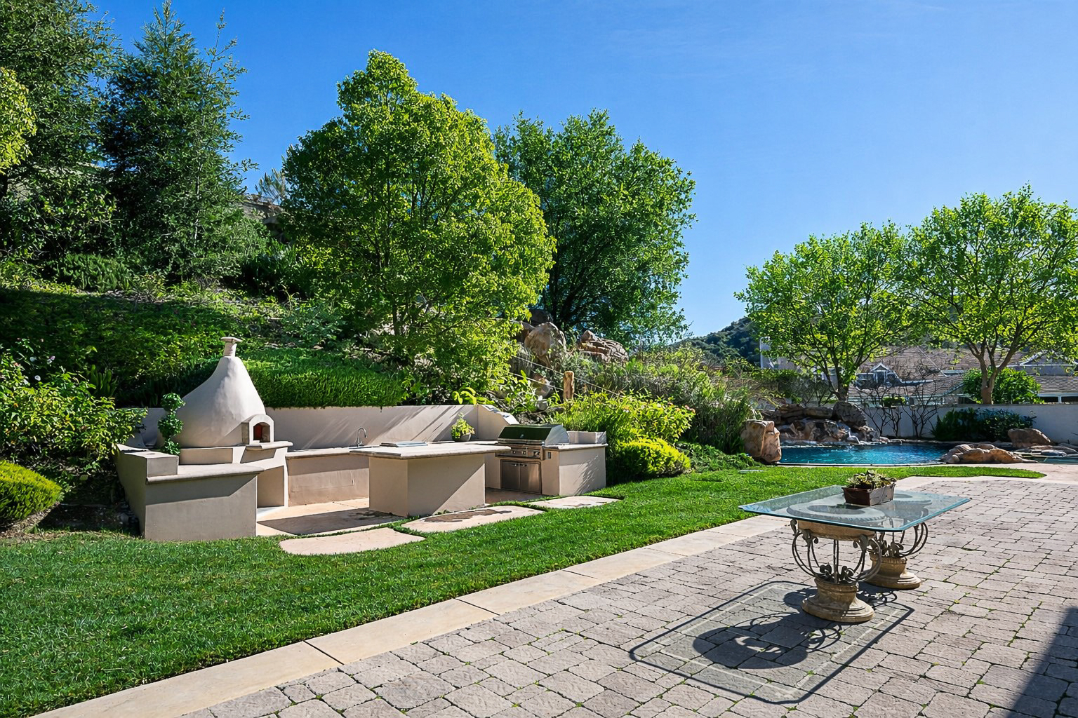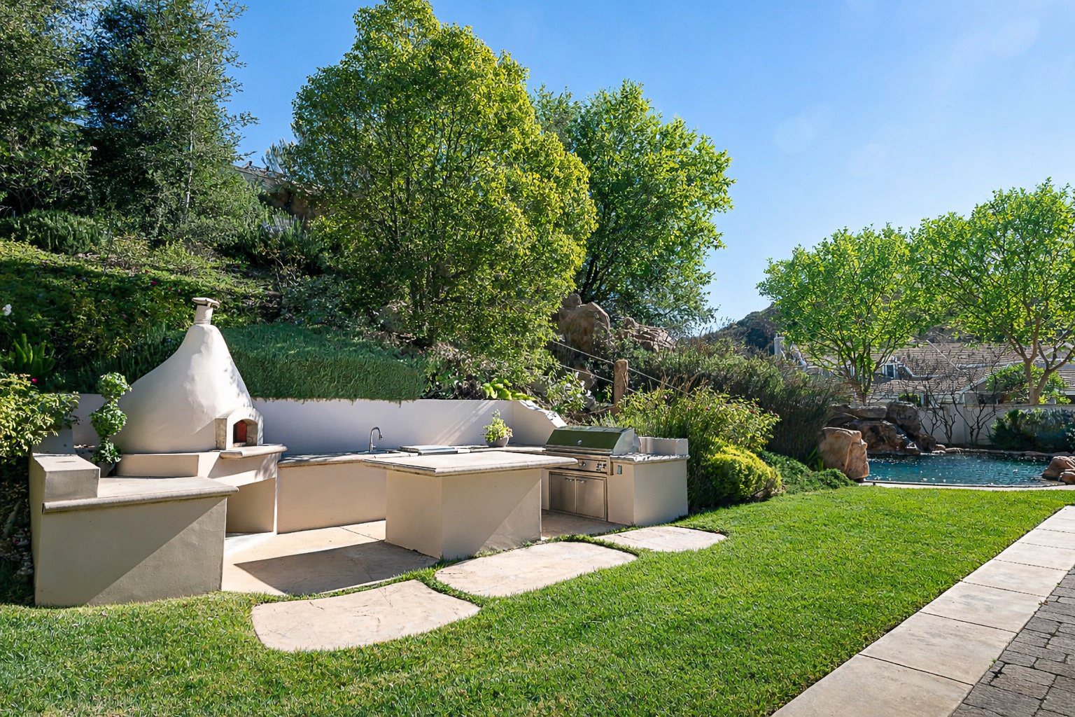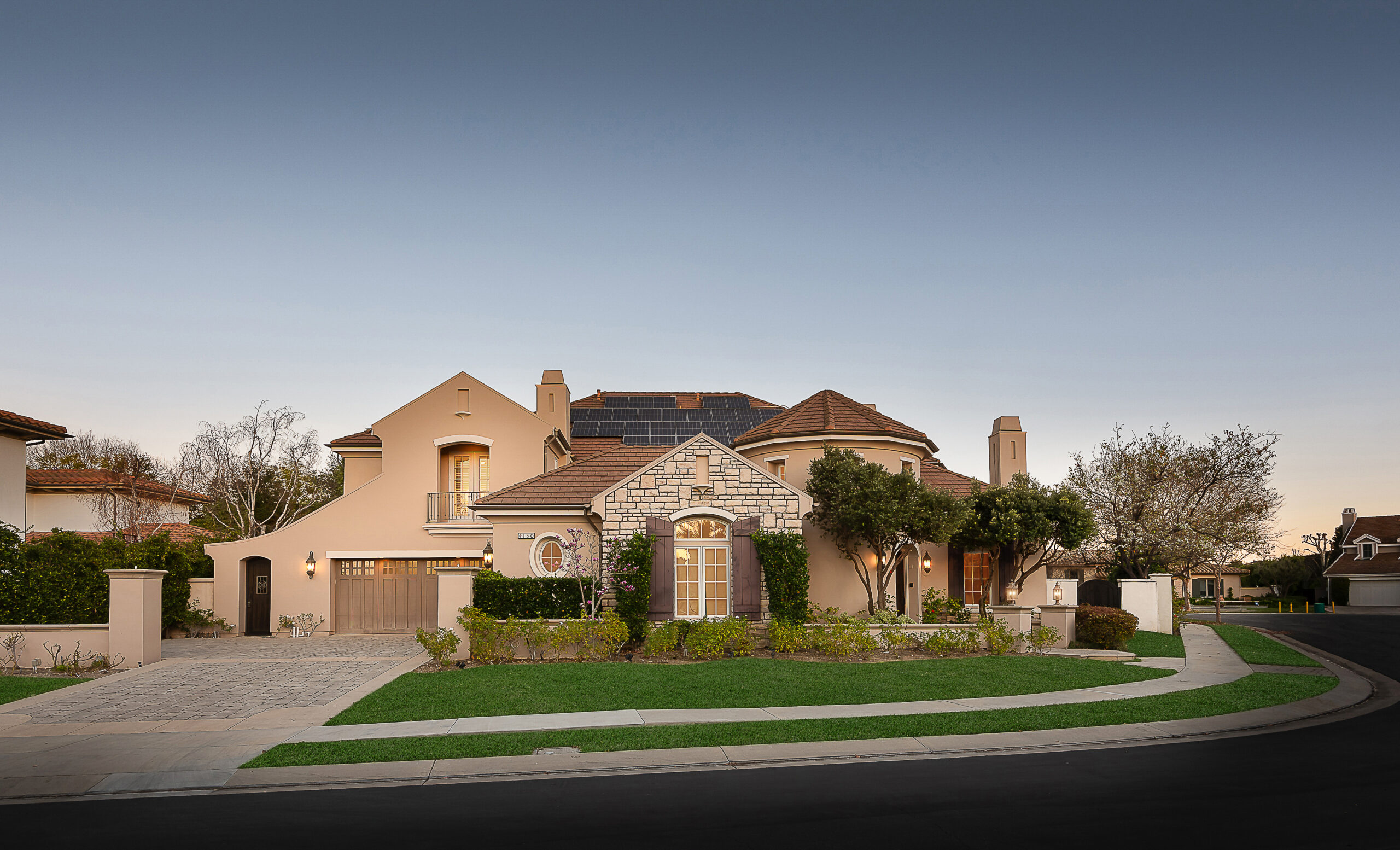 Located behind the iconic guard gates of The Oaks of Calabasas, this estate sits on a rare double cul-de-sac on an approximately 20,000 sq ft corner lot, offering exceptional seclusion. The residence spans approximately 6,255 sq ft and is designed for seamless indoor-outdoor living. The home features a grand foyer with soaring ceilings, solid hardwood floors, and a sweeping staircase. Multiple formal and informal living spaces flow around a private interior courtyard, creating an efficient and functional layout for everyday living, entertaining and relaxing. The residence offers 5 en-suite bedrooms, 4 upstairs and 1 downstairs. The primary suite was designed as a luxurious private sanctuary complimented by a spa-inspired his-and-her bathroom featuring separate toilets and a bidet, dual vanities, oversized soaking spa tub, walk-in closet, private gym, enclosed office space, and peaceful views. Additionally Upstairs, 3 en-suite bedrooms surround a large bonus room ideal for children's own play space or movie watching with friends. At the heart of the home is the chef's kitchen and breakfast nook opening directly to the family room to serve as the central gathering place. This open-concept design features professional-grade Viking appliances, a Sub-Zero refrigerator with ice and water dispenser, 3 dishwashers, custom cabinetry, a butler's pantry, 2 walk-in pantries, and an oversized island with vegetable sink. The backyard is a true showpiece. Designed for resort-style enjoyment the grounds feature a built-in BBQ, stovetop burners, a real wood-burning pizza oven imported from Italy, dramatic rockscape, beach-entry pool and spa with cascading waterfalls and waterslide, expansive patio areas, and lush landscaping. Completing the estate include two garages, rooftop solar panel system, EV-charger, tankless water heater, 4 independent A/C units, whole-house central vacuum system, French doors with Phantom screens and plantation shutters. Residents enjoy exclusive 24-hour guard-gated security and access to The Oaks' amenities, including a clubhouse, fitness center, tennis and pickleball courts, sport courts for basketball, and an Olympic-size community pool. The home is minutes from The Commons at Calabasas offering premier dining and shopping, top-rated schools and scenic & hiking trails.