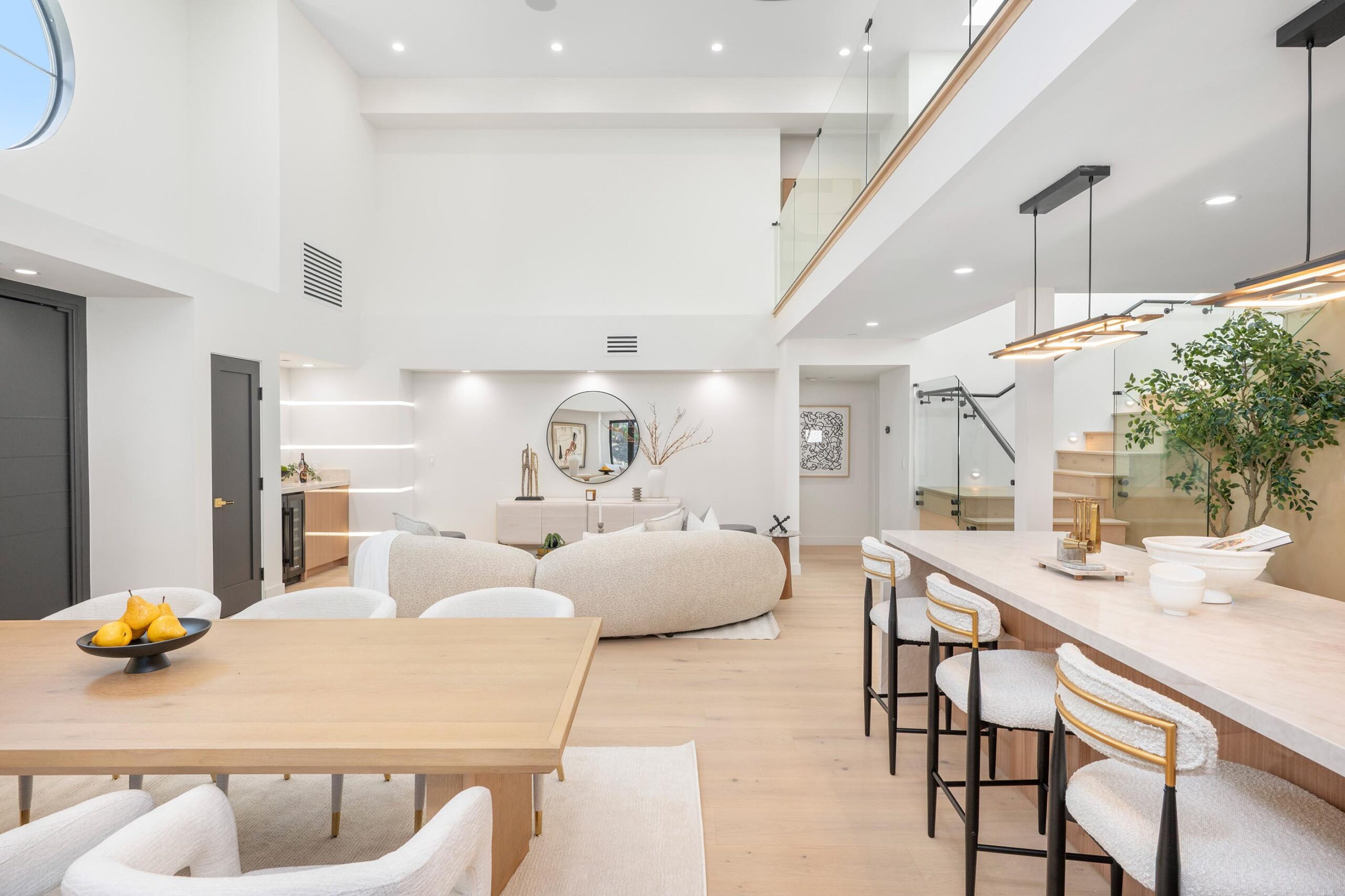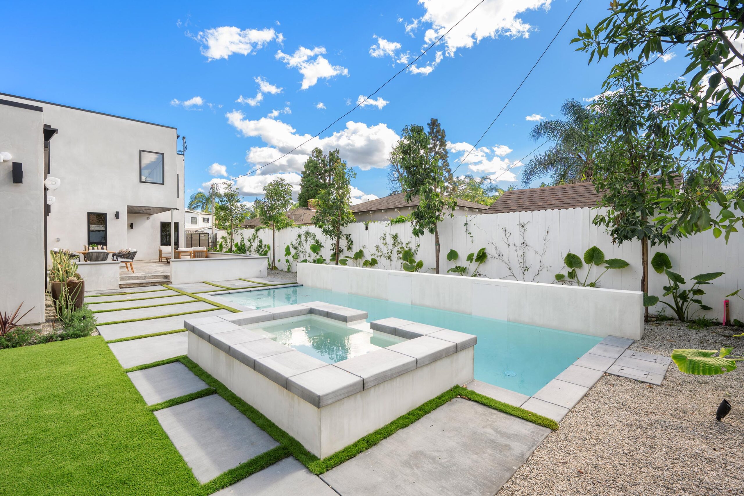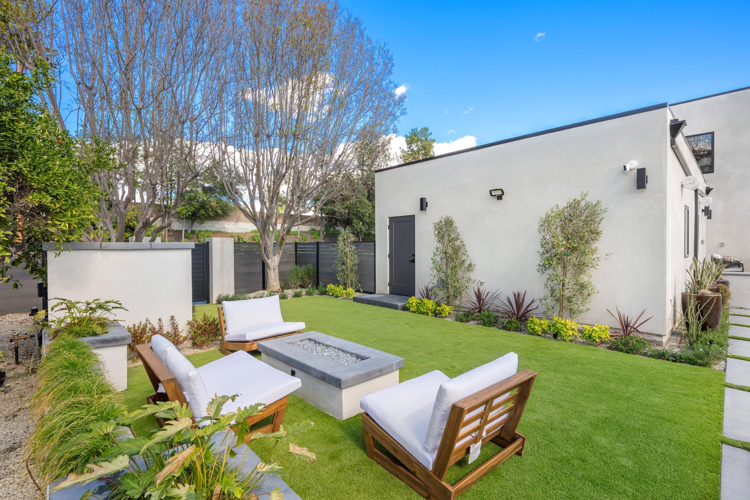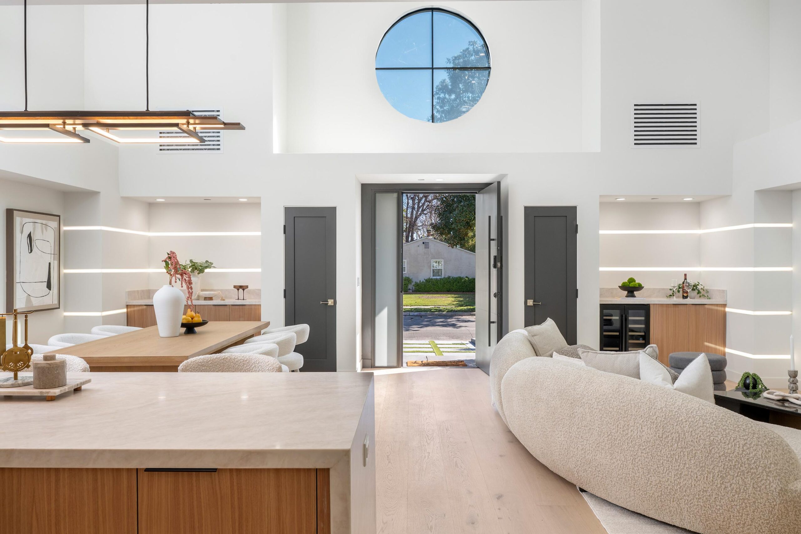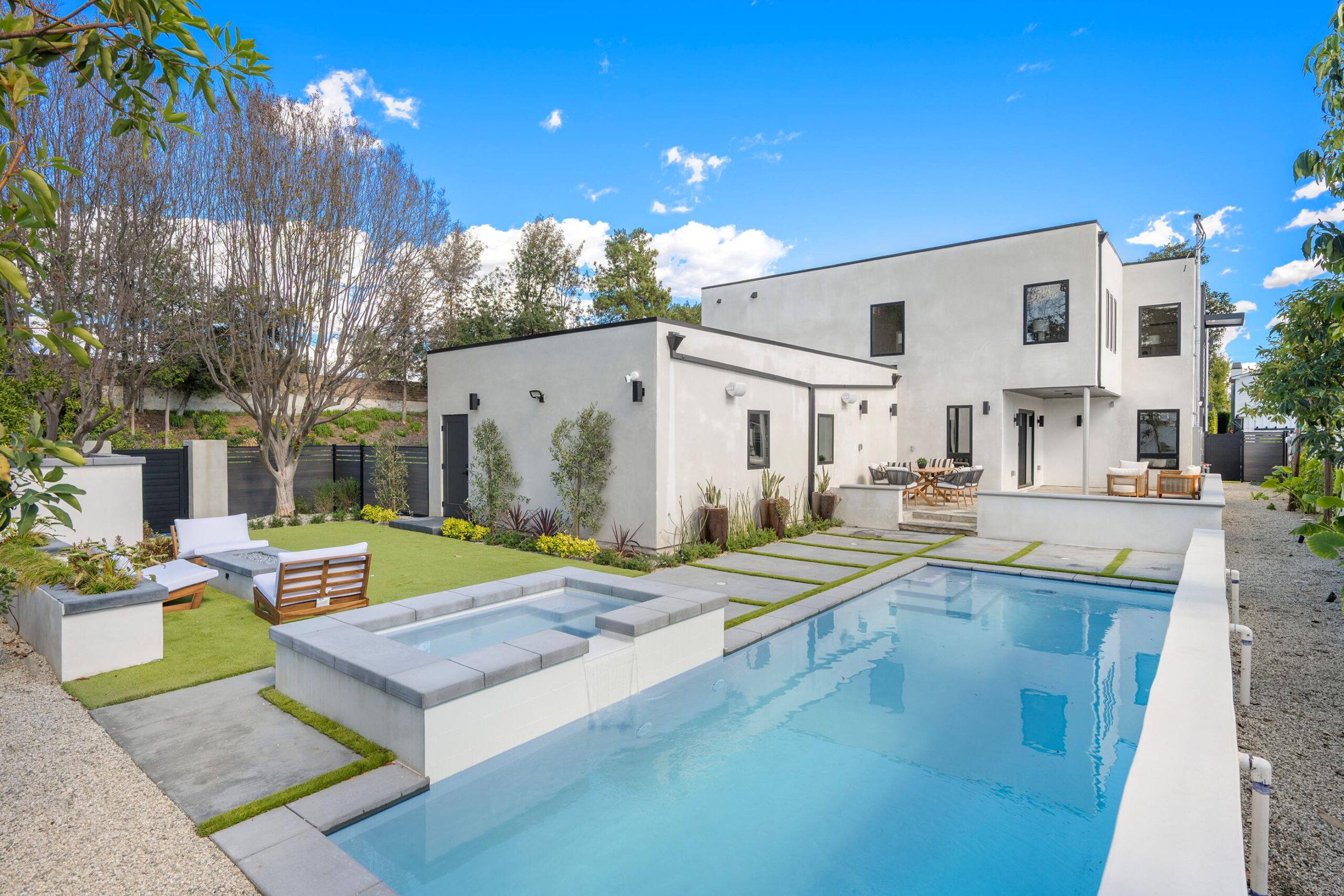 Presenting a newly remodeled corner-lot residence in Studio City filled with multiple living areas and generous outdoor space, designed for an elevated lifestyle. Thoughtfully reimagined with an open floor plan, soaring ceilings, and a clean contemporary aesthetic, this 4BD/4BA home plus office blends style and functionality at every turn. Warm flooring guides you through the main living and dining spaces, which flow seamlessly together and are enhanced by built-in storage and a custom minibar complete with wine cooler, ideal for entertaining. The sleek kitchen is outfitted with brand-new ZLINE appliances, including a six-burner range, complemented by striking countertops and bar seating perfect for casual gatherings. The main level features a light-filled bedroom with a full bath just off the hallway, along with a versatile bonus room well suited for a home office. Adjacent to the kitchen, an additional living area with a modern fireplace and sliding glass doors opens effortlessly to the backyard. A stylish powder bath nearby provides convenience for guests. Upstairs, three additional bedrooms await, including a luxurious primary suite occupying its own private wing. This retreat boasts two custom walk-in closets, a stunning fireplace, and an en-suite bath with an enclosed step-in shower, soaking tub, dual floating vanities, and a water closet with an automatic toilet. Two secondary bedrooms offer ample storage and share a beautifully appointed bathroom with dual vanities and a spa-like shower. Overlooking the main living spaces, a cozy upstairs loft further enhances the home’s airy, open feel. Outdoors, the entertainer’s backyard invites year-round enjoyment with a sparkling pool and spa, an expansive turf area with fire pit, and multiple gathering spaces for relaxing or hosting. Additional highlights include a three-car garage with direct interior access, abundant storage throughout, and a dedicated laundry room with sink. Ideally located moments from Tujunga Village and Studio City’s favorite boutiques and cafés, this thoughtfully redesigned home captures the essence of elevated California living.