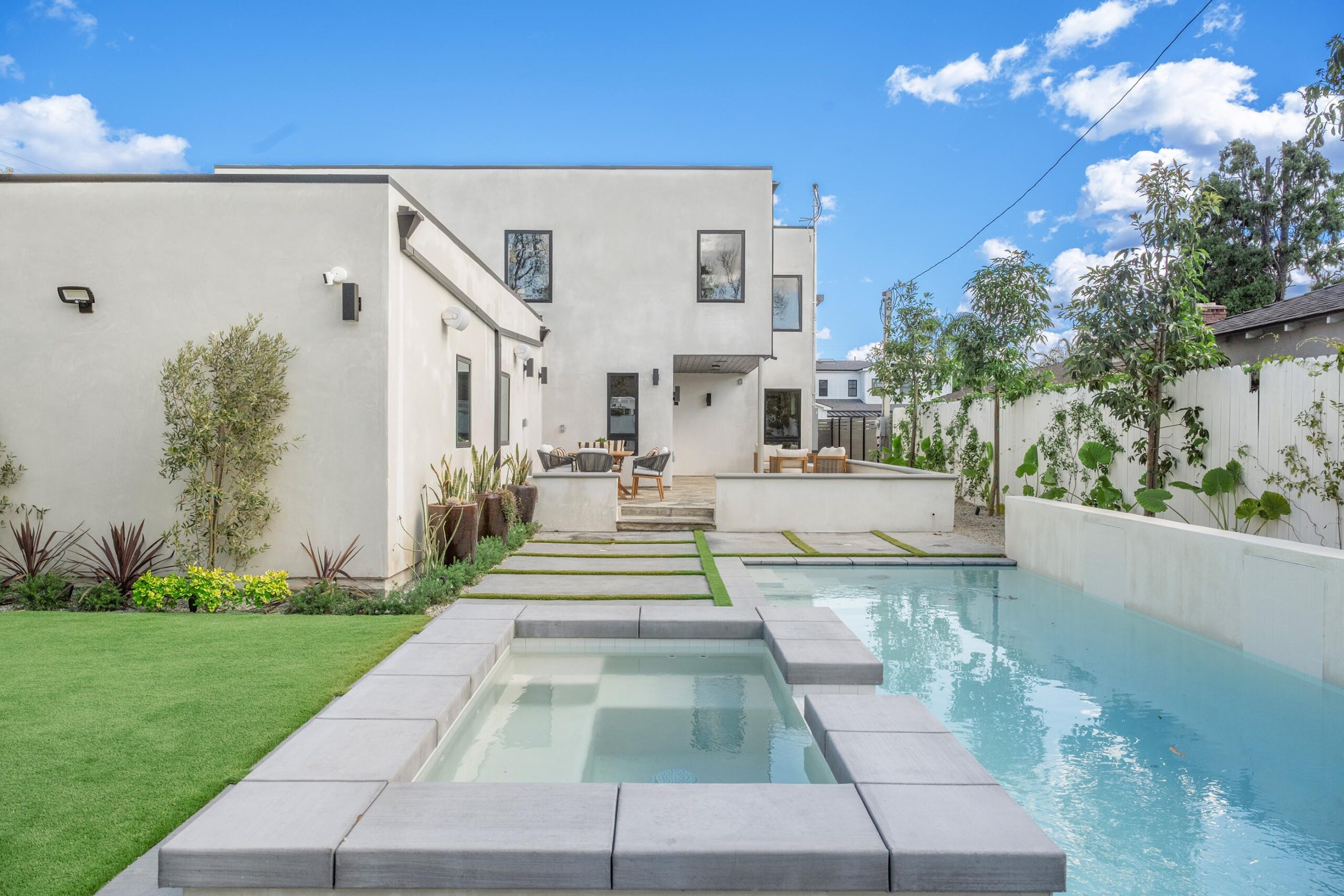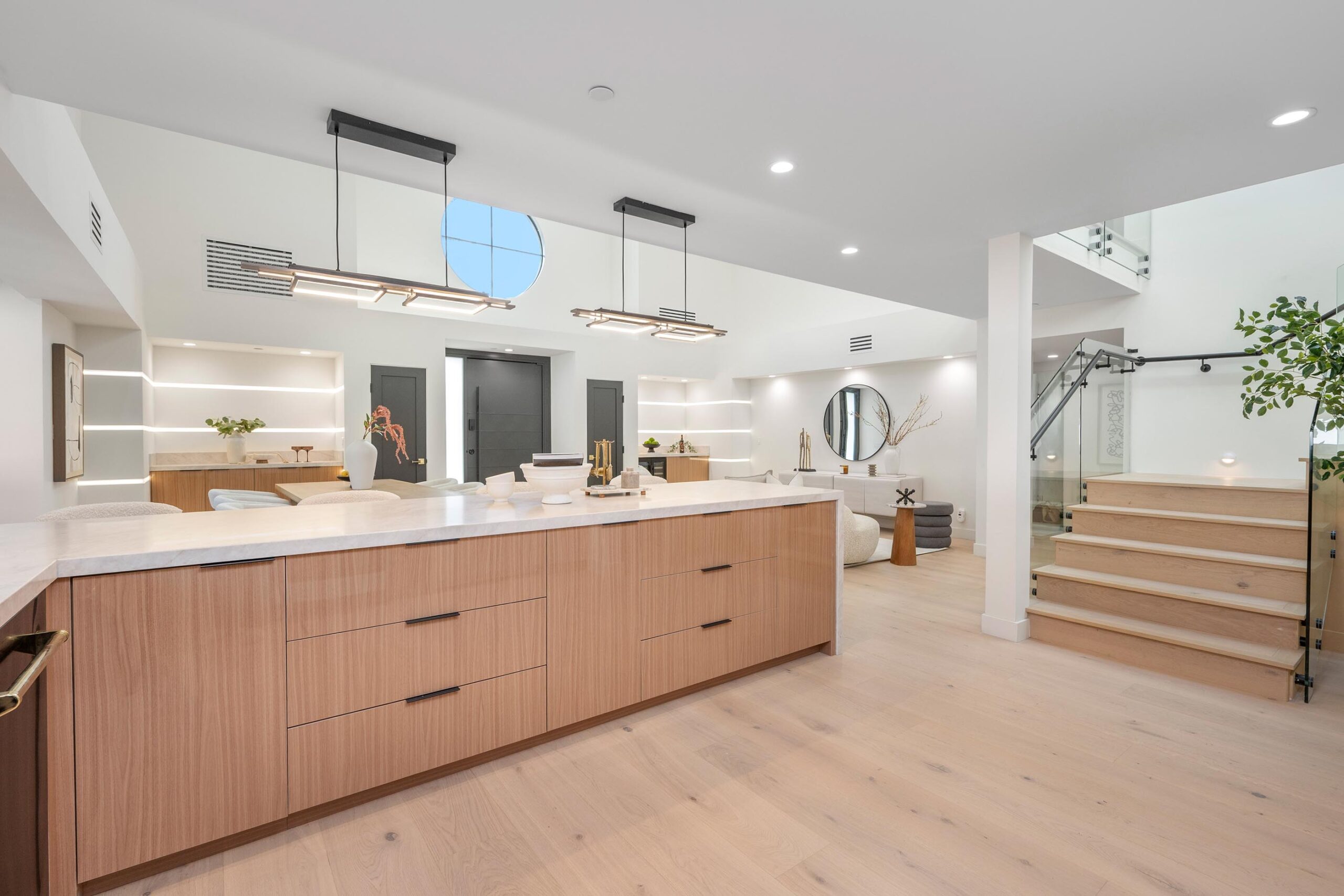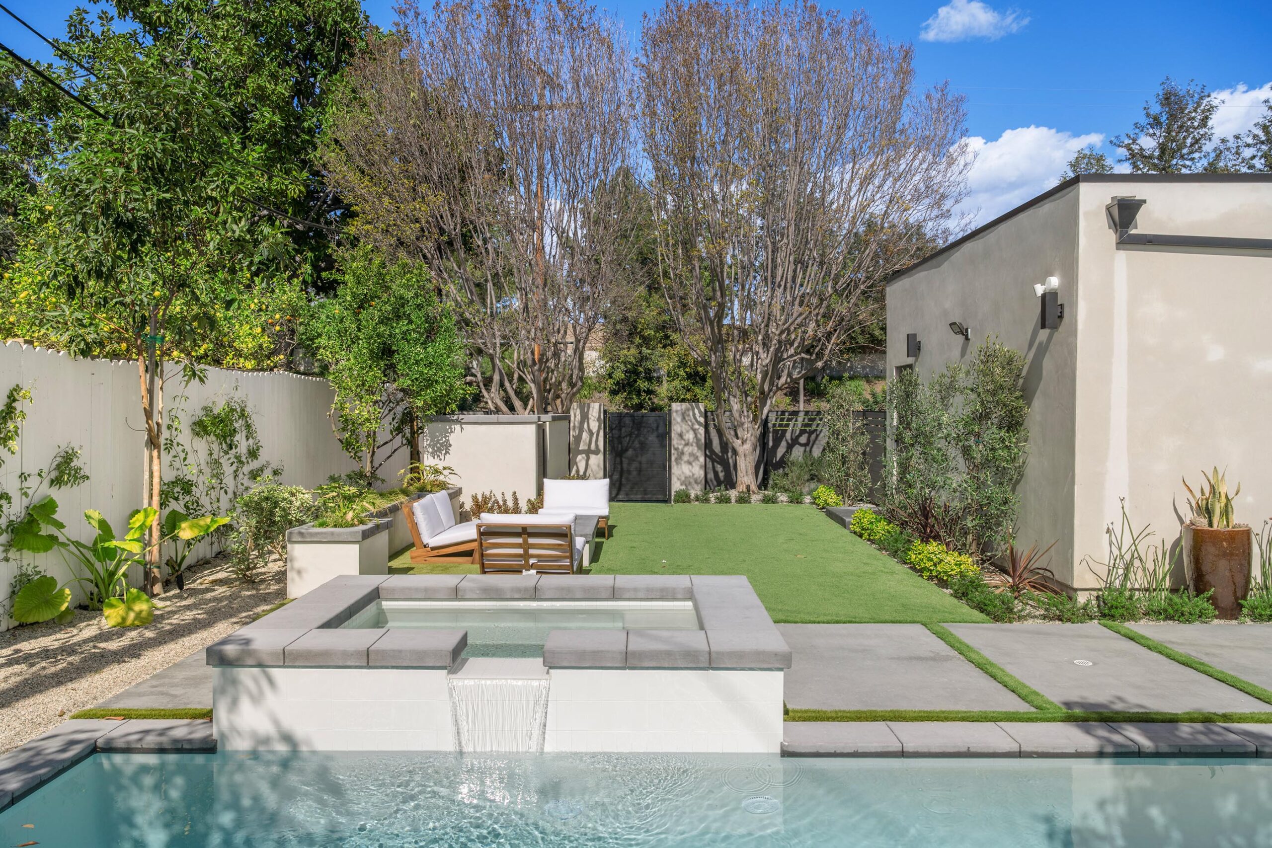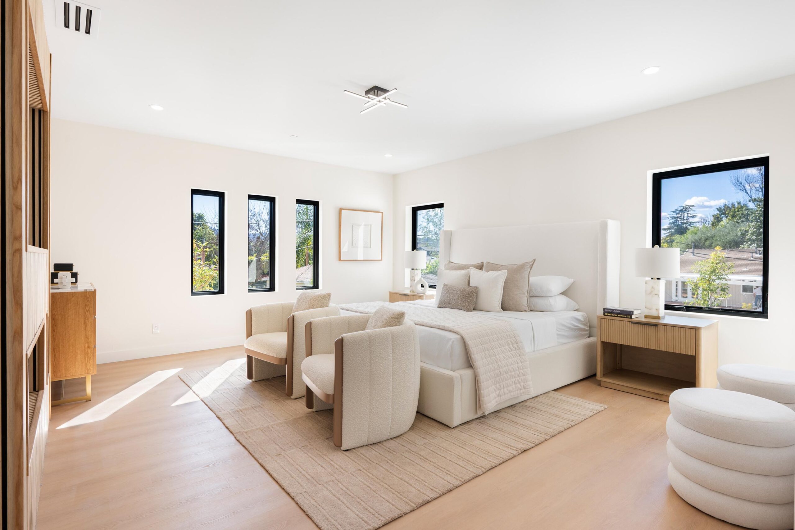 Presenting a newly remodeled corner-lot residence in Studio City filled with multiple living areas and generous outdoor space, designed for an elevated lifestyle. Thoughtfully reimagined with an open floor plan, soaring ceilings, and a clean contemporary aesthetic, this 4BD/4BA home plus office blends style and functionality at every turn. Warm flooring guides you through the main living and dining spaces, which flow seamlessly together and are enhanced by built-in storage and a custom minibar complete with wine cooler, ideal for entertaining. The sleek kitchen is outfitted with brand-new ZLINE appliances, including a six-burner range, complemented by striking countertops and bar seating perfect for casual gatherings. The main level features a light-filled bedroom with a full bath just off the hallway, along with a versatile bonus room well suited for a home office. Adjacent to the kitchen, an additional living area with a modern fireplace and sliding glass doors opens effortlessly to the backyard. A stylish powder bath nearby provides convenience for guests. Upstairs, three additional bedrooms await, including a luxurious primary suite occupying its own private wing. This retreat boasts two custom walk-in closets, a stunning fireplace, and an en-suite bath with an enclosed step-in shower, soaking tub, dual floating vanities, and a water closet with an automatic toilet. Two secondary bedrooms offer ample storage and share a beautifully appointed bathroom with dual vanities and a spa-like shower. Overlooking the main living spaces, a cozy upstairs loft further enhances the home’s airy, open feel. Outdoors, the entertainer’s backyard invites year-round enjoyment with a sparkling pool and spa, an expansive turf area with fire pit, and multiple gathering spaces for relaxing or hosting. Additional highlights include a three-car garage with direct interior access, abundant storage throughout, and a dedicated laundry room with sink. Ideally located moments from Tujunga Village and Studio City’s favorite boutiques and cafés, this thoughtfully redesigned home captures the essence of elevated California living.