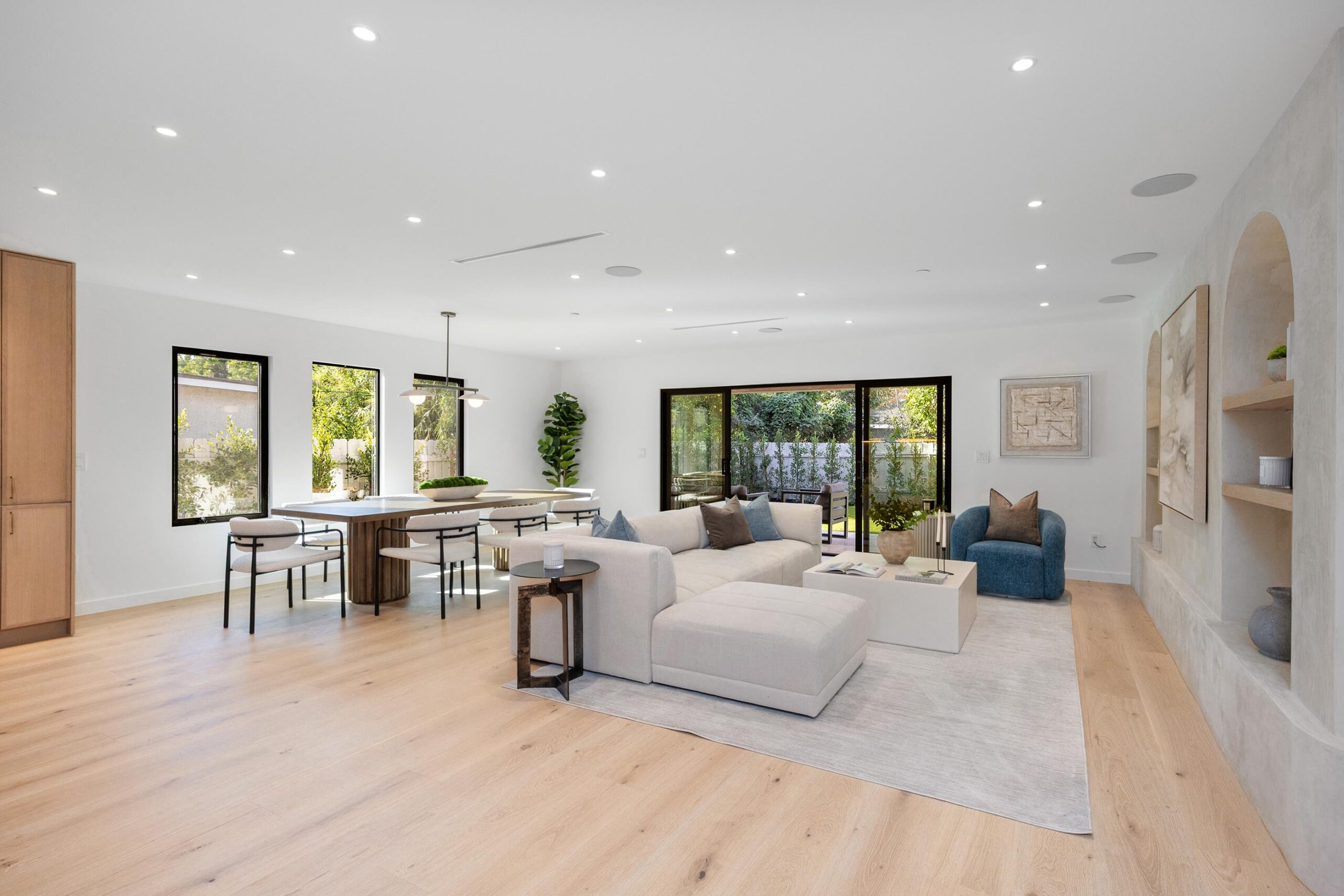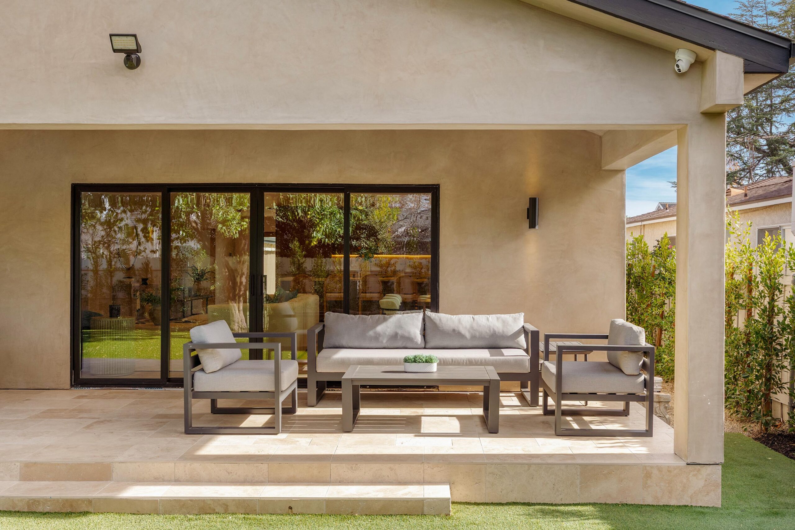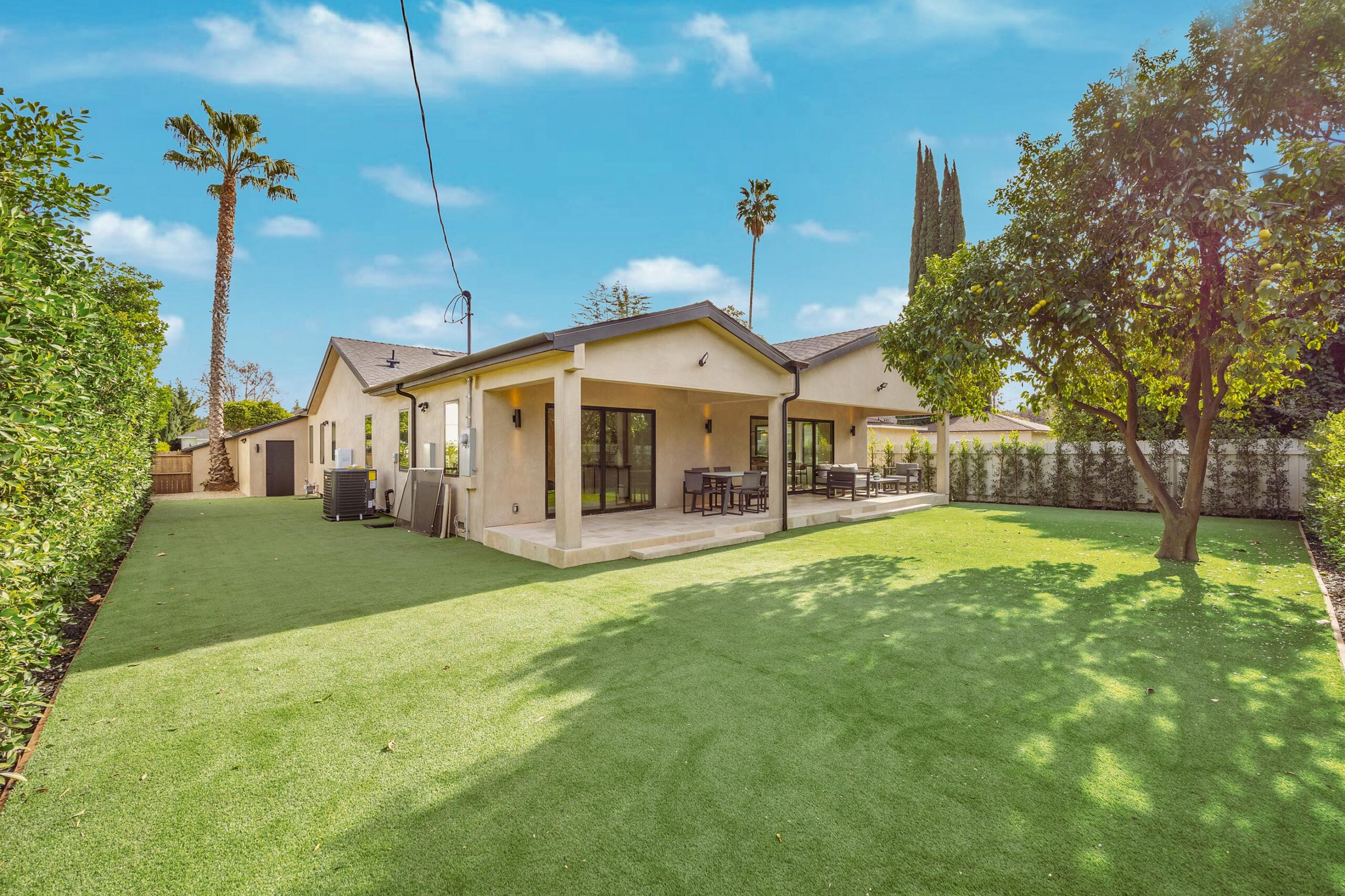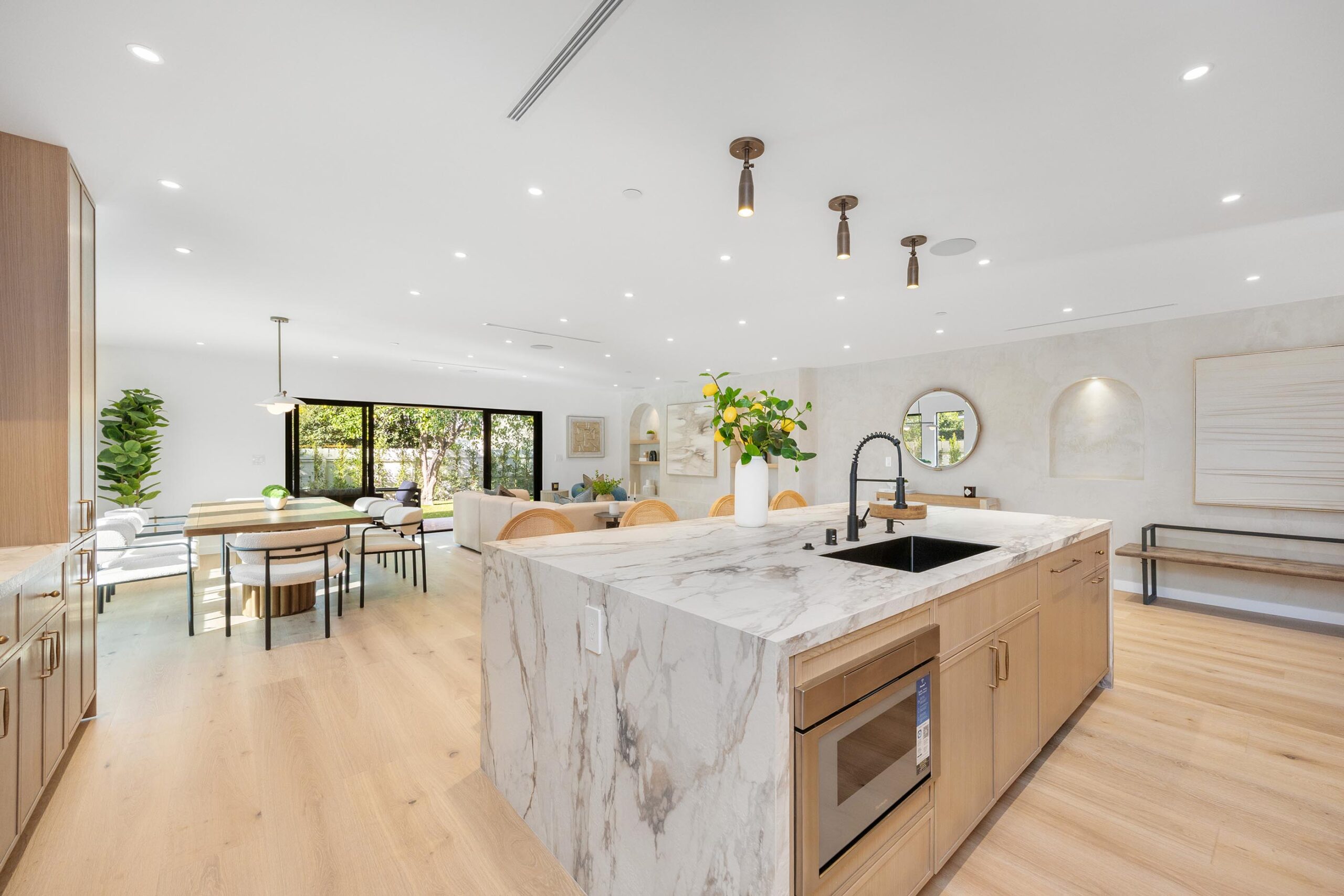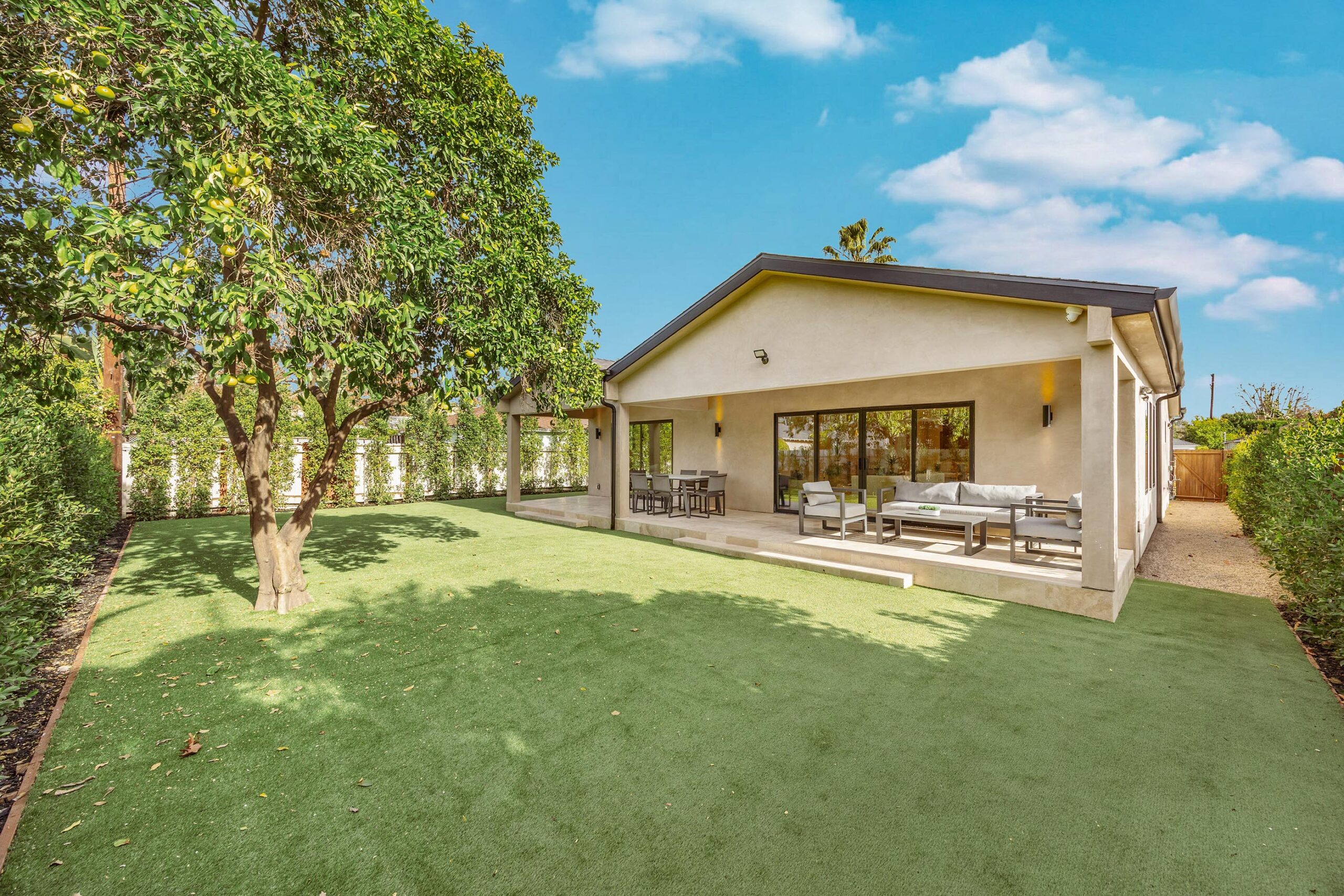 Located in a highly desirable pocket of Sherman Oaks, this beautifully reimagined single-level residence blends refined design with effortless livability. Offering three bedrooms and three and a half bathrooms, the home unfolds across a generous open floor plan ideal for both everyday comfort and elevated entertaining. Upon entry, oak hardwood floors, abundant natural light, and Marmorino Tintoretto plaster walls create an immediate sense of warmth and sophistication. At the heart of the home, the gourmet kitchen is a true showpiece, featuring premium Thermador appliances, porcelain countertops, sleek light-toned cabinetry, and an oversized island with bar seating, perfect for casual meals or gathering with guests. The kitchen flows seamlessly into the living and dining areas, where expansive sliding glass doors invite the outdoors in and open to the backyard retreat. Just off the kitchen, a stylish powder bath with a natural silver travertine vanity adds convenience for hosting.The main hallway leads to a serene primary suite, complete with a spacious walk-in closet, direct backyard access, and a spa-inspired ensuite bath featuring a floating double vanity, a large step-in shower with built-in bench, and a soaking tub. Two additional bedrooms near the entry each offer their own ensuite baths with stone-topped floating vanities and luxe step-in showers. A thoughtfully designed laundry area with additional storage completes the interior. Designed for year-round enjoyment, the lush backyard captures the essence of California living with a covered patio, a charming lemon tree, and ample space for entertaining under the stars. Ideally located moments from Westfield Fashion Square and the renowned shops and restaurants of Ventura Boulevard, this home seamlessly blends contemporary luxury with everyday convenience.