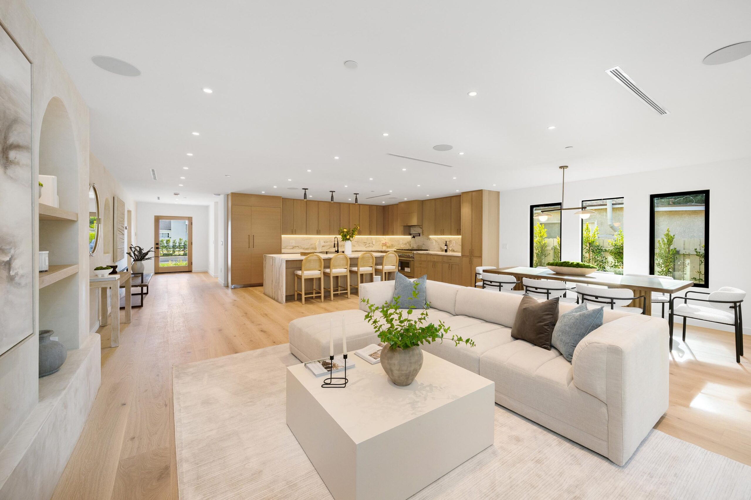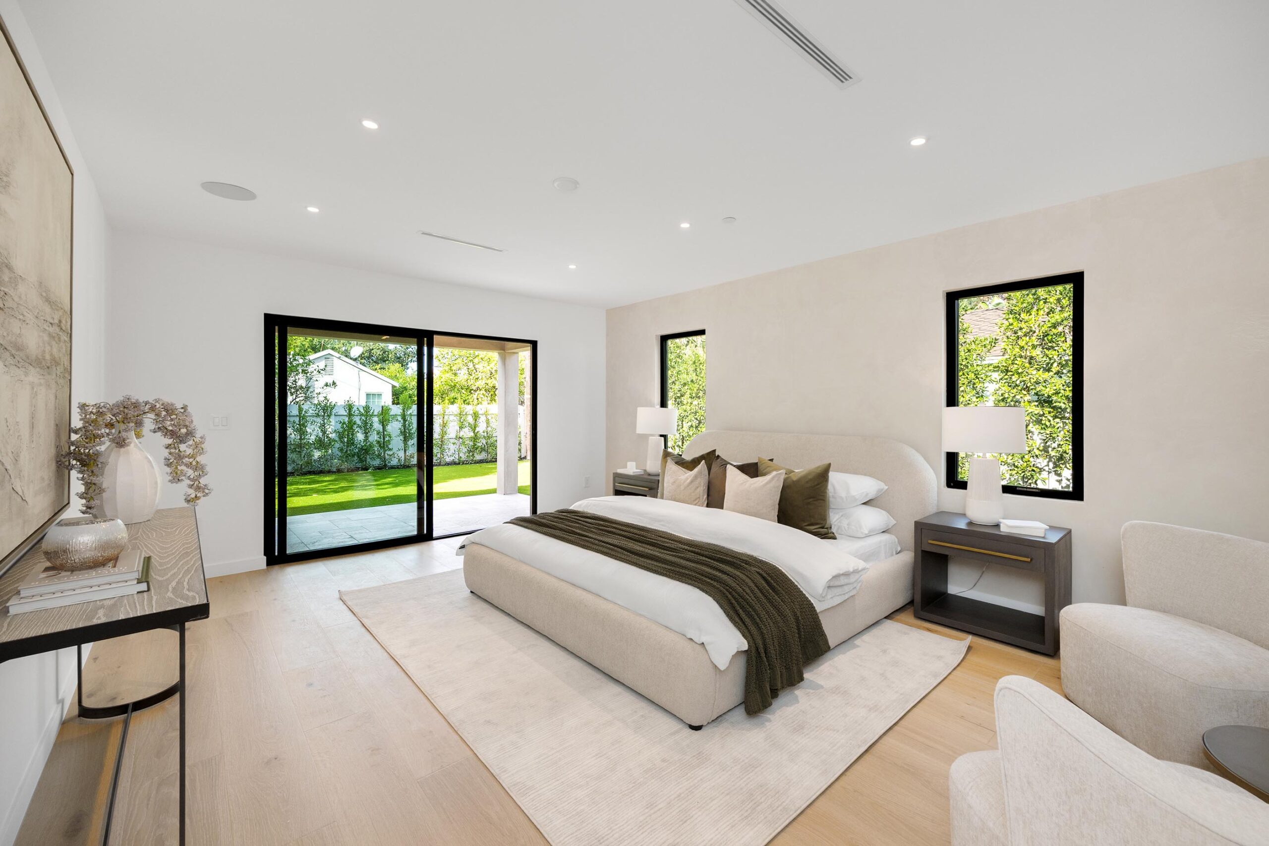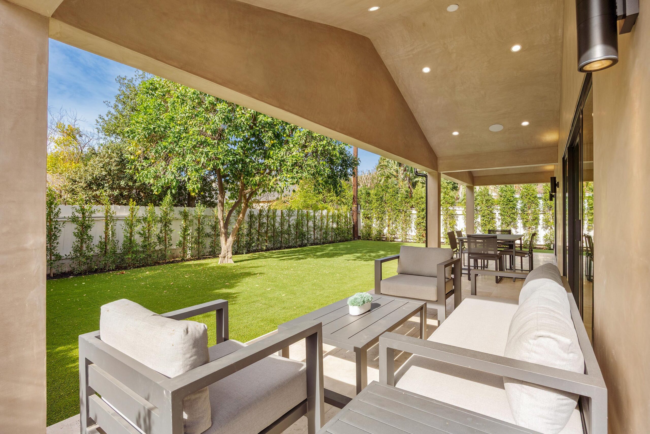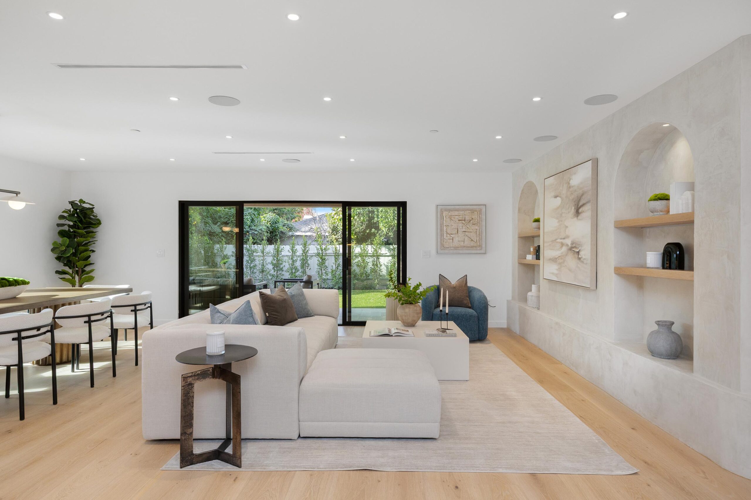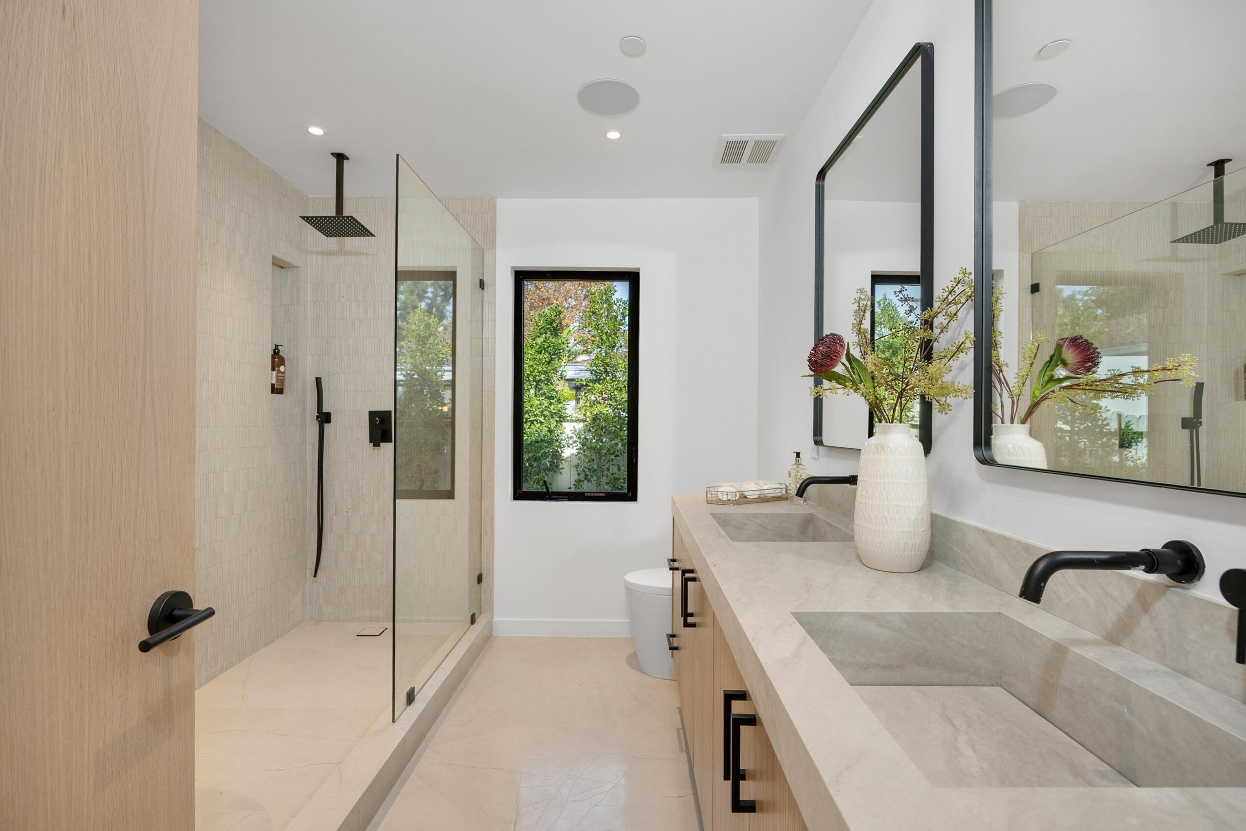 Located in a highly desirable pocket of Sherman Oaks, this beautifully reimagined single-level residence blends refined design with effortless livability. Offering three bedrooms and three and a half bathrooms, the home unfolds across a generous open floor plan ideal for both everyday comfort and elevated entertaining. Upon entry, oak hardwood floors, abundant natural light, and Marmorino Tintoretto plaster walls create an immediate sense of warmth and sophistication. At the heart of the home, the gourmet kitchen is a true showpiece, featuring premium Thermador appliances, porcelain countertops, sleek light-toned cabinetry, and an oversized island with bar seating, perfect for casual meals or gathering with guests. The kitchen flows seamlessly into the living and dining areas, where expansive sliding glass doors invite the outdoors in and open to the backyard retreat. Just off the kitchen, a stylish powder bath with a natural silver travertine vanity adds convenience for hosting.The main hallway leads to a serene primary suite, complete with a spacious walk-in closet, direct backyard access, and a spa-inspired ensuite bath featuring a floating double vanity, a large step-in shower with built-in bench, and a soaking tub. Two additional bedrooms near the entry each offer their own ensuite baths with stone-topped floating vanities and luxe step-in showers. A thoughtfully designed laundry area with additional storage completes the interior. Designed for year-round enjoyment, the lush backyard captures the essence of California living with a covered patio, a charming lemon tree, and ample space for entertaining under the stars. Ideally located moments from Westfield Fashion Square and the renowned shops and restaurants of Ventura Boulevard, this home seamlessly blends contemporary luxury with everyday convenience.