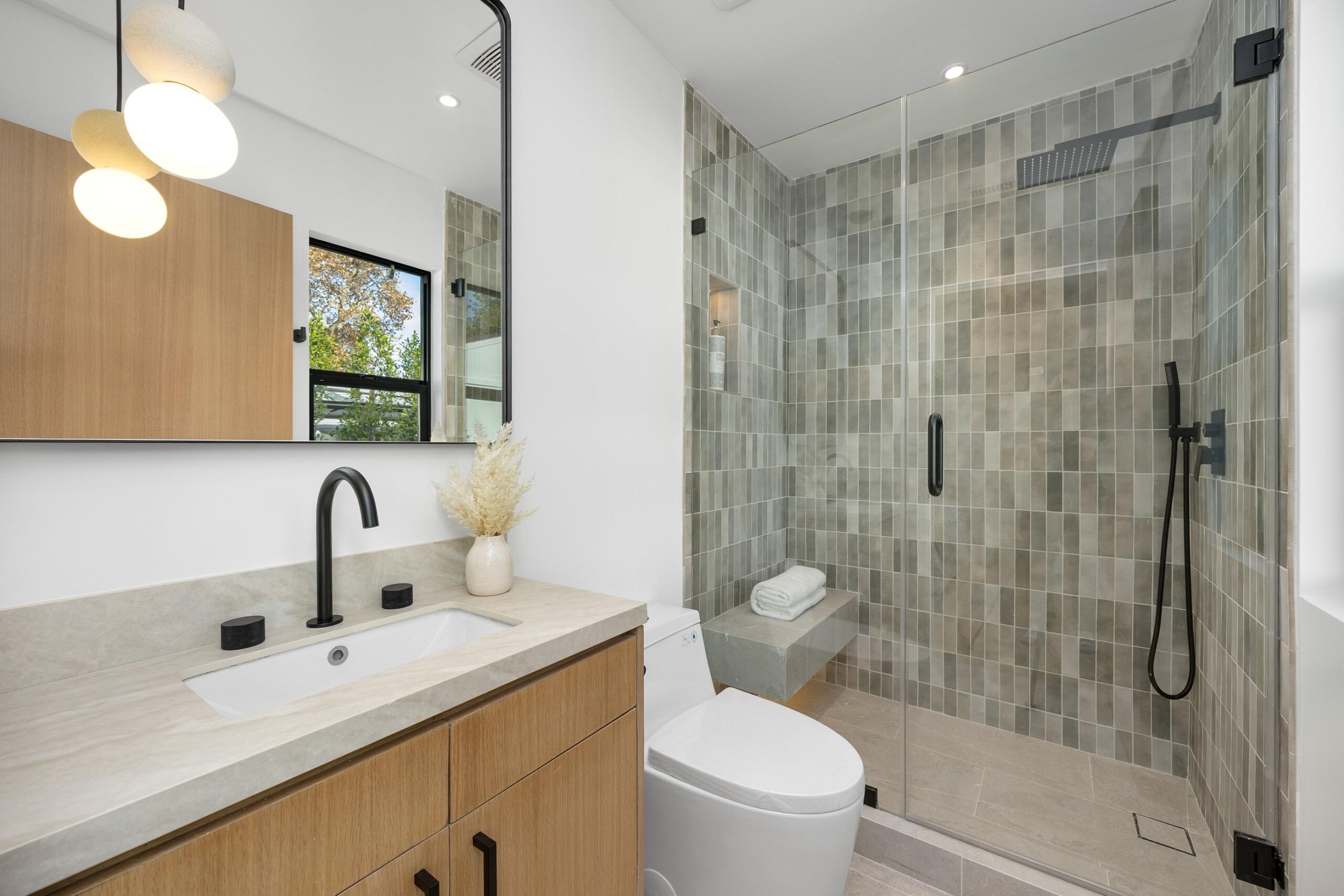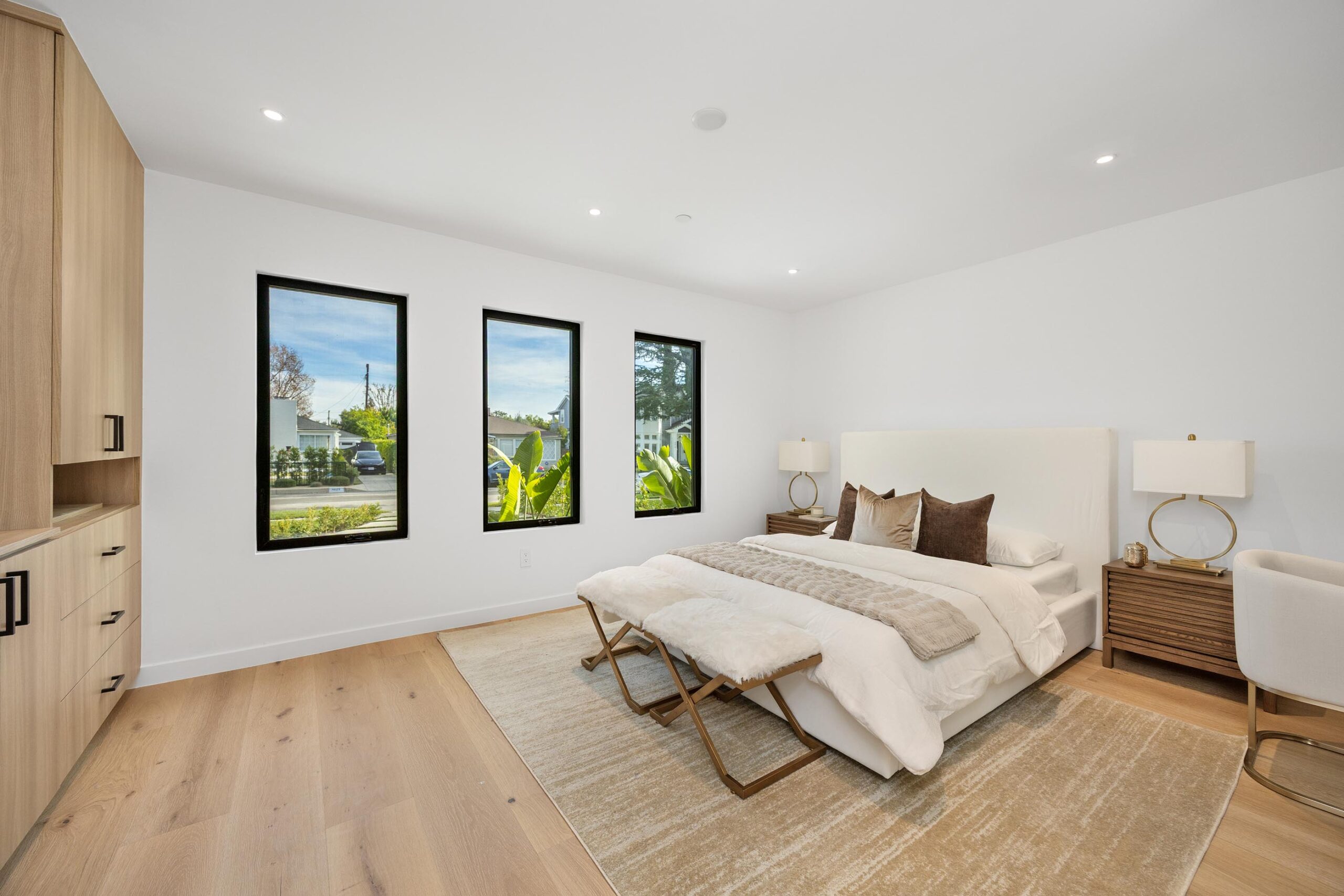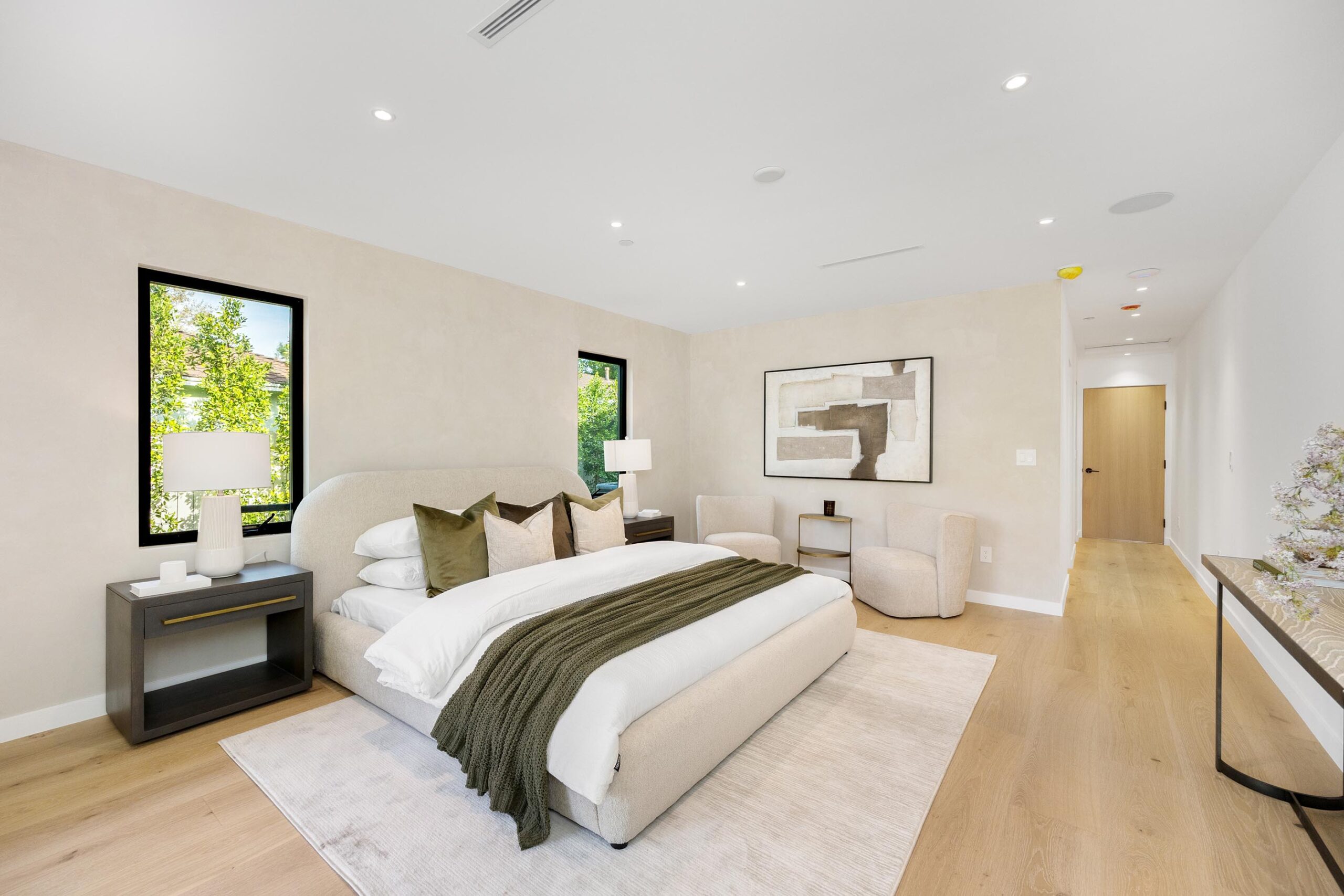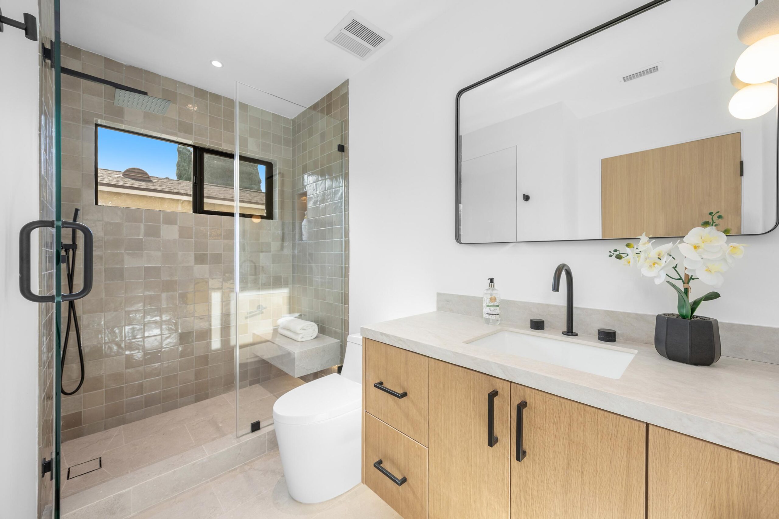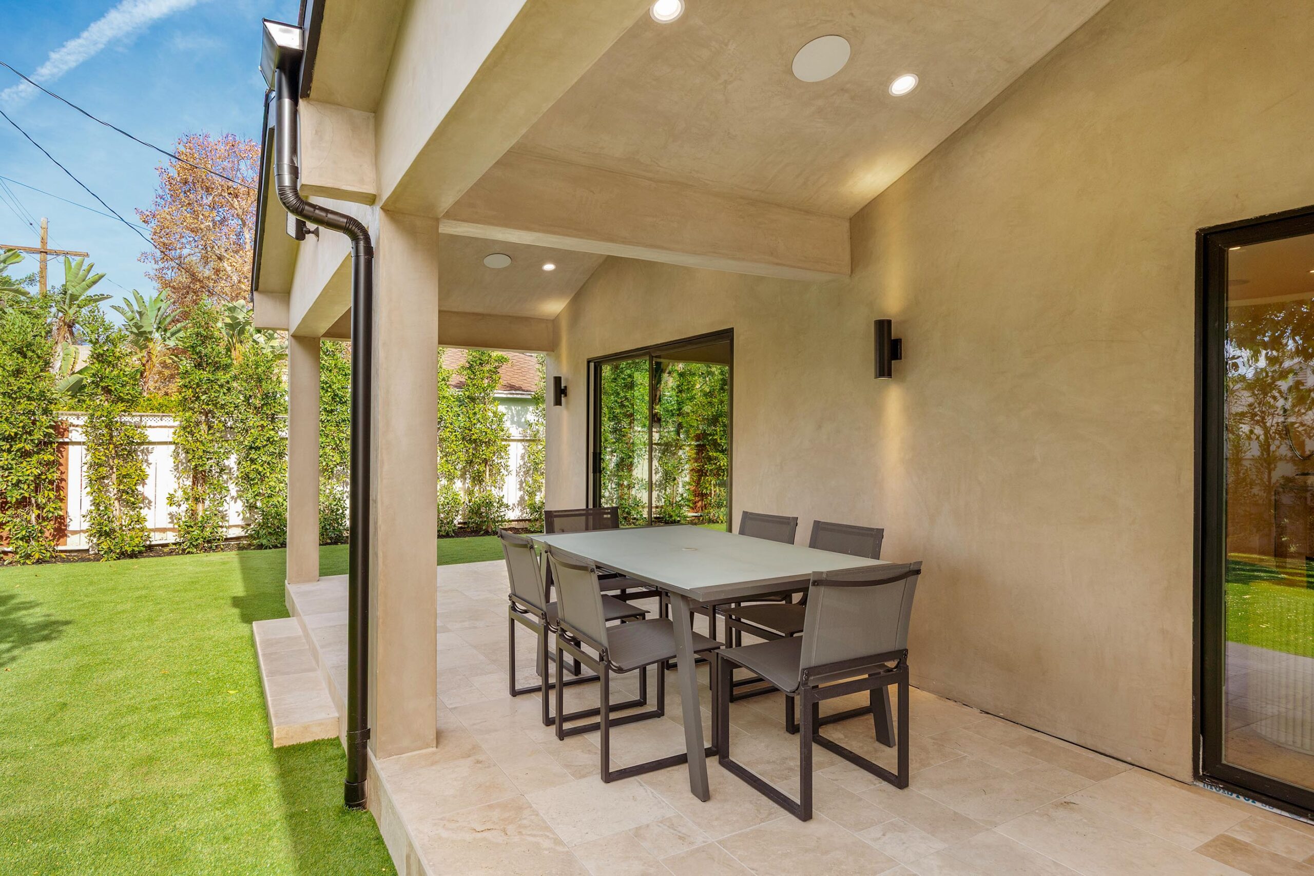 Located in a highly desirable pocket of Sherman Oaks, this beautifully reimagined single-level residence blends refined design with effortless livability. Offering three bedrooms and three and a half bathrooms, the home unfolds across a generous open floor plan ideal for both everyday comfort and elevated entertaining. Upon entry, oak hardwood floors, abundant natural light, and Marmorino Tintoretto plaster walls create an immediate sense of warmth and sophistication. At the heart of the home, the gourmet kitchen is a true showpiece, featuring premium Thermador appliances, porcelain countertops, sleek light-toned cabinetry, and an oversized island with bar seating, perfect for casual meals or gathering with guests. The kitchen flows seamlessly into the living and dining areas, where expansive sliding glass doors invite the outdoors in and open to the backyard retreat. Just off the kitchen, a stylish powder bath with a natural silver travertine vanity adds convenience for hosting.The main hallway leads to a serene primary suite, complete with a spacious walk-in closet, direct backyard access, and a spa-inspired ensuite bath featuring a floating double vanity, a large step-in shower with built-in bench, and a soaking tub. Two additional bedrooms near the entry each offer their own ensuite baths with stone-topped floating vanities and luxe step-in showers. A thoughtfully designed laundry area with additional storage completes the interior. Designed for year-round enjoyment, the lush backyard captures the essence of California living with a covered patio, a charming lemon tree, and ample space for entertaining under the stars. Ideally located moments from Westfield Fashion Square and the renowned shops and restaurants of Ventura Boulevard, this home seamlessly blends contemporary luxury with everyday convenience.