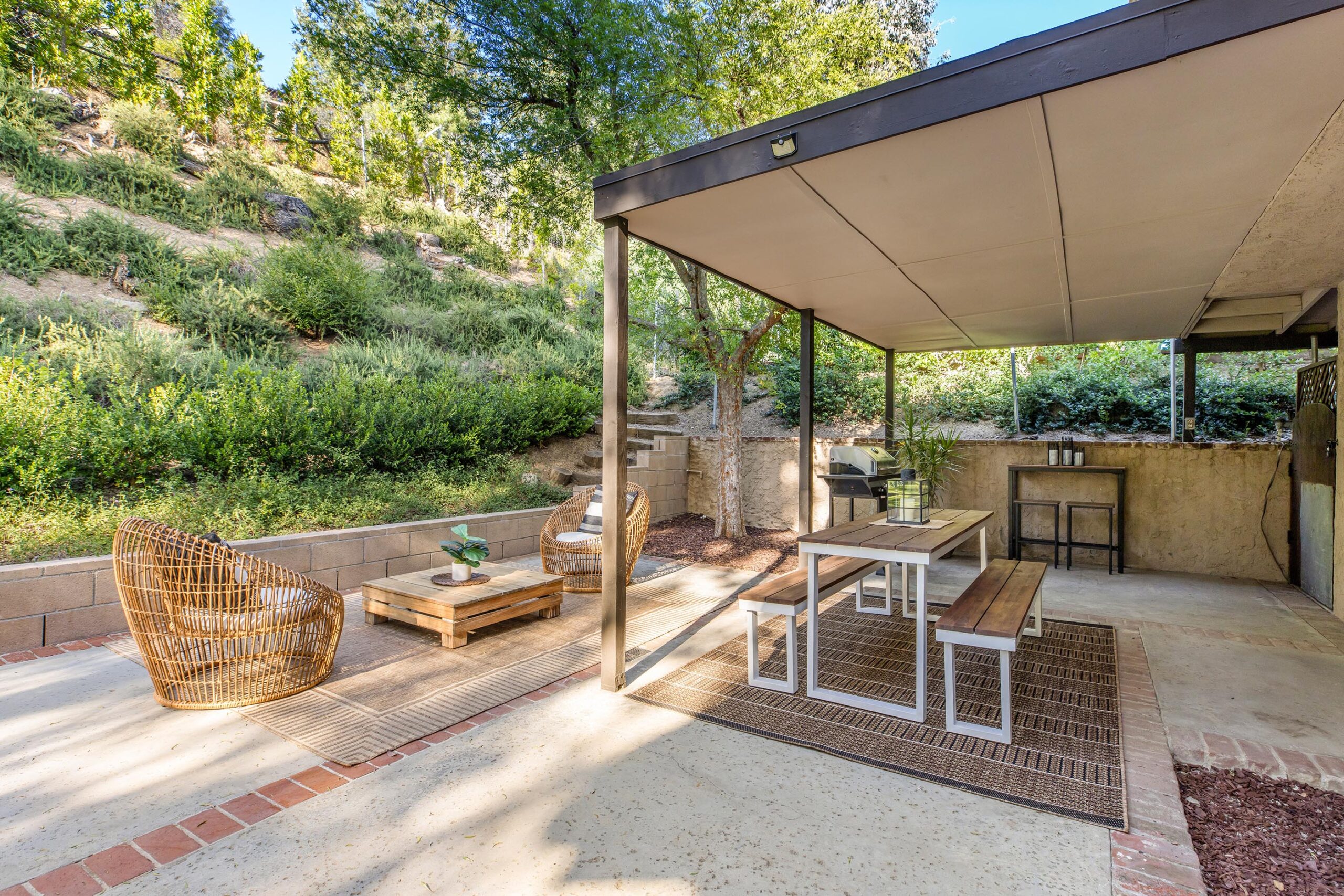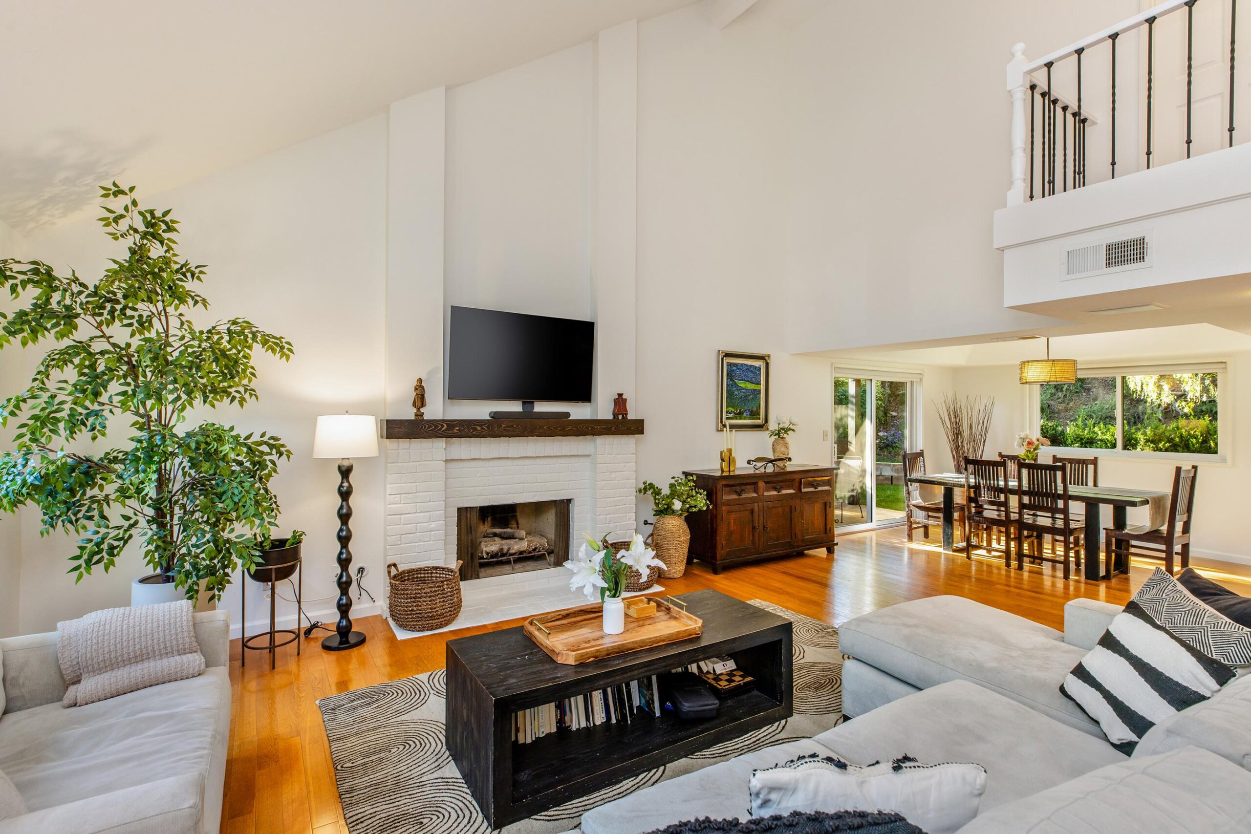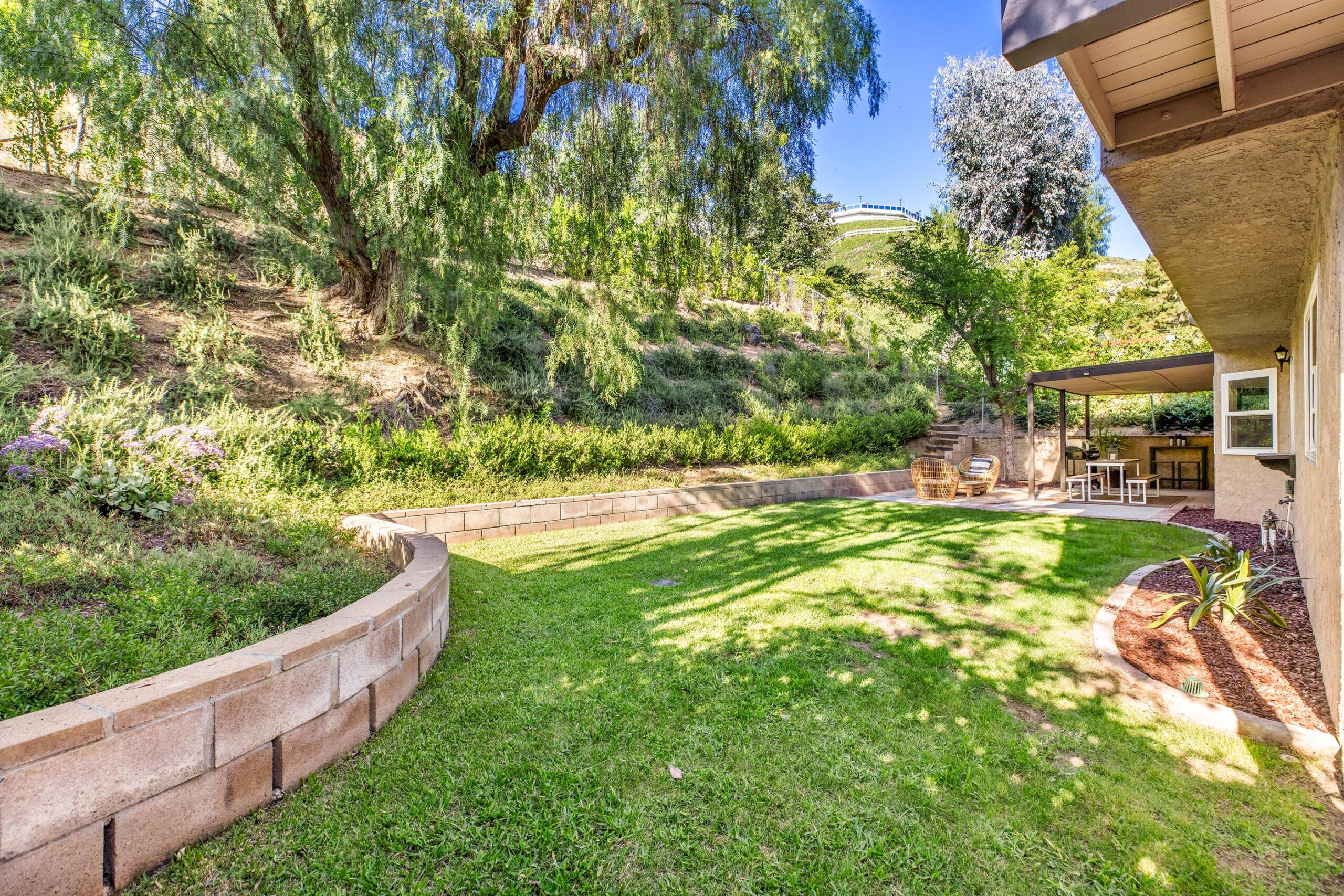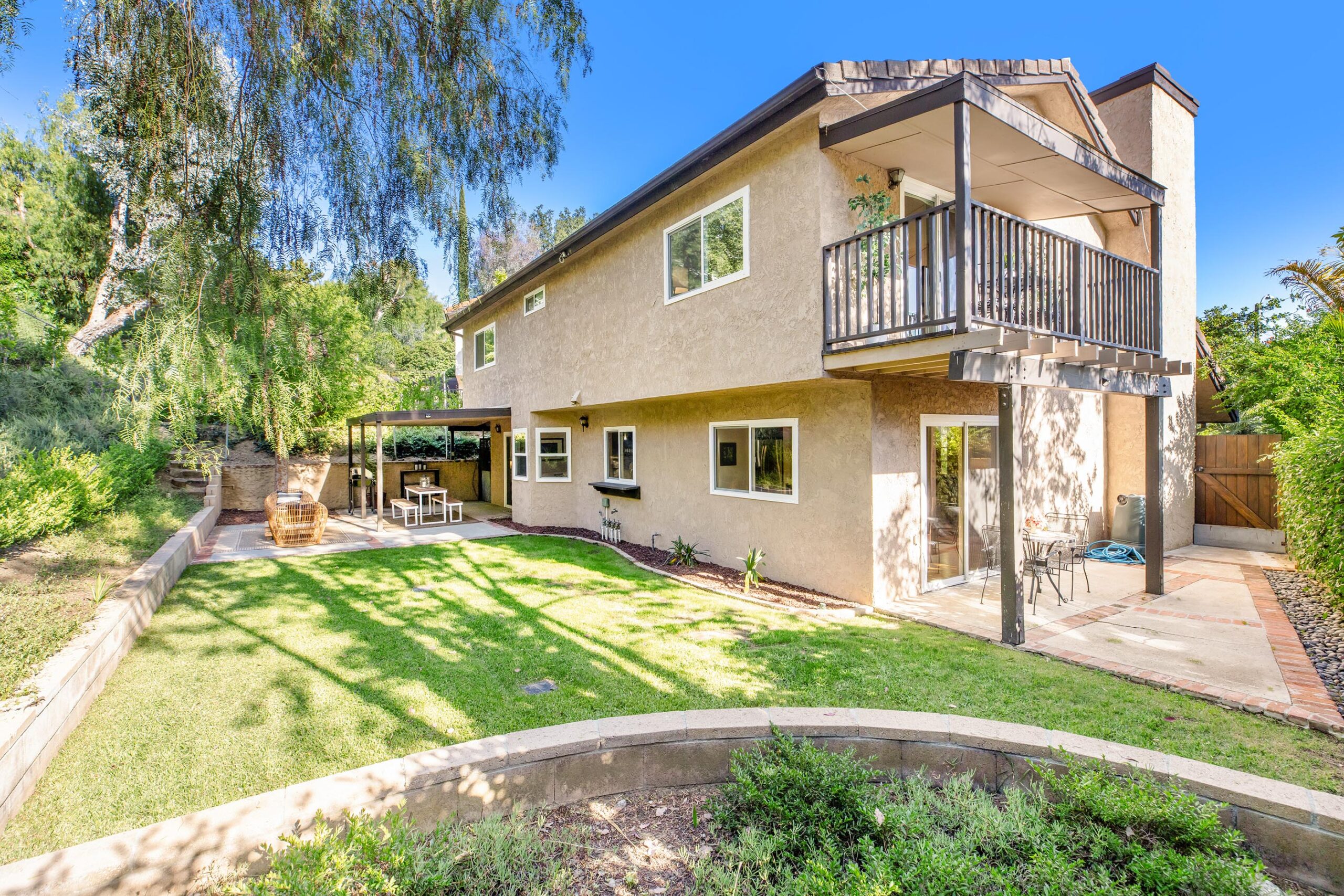Set on a peaceful cul-de-sac in the hills of Burbank, this recently remodeled 4 BD/3 BA home showcases an expansive entertainer's backyard, a thoughtfully designed floor plan, and elegant finishes throughout. Beyond the mature front landscaping, an inviting living room welcomes you with vaulted ceilings, a charming brick fireplace with a wood mantel, and rich wood flooring underfoot. The space flows seamlessly into a formal dining room highlighted by a tray ceiling and sliding glass doors that open to a side patio, perfect for effortless indoor-outdoor living. Just beyond, the bright kitchen offers abundant cabinetry, sparkling countertops, stainless steel appliances, and bar seating. Ideal for both quiet mornings and lively gatherings, it connects to an additional living area with a breakfast nook and sliding glass doors leading to a covered patio. A main-level bedroom, well-suited for an office or guest suite, and a sleek bathroom with a step-in shower complete the first floor. Upstairs, three bedrooms await, including a stunning primary suite featuring lofted ceilings, a walk-in closet with built-ins, and a private balcony with treetop and city views. The ensuite bath includes a dual vanity, generous storage, and a step-in shower with a bench. Two additional bedrooms offer ample closet space and share an updated full bath with a shower/tub combination. Outside, the private backyard feels like a retreat, with a secluded hillside backdrop, expansive lawn, multiple covered patios, and numerous areas for relaxing or entertaining. Additional highlights include a dedicated laundry room with side-by-side washer and dryer and a two-car garage with direct access to the kitchen. Located near award-winning schools, the Burbank Empire Center, and the shops and dining of Downtown Burbank, this meticulously maintained home offers comfort, style, and convenience in one exceptional setting.