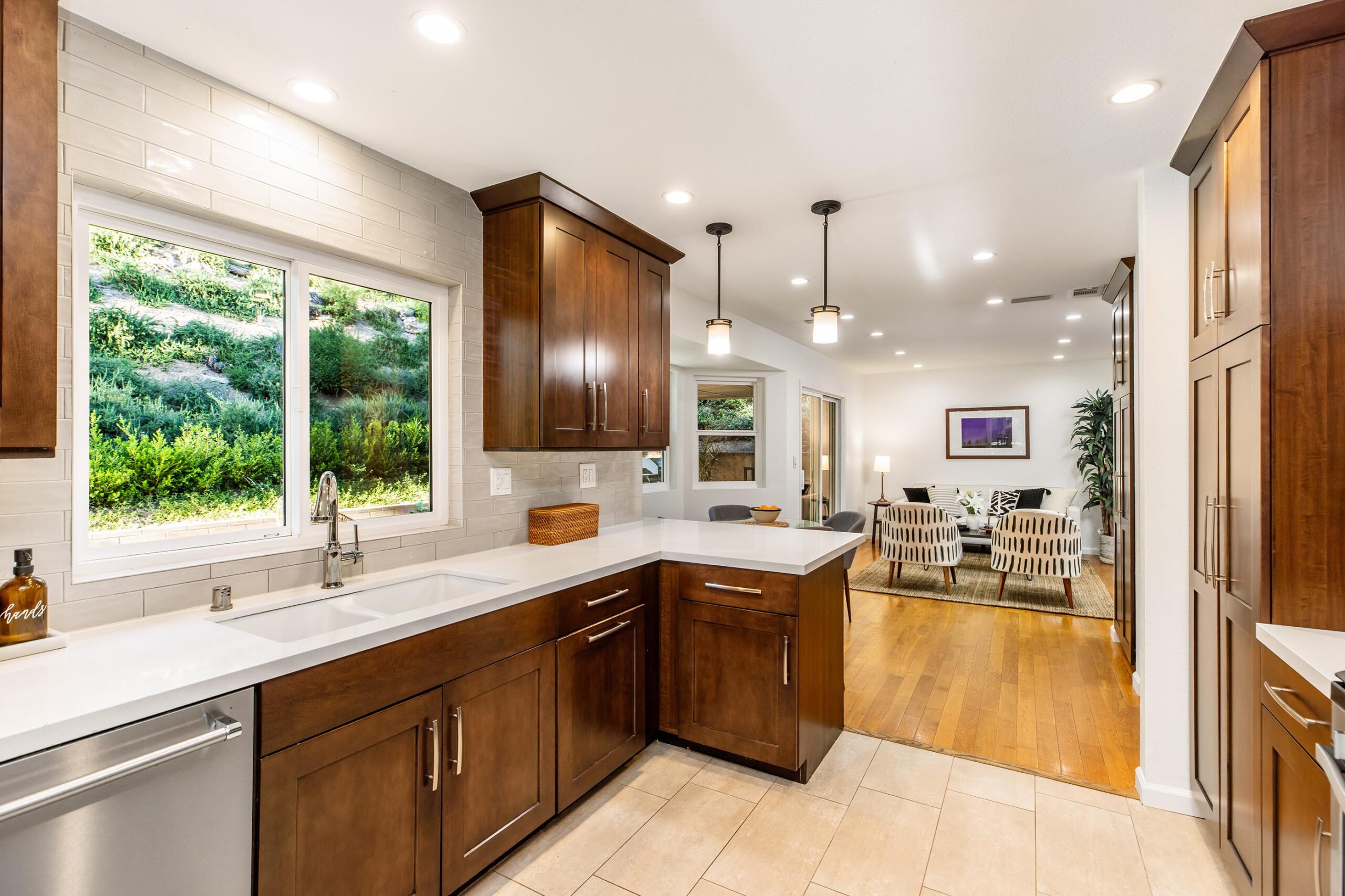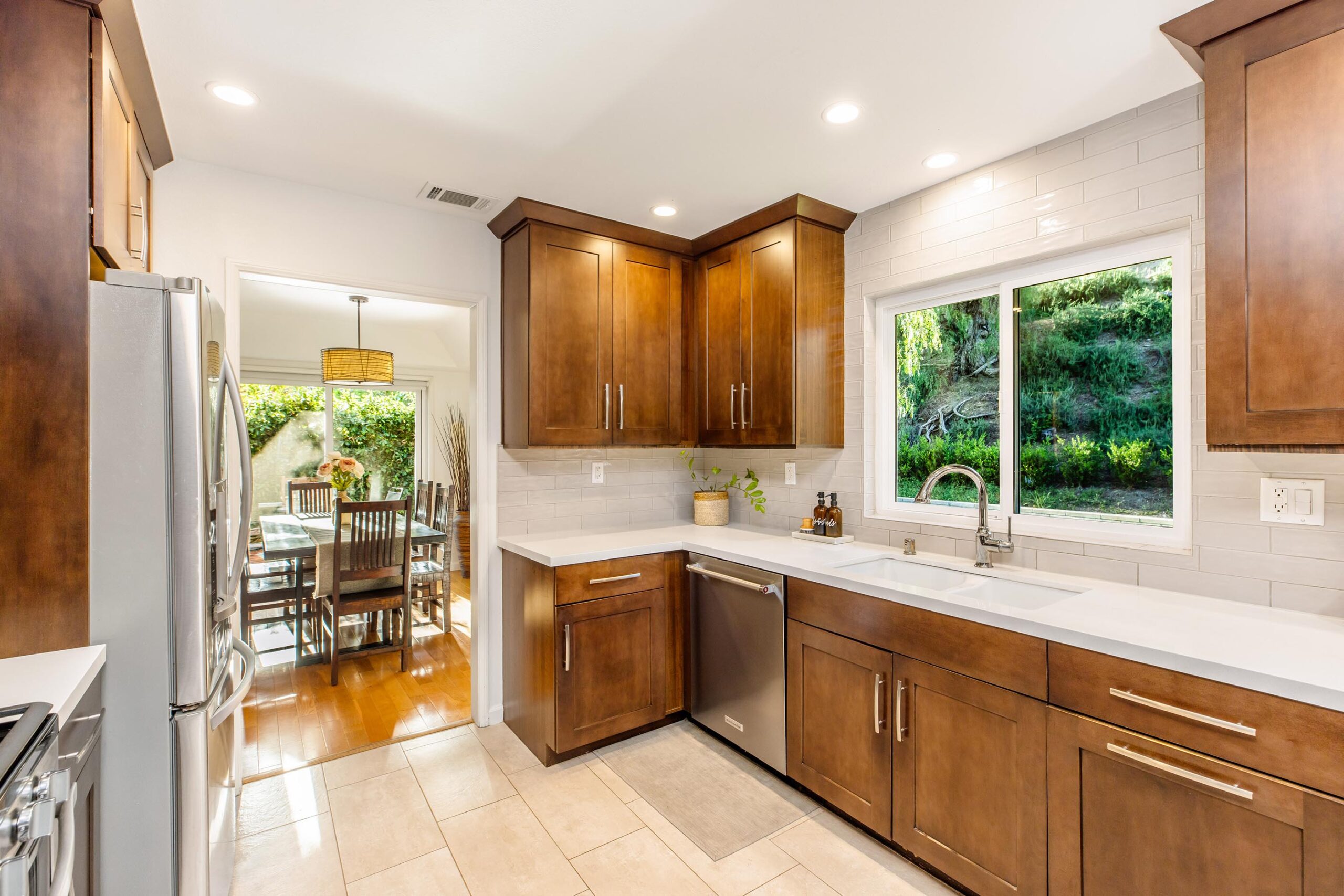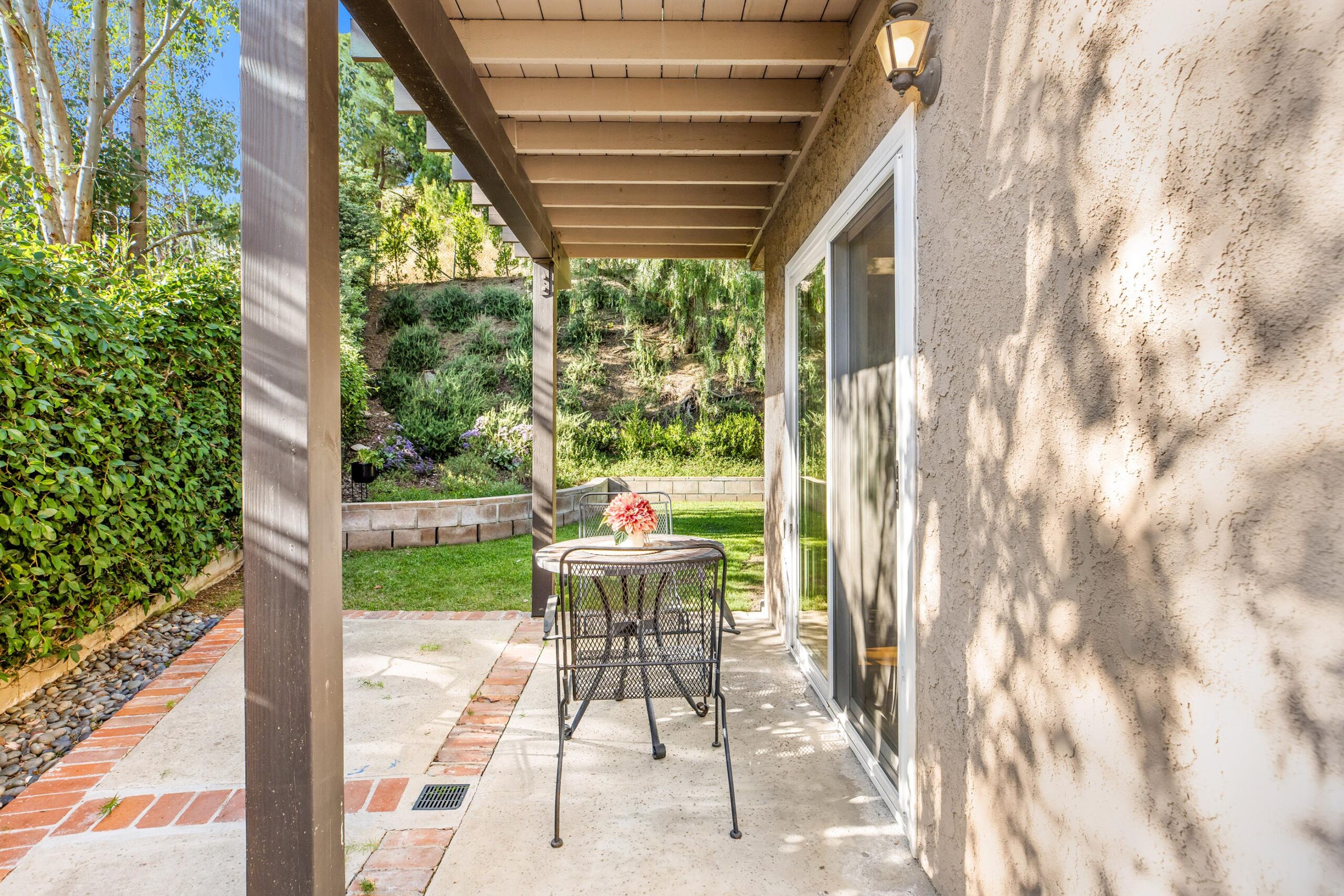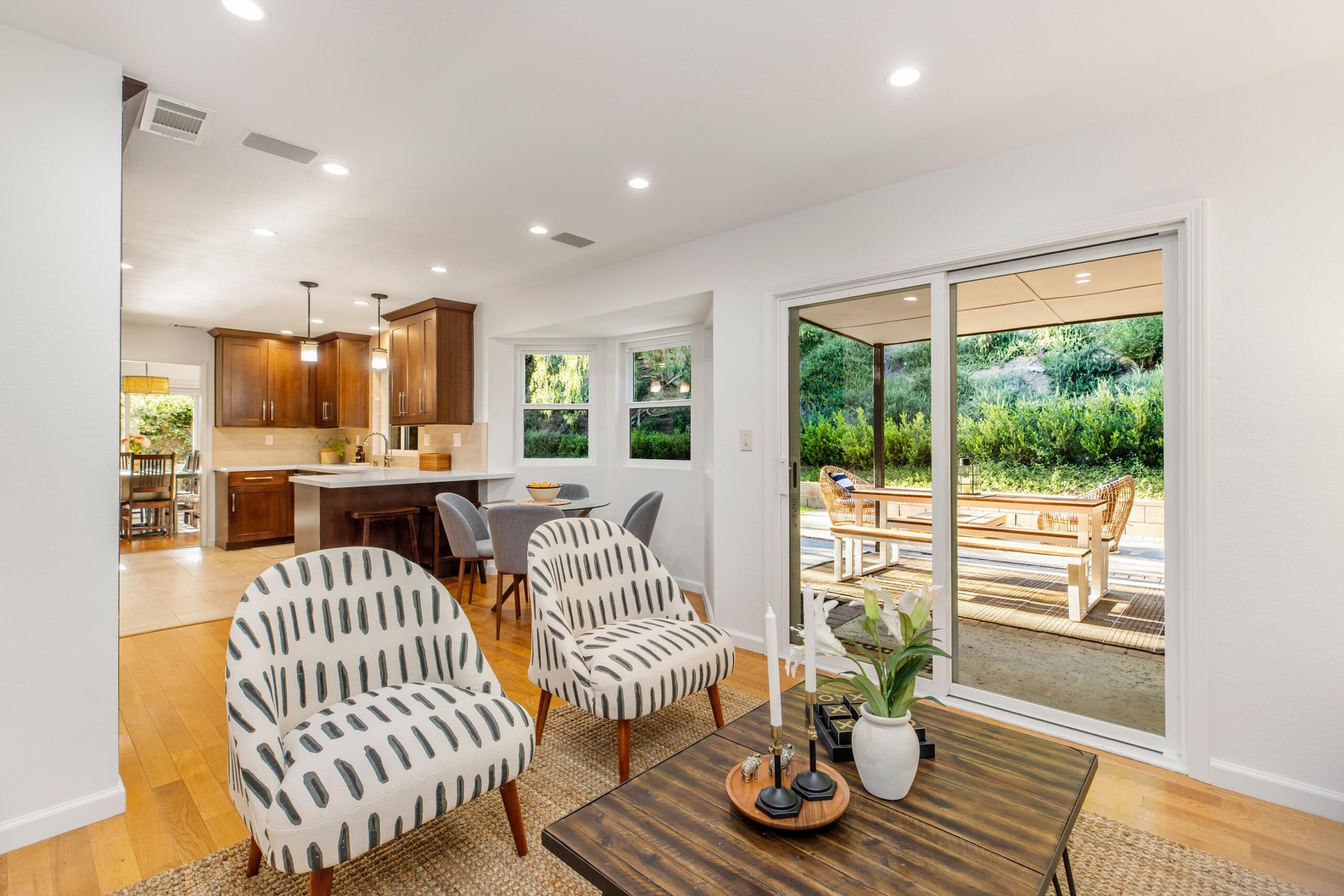 Set on a peaceful cul-de-sac in the hills of Burbank, this recently remodeled 4 BD/3 BA home showcases an expansive entertainer's backyard, a thoughtfully designed floor plan, and elegant finishes throughout. Beyond the mature front landscaping, an inviting living room welcomes you with vaulted ceilings, a charming brick fireplace with a wood mantel, and rich wood flooring underfoot. The space flows seamlessly into a formal dining room highlighted by a tray ceiling and sliding glass doors that open to a side patio, perfect for effortless indoor-outdoor living. Just beyond, the bright kitchen offers abundant cabinetry, sparkling countertops, stainless steel appliances, and bar seating. Ideal for both quiet mornings and lively gatherings, it connects to an additional living area with a breakfast nook and sliding glass doors leading to a covered patio. A main-level bedroom, well-suited for an office or guest suite, and a sleek bathroom with a step-in shower complete the first floor. Upstairs, three bedrooms await, including a stunning primary suite featuring lofted ceilings, a walk-in closet with built-ins, and a private balcony with treetop and city views. The ensuite bath includes a dual vanity, generous storage, and a step-in shower with a bench. Two additional bedrooms offer ample closet space and share an updated full bath with a shower/tub combination. Outside, the private backyard feels like a retreat, with a secluded hillside backdrop, expansive lawn, multiple covered patios, and numerous areas for relaxing or entertaining. Additional highlights include a dedicated laundry room with side-by-side washer and dryer and a two-car garage with direct access to the kitchen. Located near award-winning schools, the Burbank Empire Center, and the shops and dining of Downtown Burbank, this meticulously maintained home offers comfort, style, and convenience in one exceptional setting.