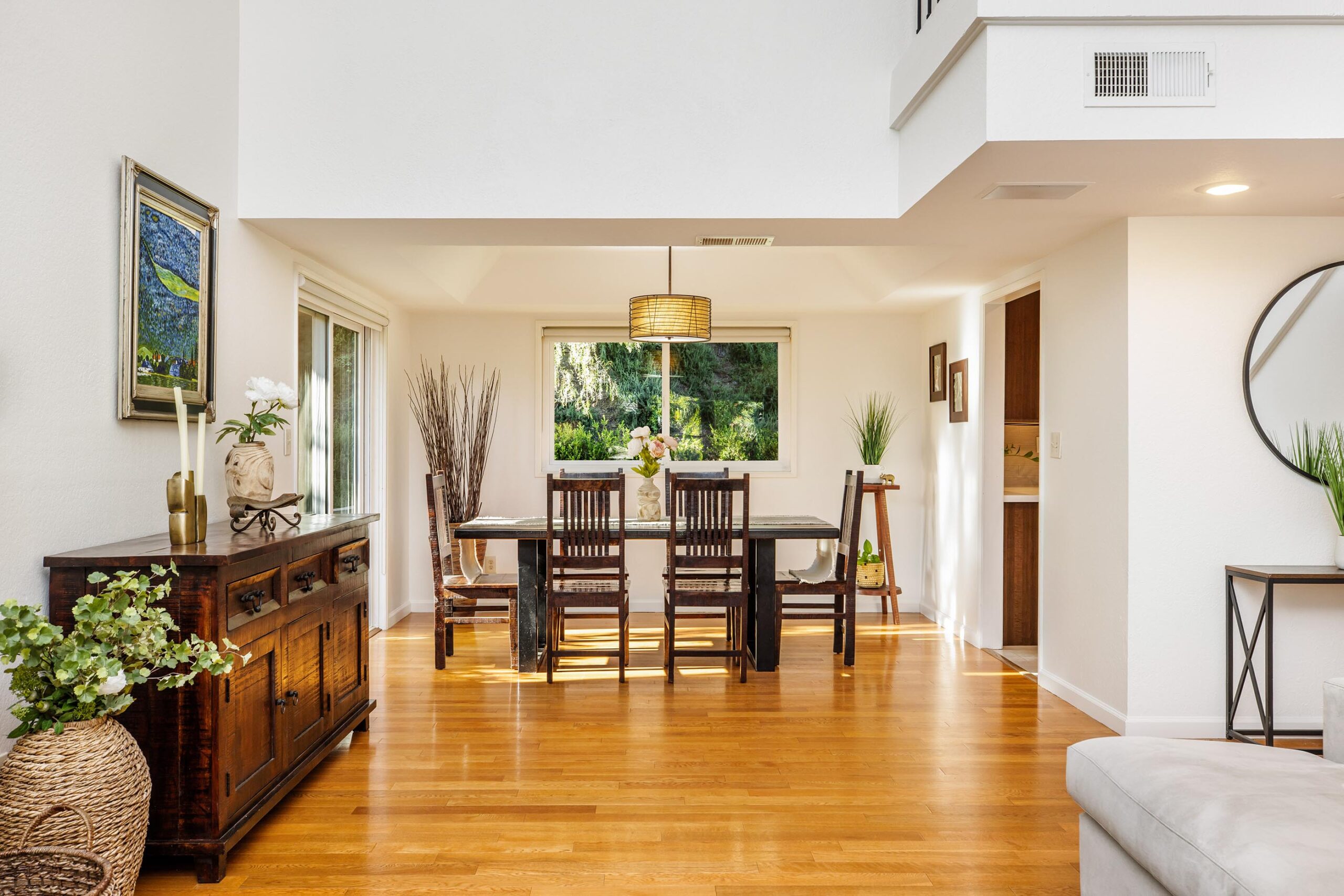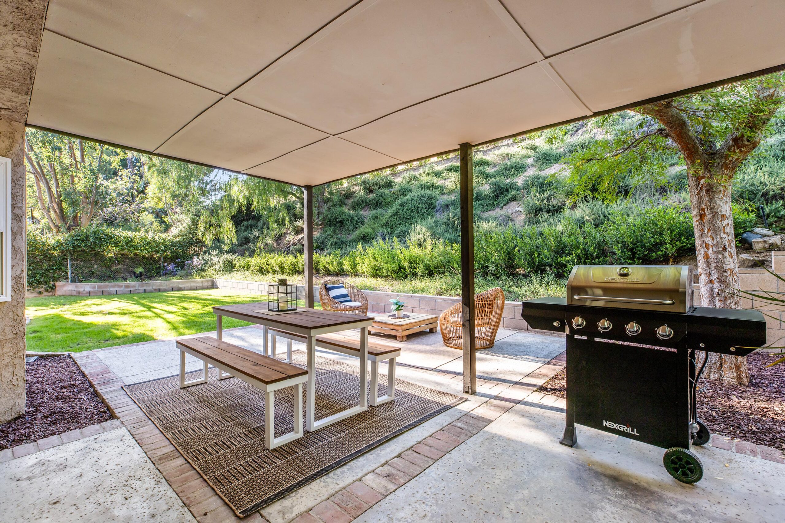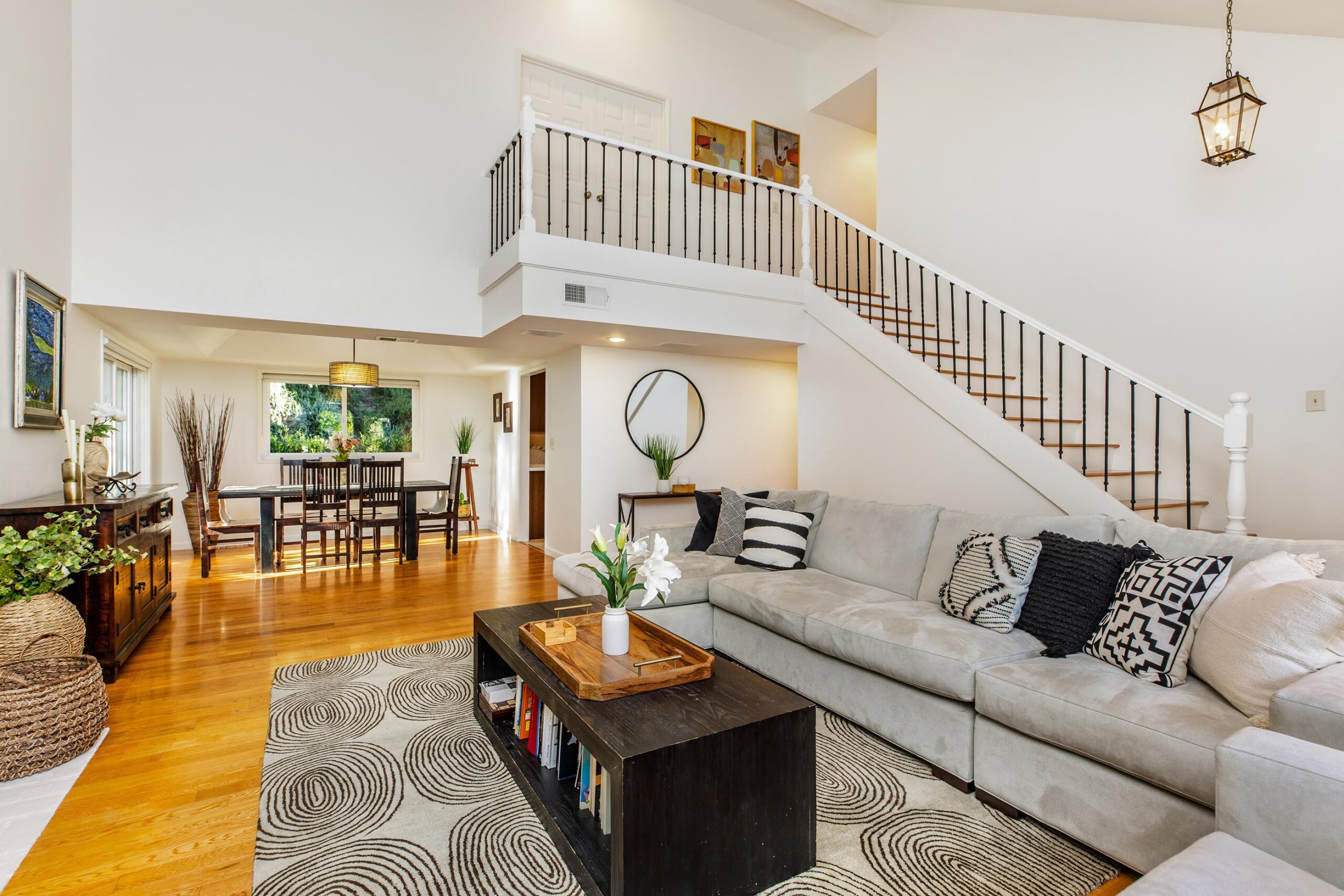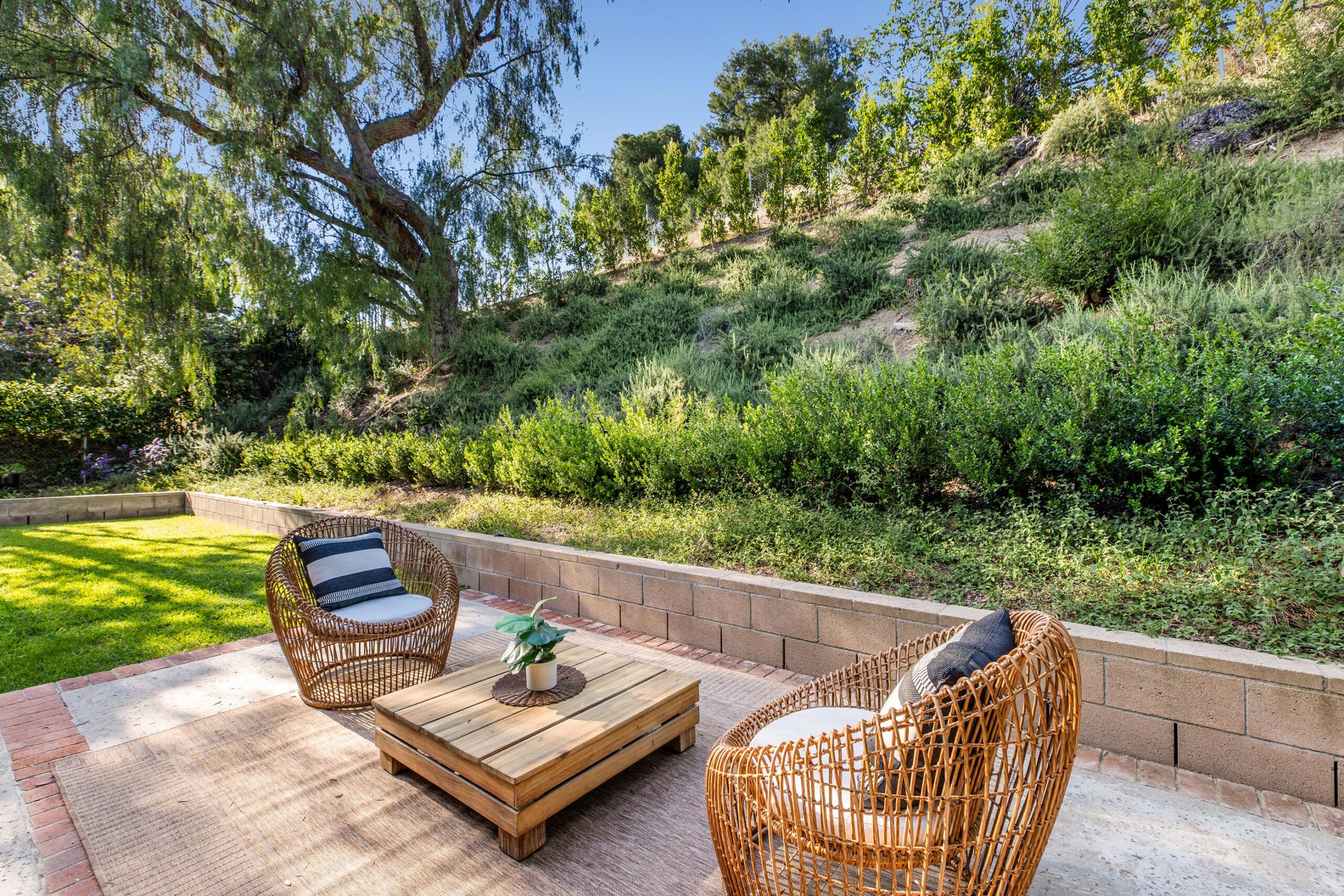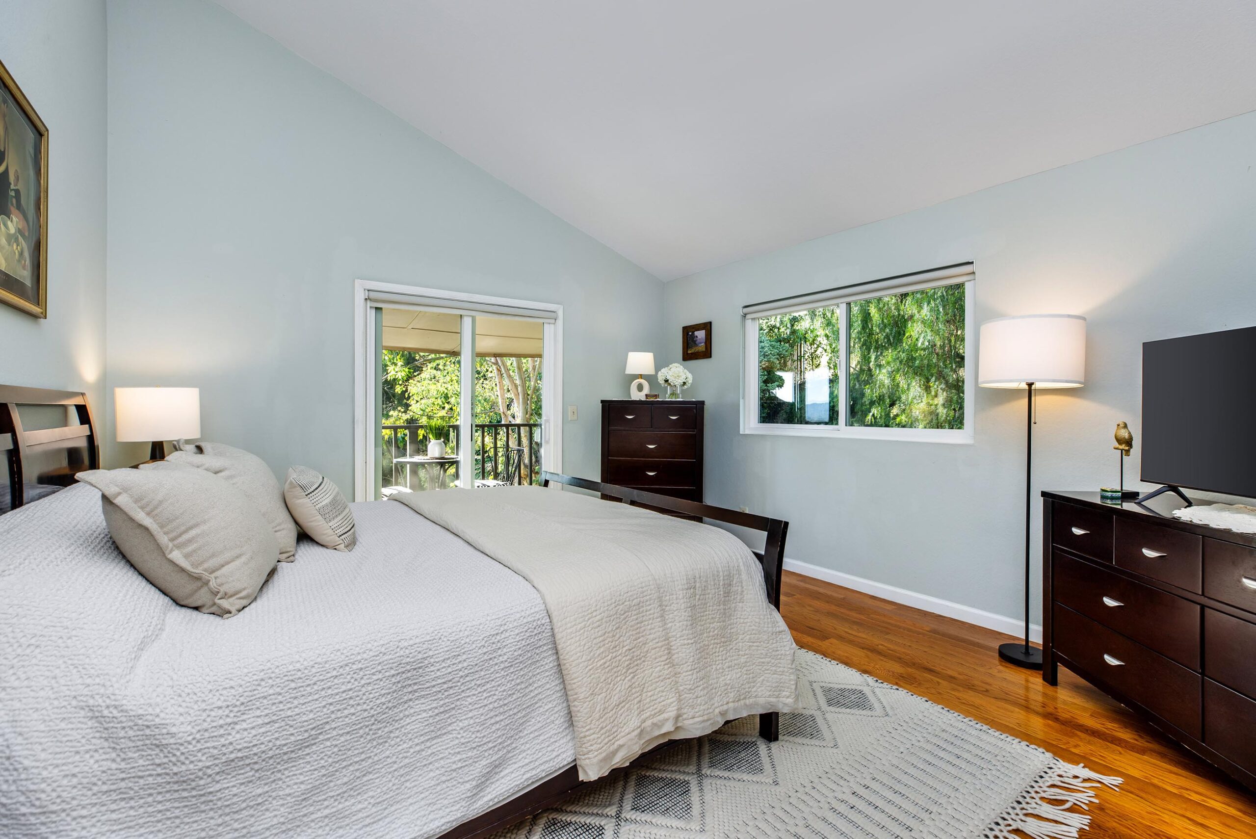 Set on a peaceful cul-de-sac in the hills of Burbank, this recently remodeled 4 BD/3 BA home showcases an expansive entertainer's backyard, a thoughtfully designed floor plan, and elegant finishes throughout. Beyond the mature front landscaping, an inviting living room welcomes you with vaulted ceilings, a charming brick fireplace with a wood mantel, and rich wood flooring underfoot. The space flows seamlessly into a formal dining room highlighted by a tray ceiling and sliding glass doors that open to a side patio, perfect for effortless indoor-outdoor living. Just beyond, the bright kitchen offers abundant cabinetry, sparkling countertops, stainless steel appliances, and bar seating. Ideal for both quiet mornings and lively gatherings, it connects to an additional living area with a breakfast nook and sliding glass doors leading to a covered patio. A main-level bedroom, well-suited for an office or guest suite, and a sleek bathroom with a step-in shower complete the first floor. Upstairs, three bedrooms await, including a stunning primary suite featuring lofted ceilings, a walk-in closet with built-ins, and a private balcony with treetop and city views. The ensuite bath includes a dual vanity, generous storage, and a step-in shower with a bench. Two additional bedrooms offer ample closet space and share an updated full bath with a shower/tub combination. Outside, the private backyard feels like a retreat, with a secluded hillside backdrop, expansive lawn, multiple covered patios, and numerous areas for relaxing or entertaining. Additional highlights include a dedicated laundry room with side-by-side washer and dryer and a two-car garage with direct access to the kitchen. Located near award-winning schools, the Burbank Empire Center, and the shops and dining of Downtown Burbank, this meticulously maintained home offers comfort, style, and convenience in one exceptional setting.