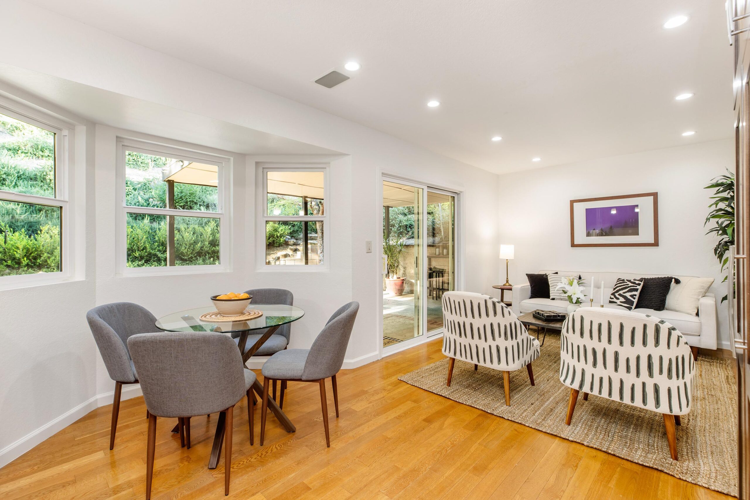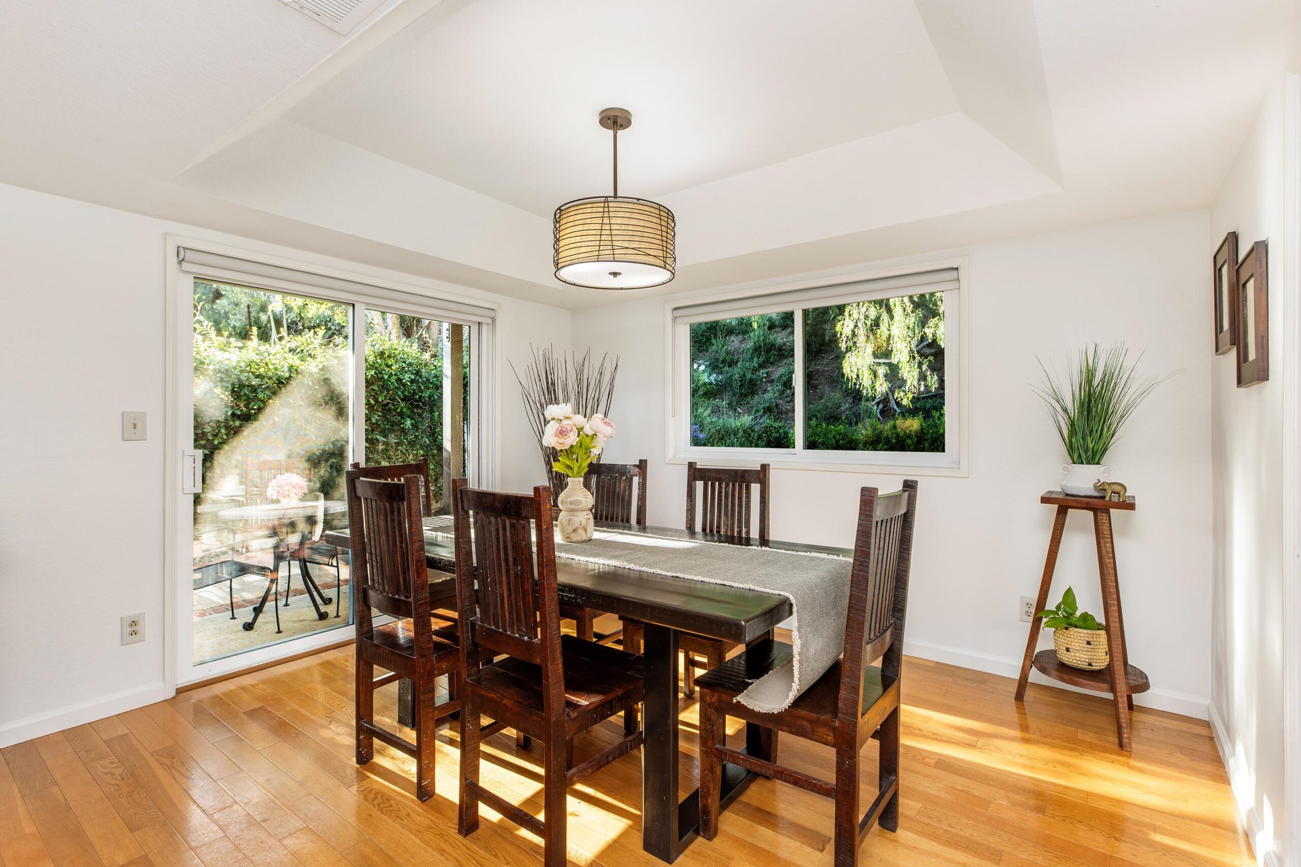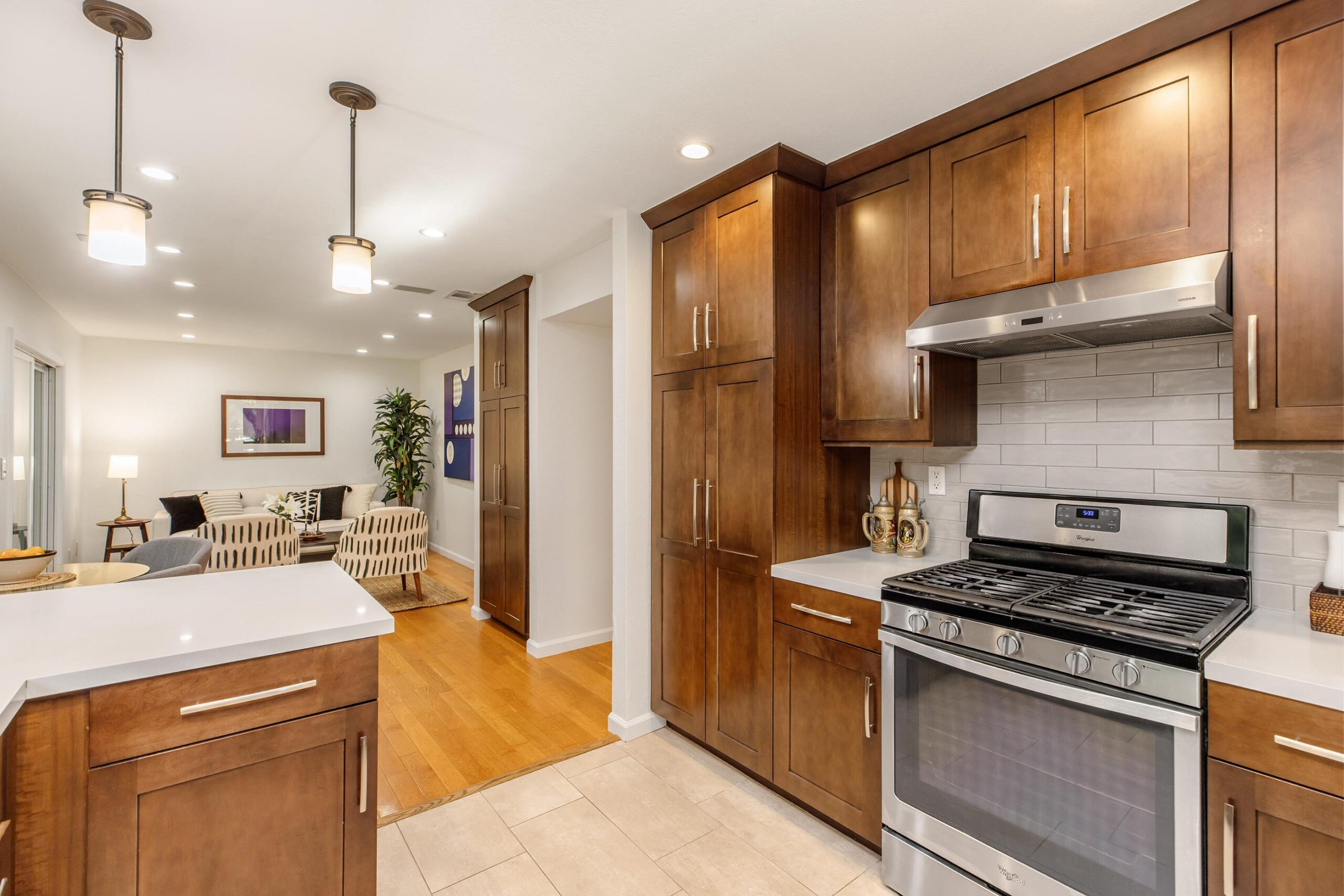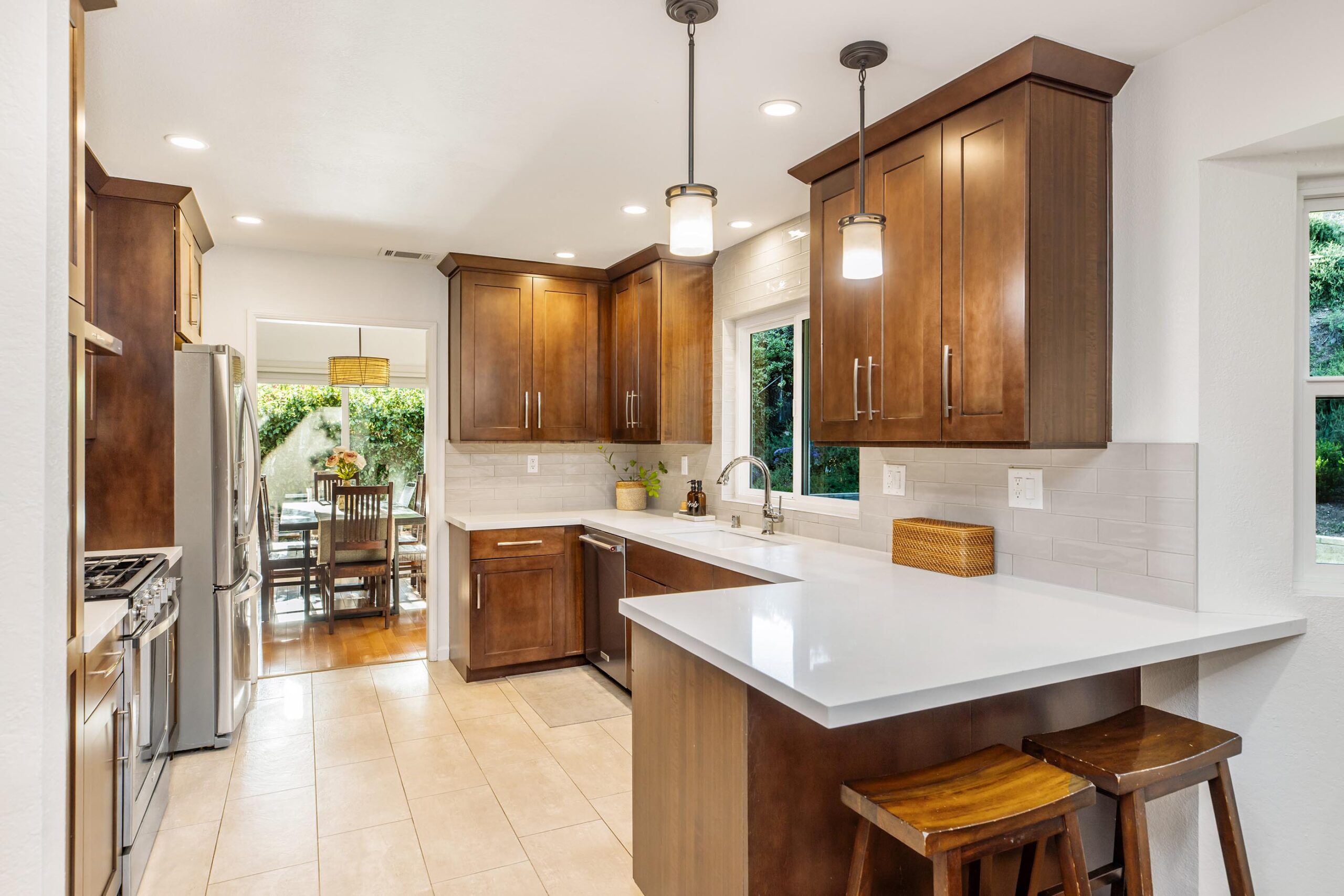 Set on a peaceful cul-de-sac in the hills of Burbank, this recently remodeled 4 BD/3 BA home showcases an expansive entertainer's backyard, a thoughtfully designed floor plan, and elegant finishes throughout. Beyond the mature front landscaping, an inviting living room welcomes you with vaulted ceilings, a charming brick fireplace with a wood mantel, and rich wood flooring underfoot. The space flows seamlessly into a formal dining room highlighted by a tray ceiling and sliding glass doors that open to a side patio, perfect for effortless indoor-outdoor living. Just beyond, the bright kitchen offers abundant cabinetry, sparkling countertops, stainless steel appliances, and bar seating. Ideal for both quiet mornings and lively gatherings, it connects to an additional living area with a breakfast nook and sliding glass doors leading to a covered patio. A main-level bedroom, well-suited for an office or guest suite, and a sleek bathroom with a step-in shower complete the first floor. Upstairs, three bedrooms await, including a stunning primary suite featuring lofted ceilings, a walk-in closet with built-ins, and a private balcony with treetop and city views. The ensuite bath includes a dual vanity, generous storage, and a step-in shower with a bench. Two additional bedrooms offer ample closet space and share an updated full bath with a shower/tub combination. Outside, the private backyard feels like a retreat, with a secluded hillside backdrop, expansive lawn, multiple covered patios, and numerous areas for relaxing or entertaining. Additional highlights include a dedicated laundry room with side-by-side washer and dryer and a two-car garage with direct access to the kitchen. Located near award-winning schools, the Burbank Empire Center, and the shops and dining of Downtown Burbank, this meticulously maintained home offers comfort, style, and convenience in one exceptional setting.